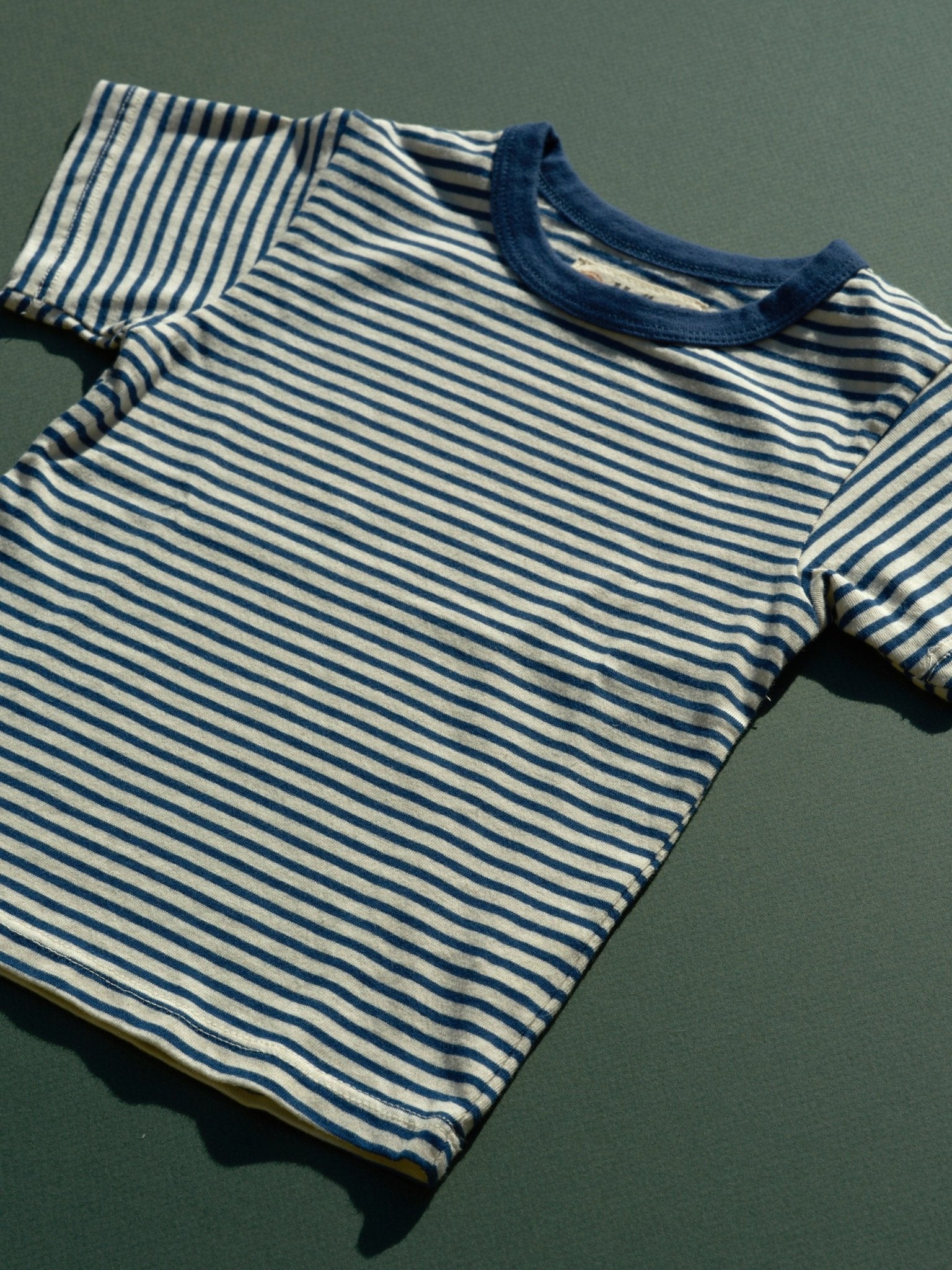Yarn dyed stripes on our heavyweight cotton jersey with a vintage-style neckband. 90's style for the kids.
