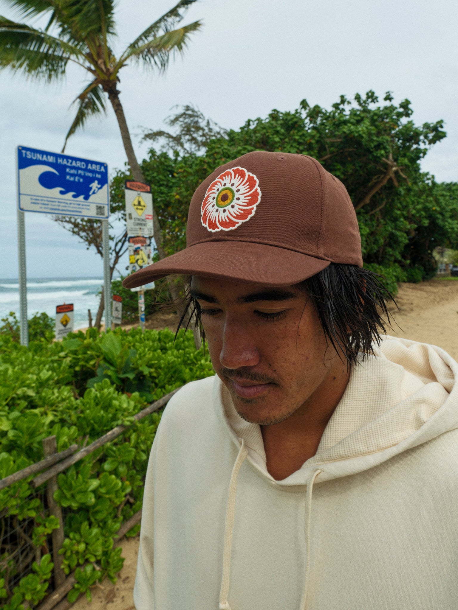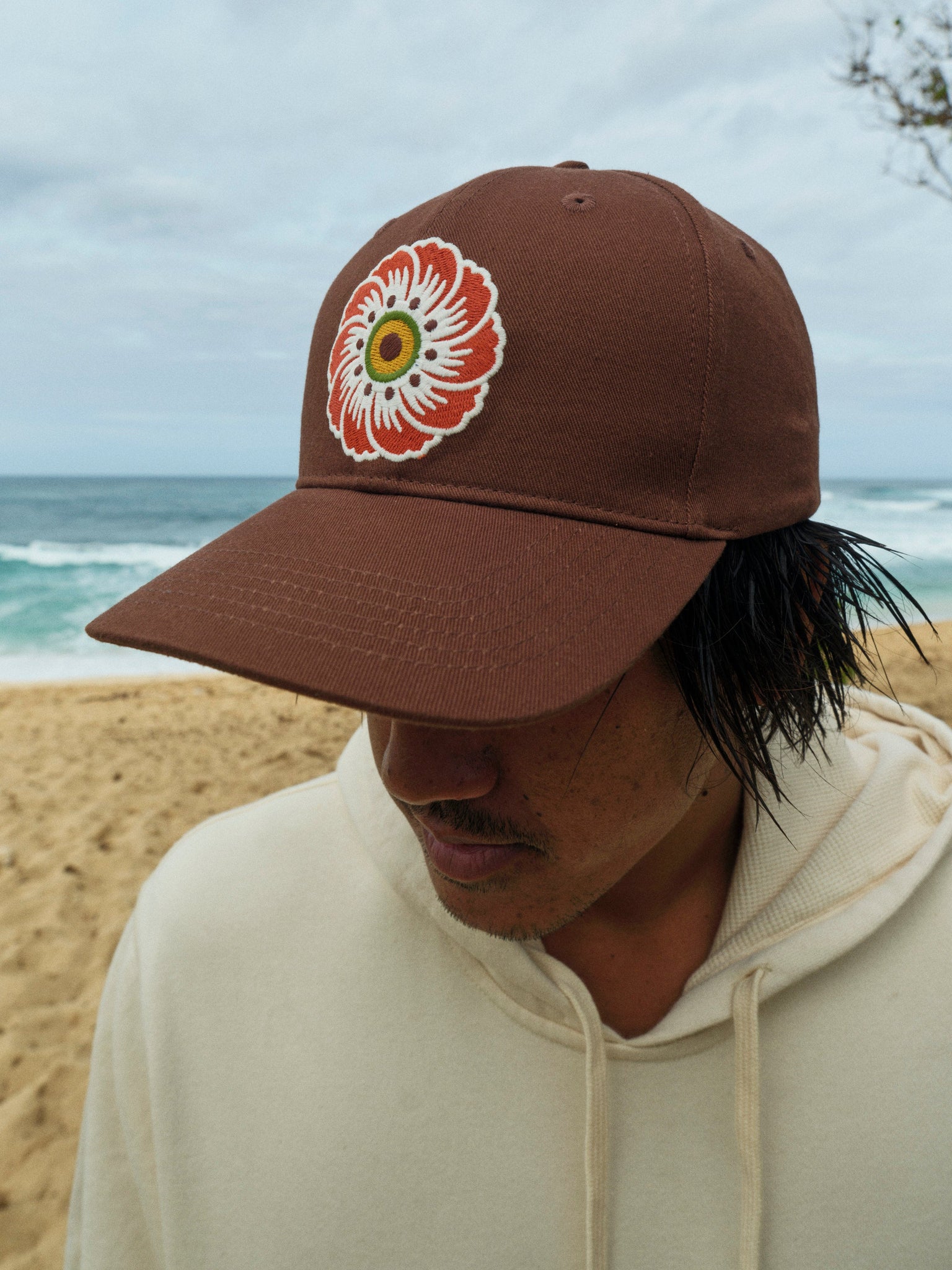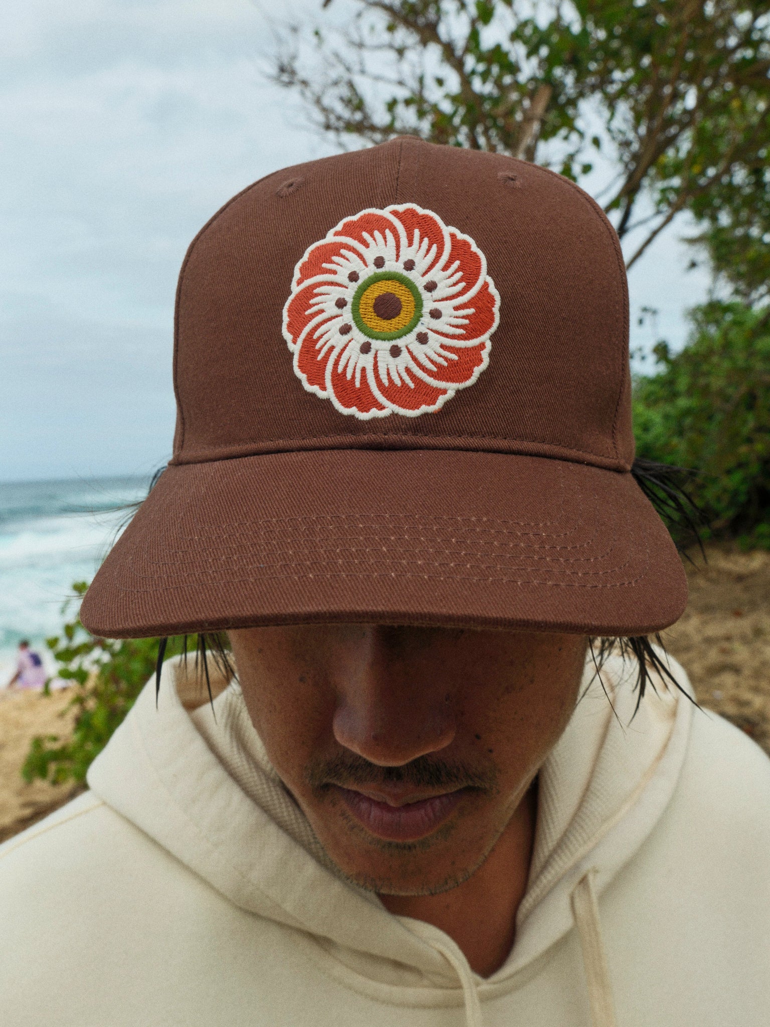 Flower power artwork by Matthew Craven on a structured ball cap to keep the sun out of your eyes.