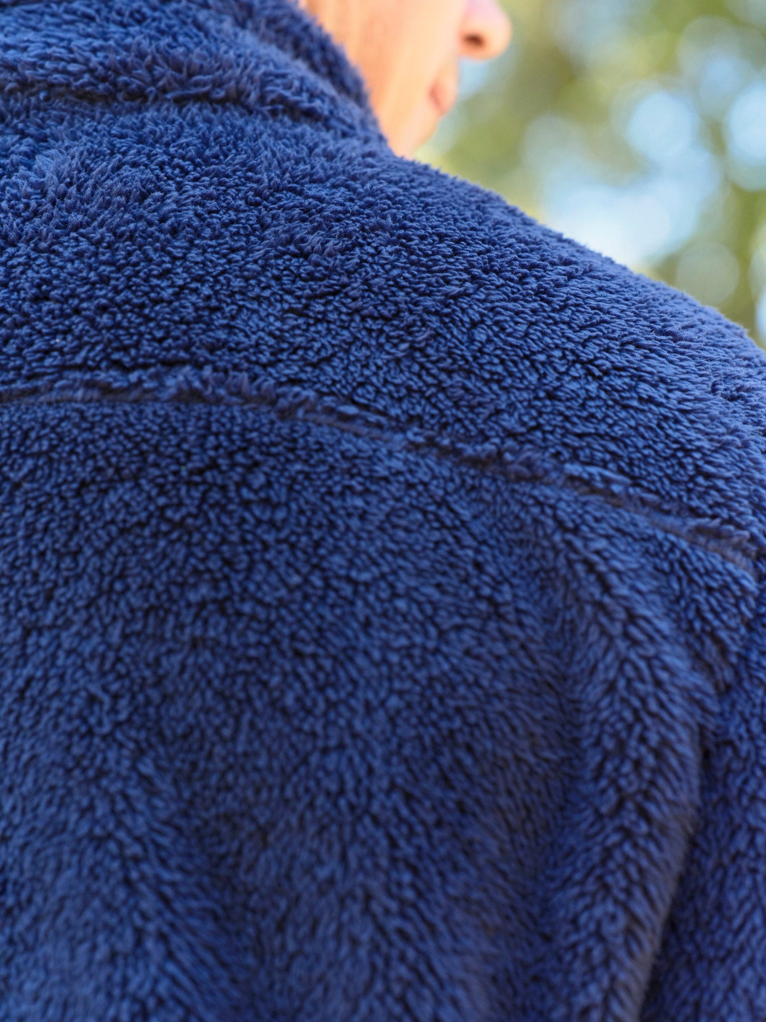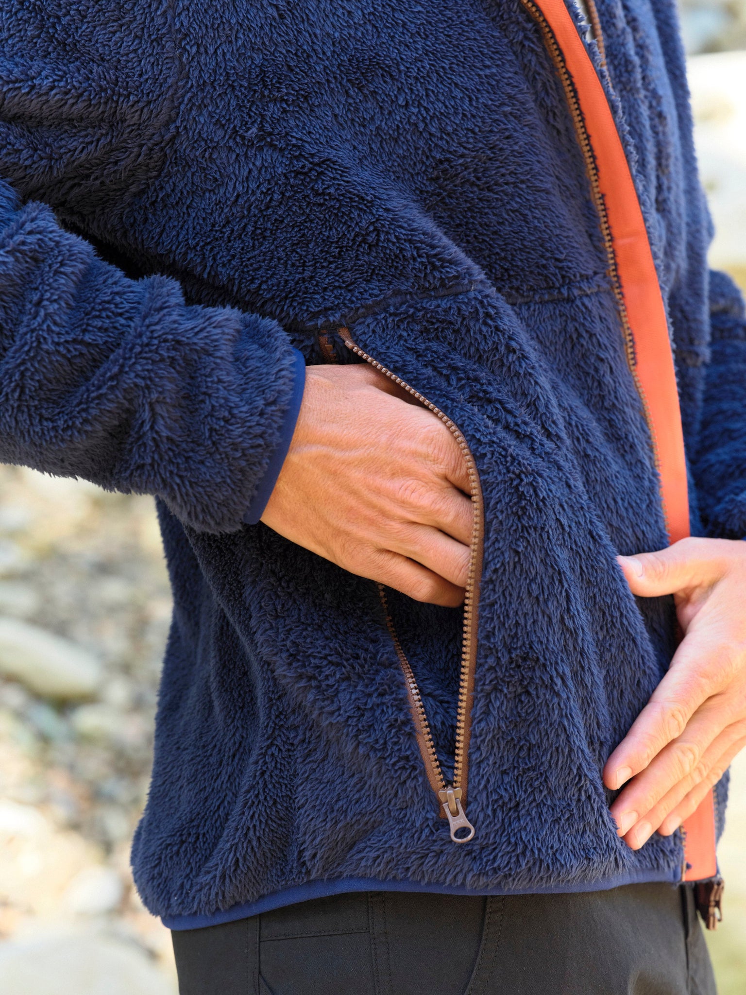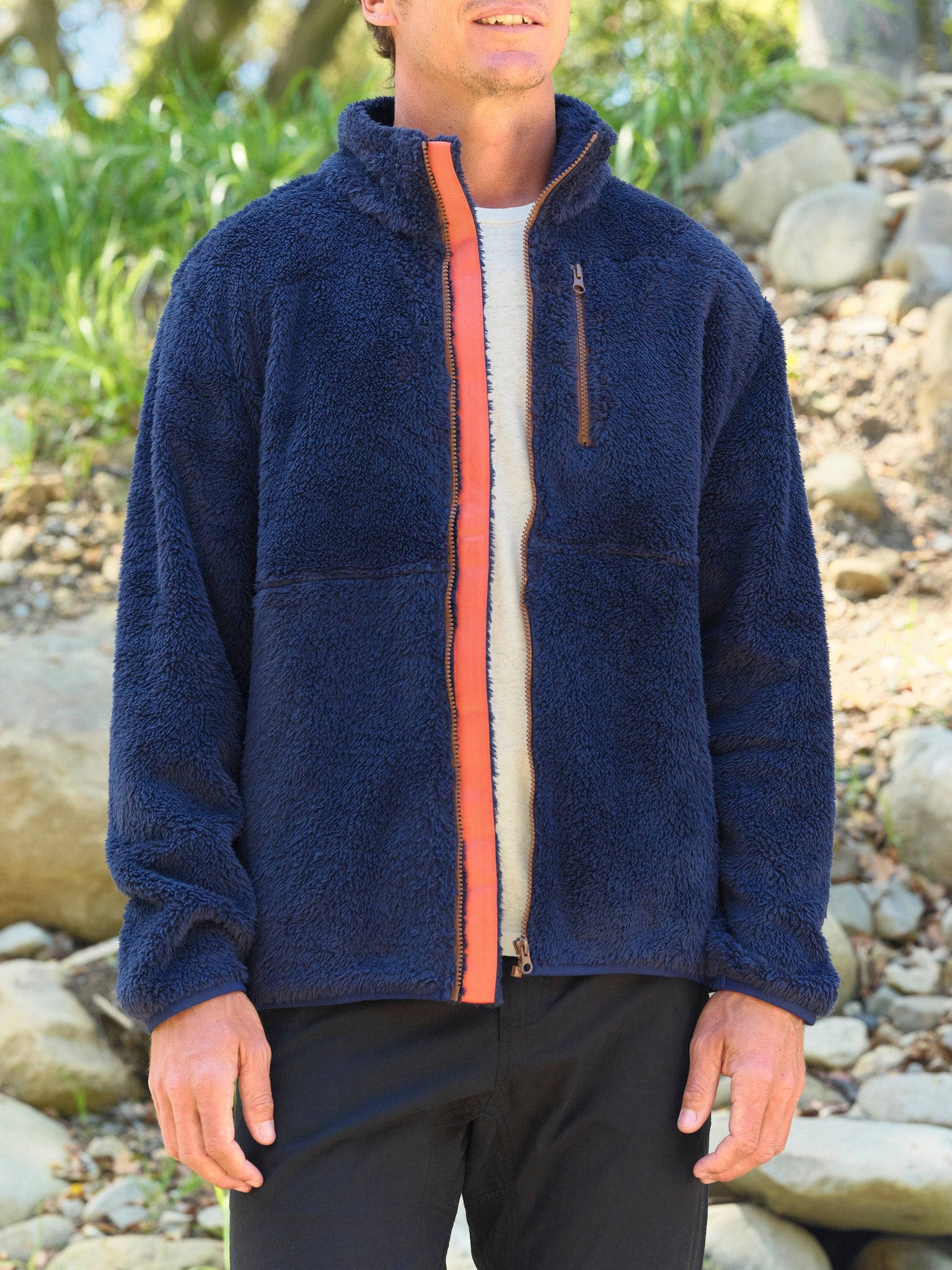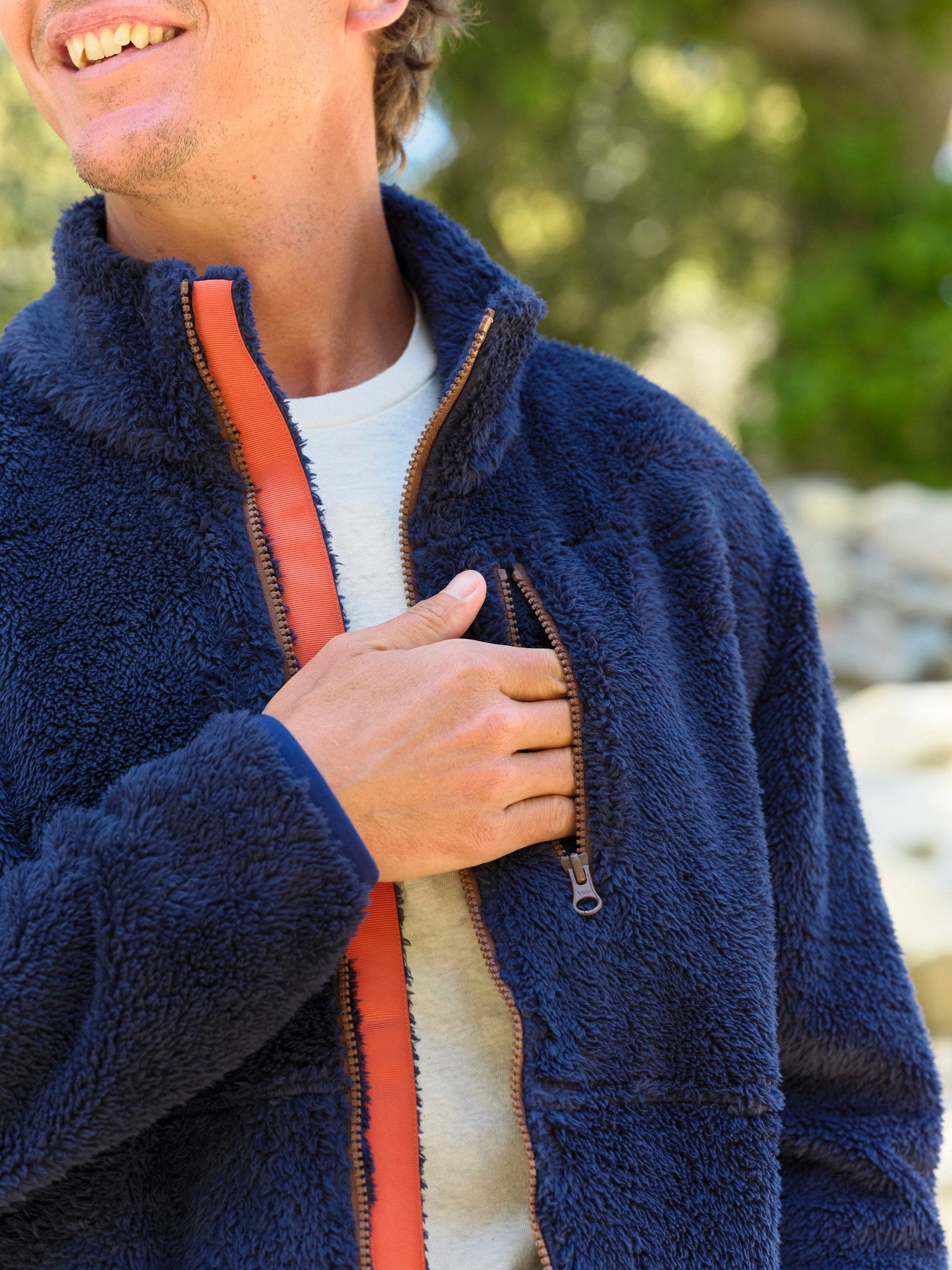 Plush and cozy poly fleece with plenty of pockets and contrast zippers. Fuzzy inside and out to turn any foul weather fair. Leo is 6' 2" tall and wearing size M.