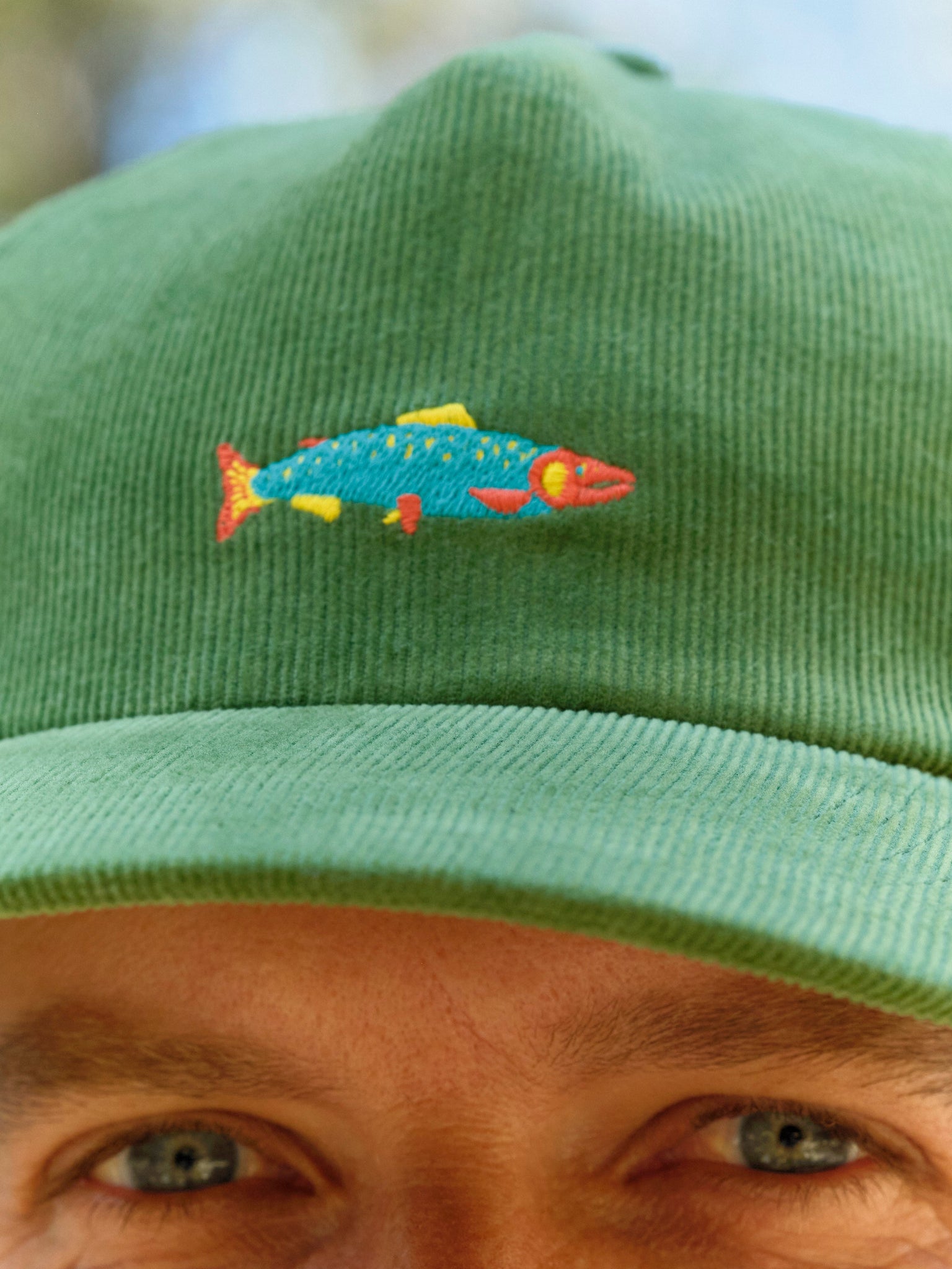 Celebrate the Salmon on a soft corduroy hat. Salmon are fascinating fish known for their anadromous lifestyle, their grueling migrations, and the significant role they play in both freshwater and marine ecosystems.