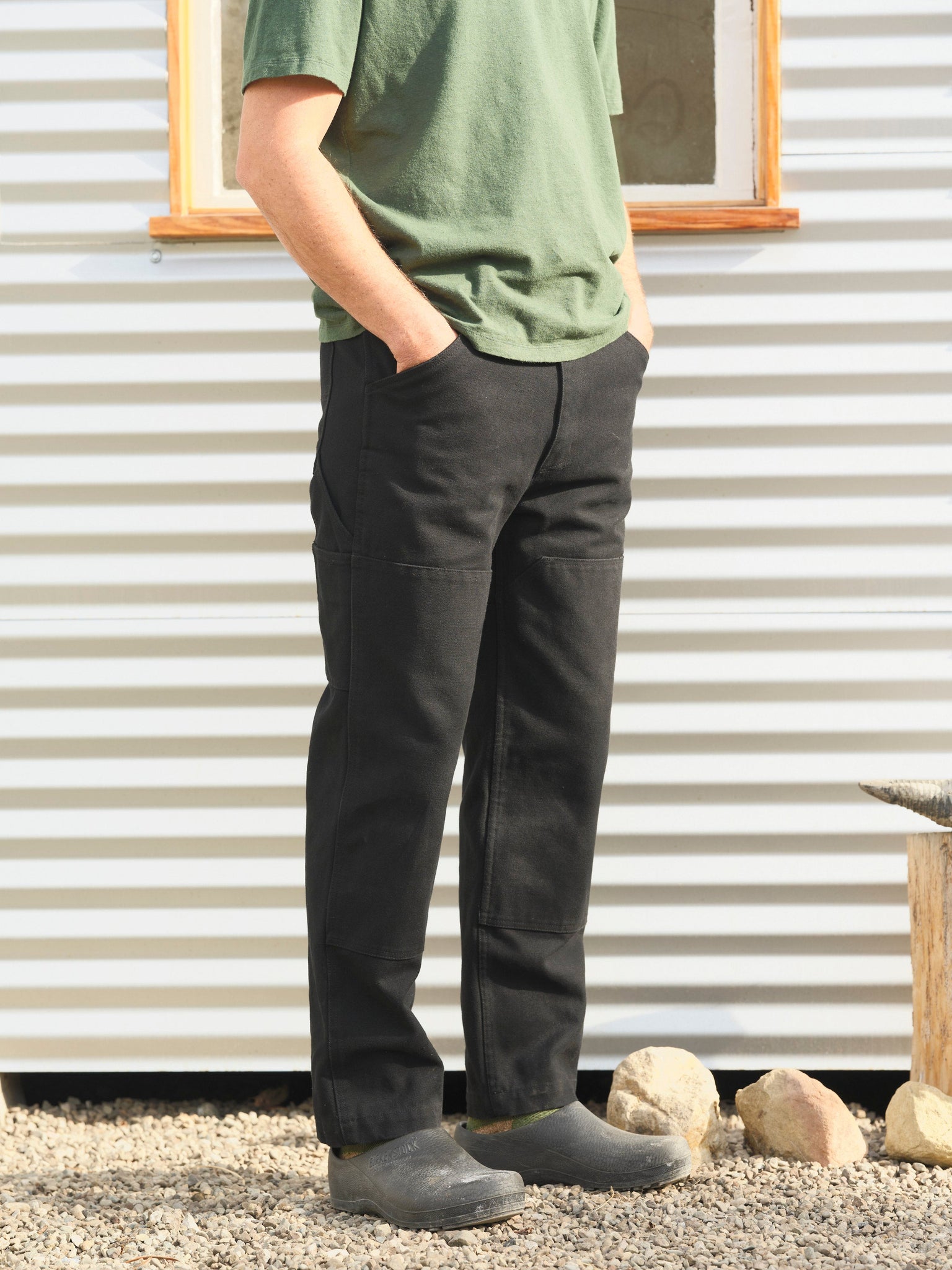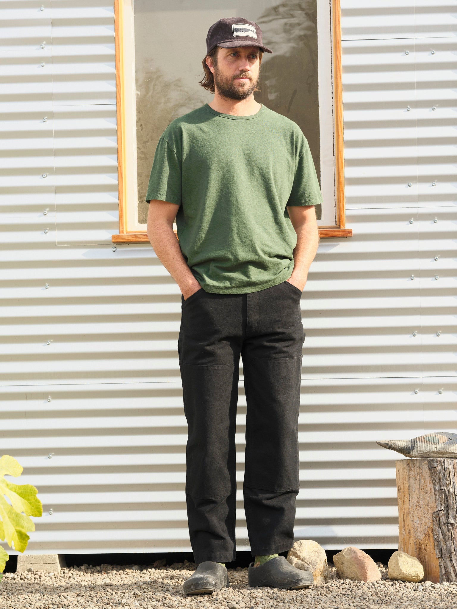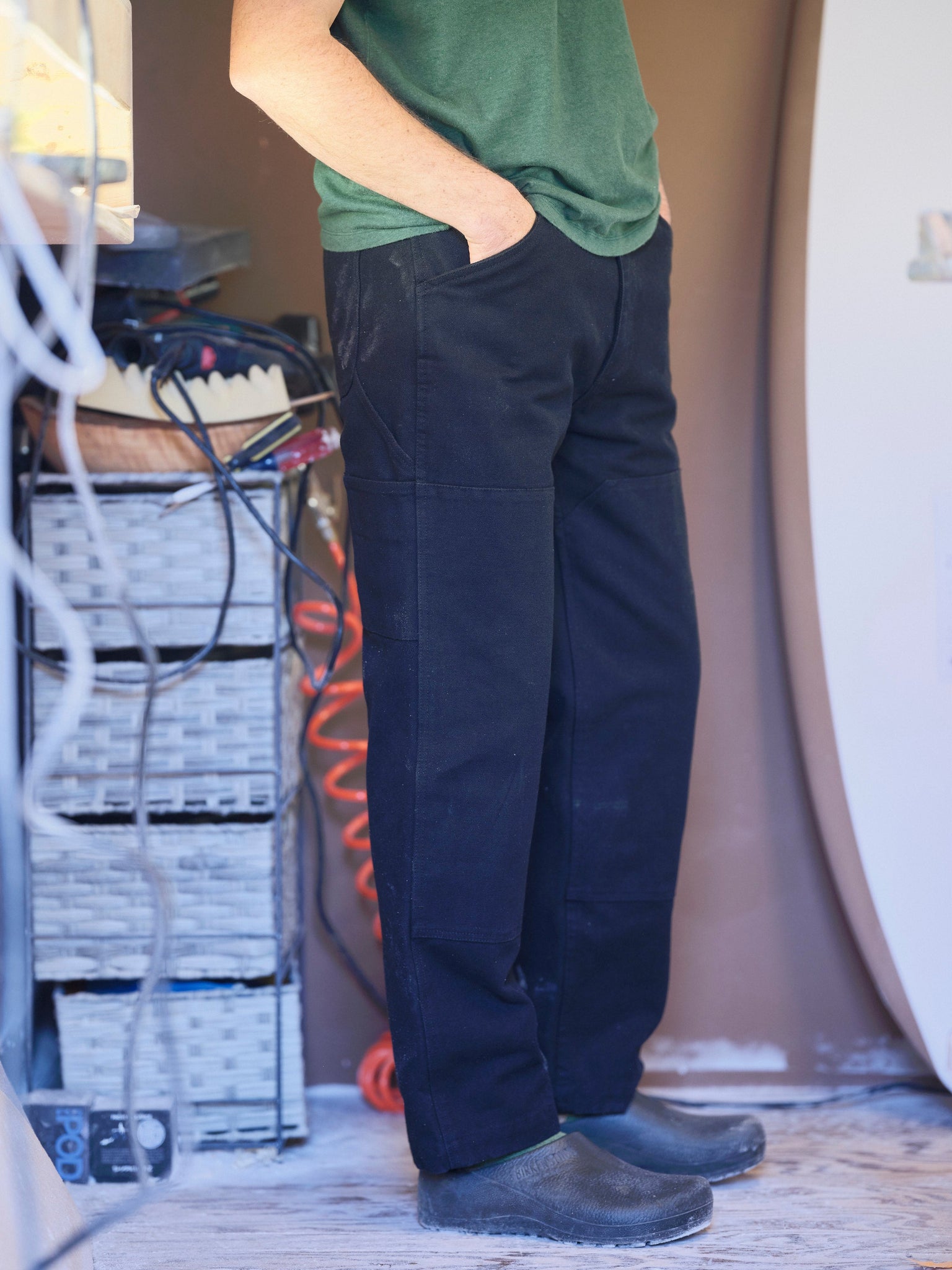 Built for work. These utility pants are made from canvas that is heavy enough for rugged wear, but surprisingly soft and pliable. They feature a double panel in the front, plenty of pockets, and a hammer loop. Trevor is 6' 2" tall and wearing size L.