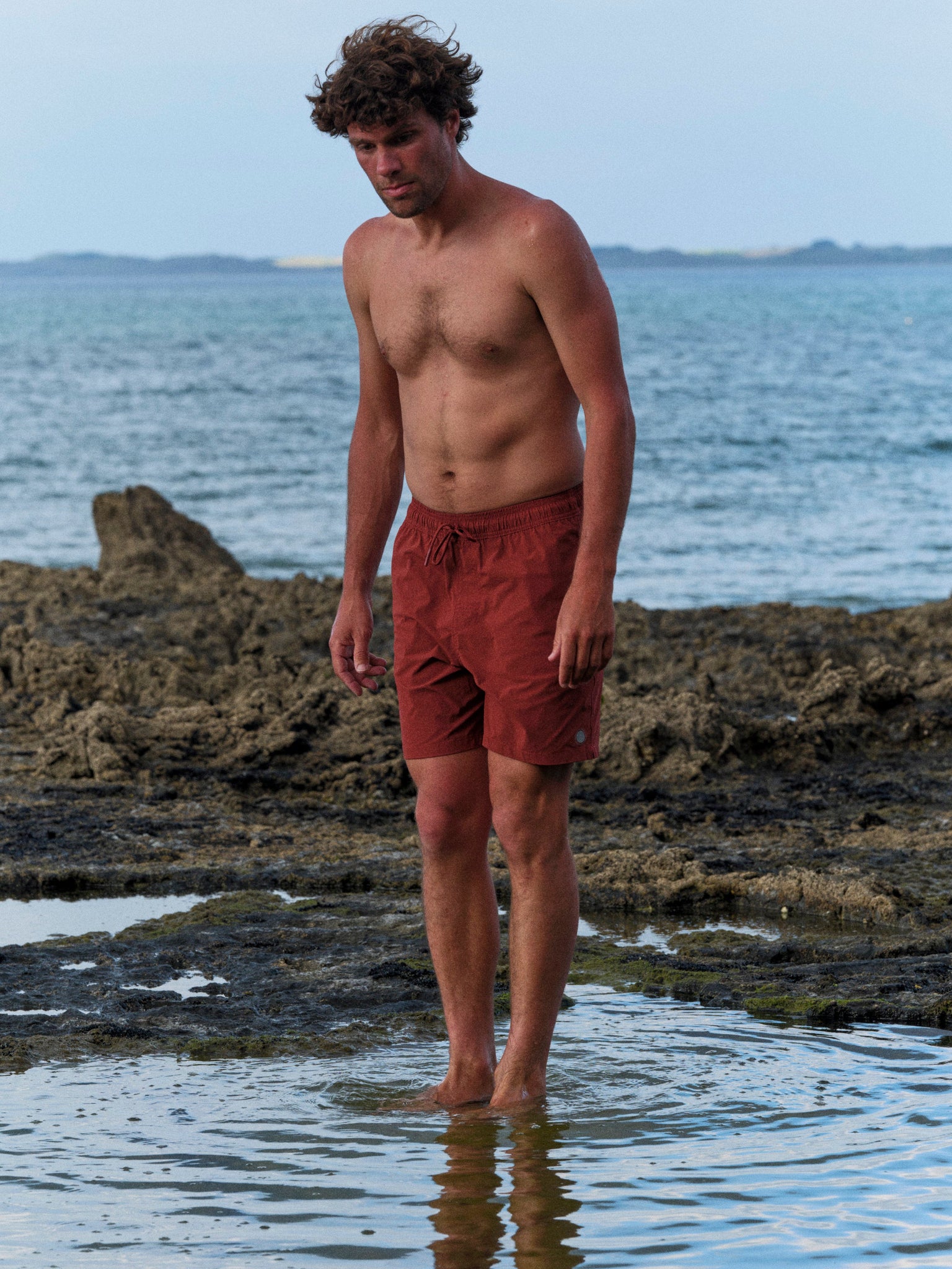 Made of flexible and quick-drying stretch Nylon, with plenty of pockets, a comfortable elastic waistband, and a sturdy drawstring. For surfing or wearing around town.