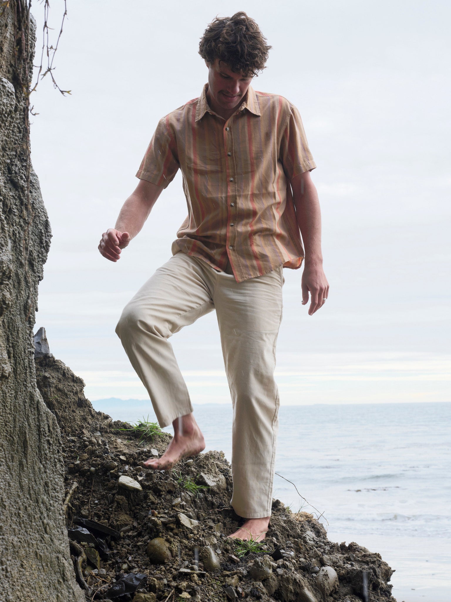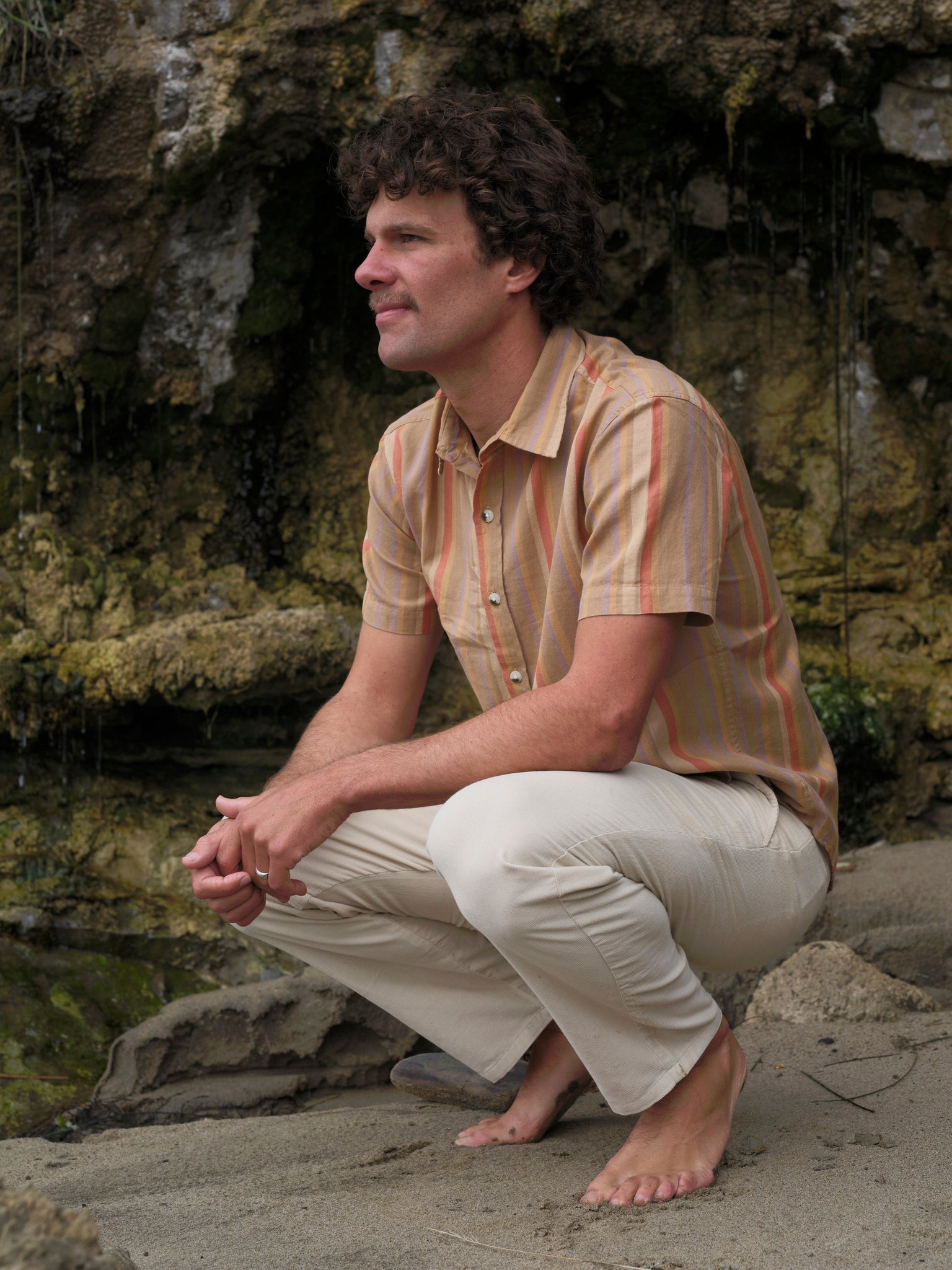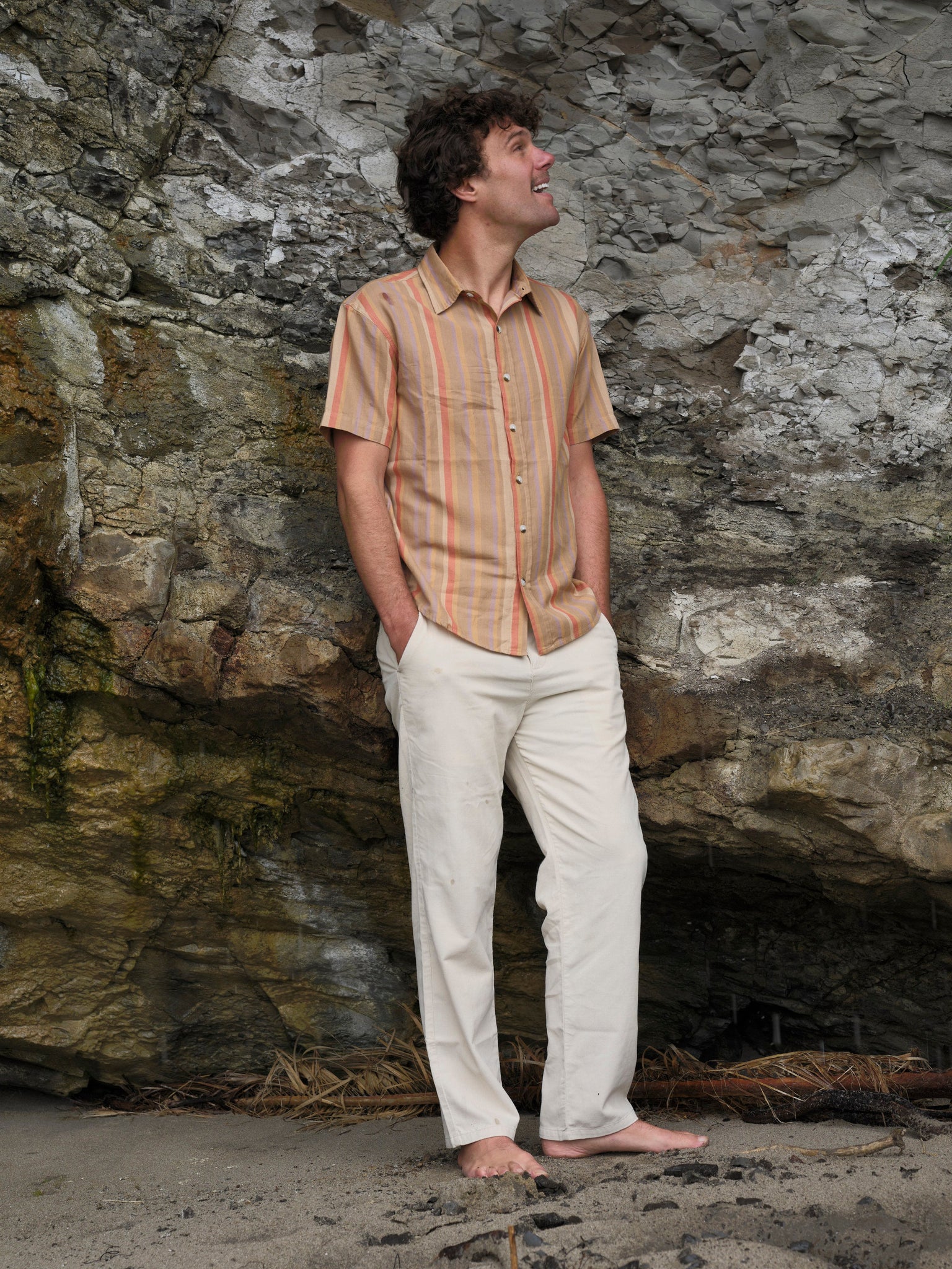 A classic 60's style for the modern man to wear while pleasure boating or barbecuing. Beau is 6' tall and wearing size M. Zach is 6' 1 and wearing size L.