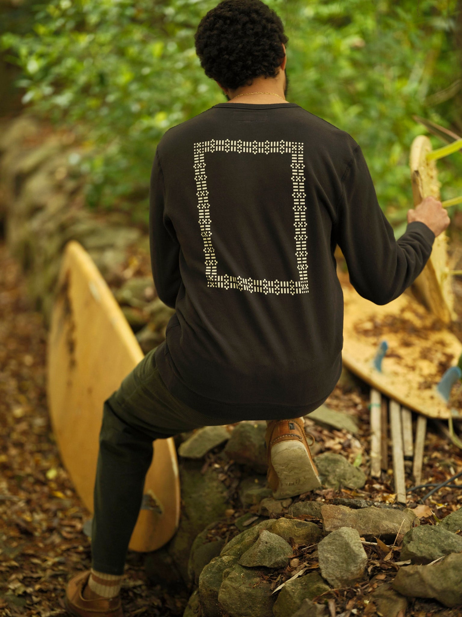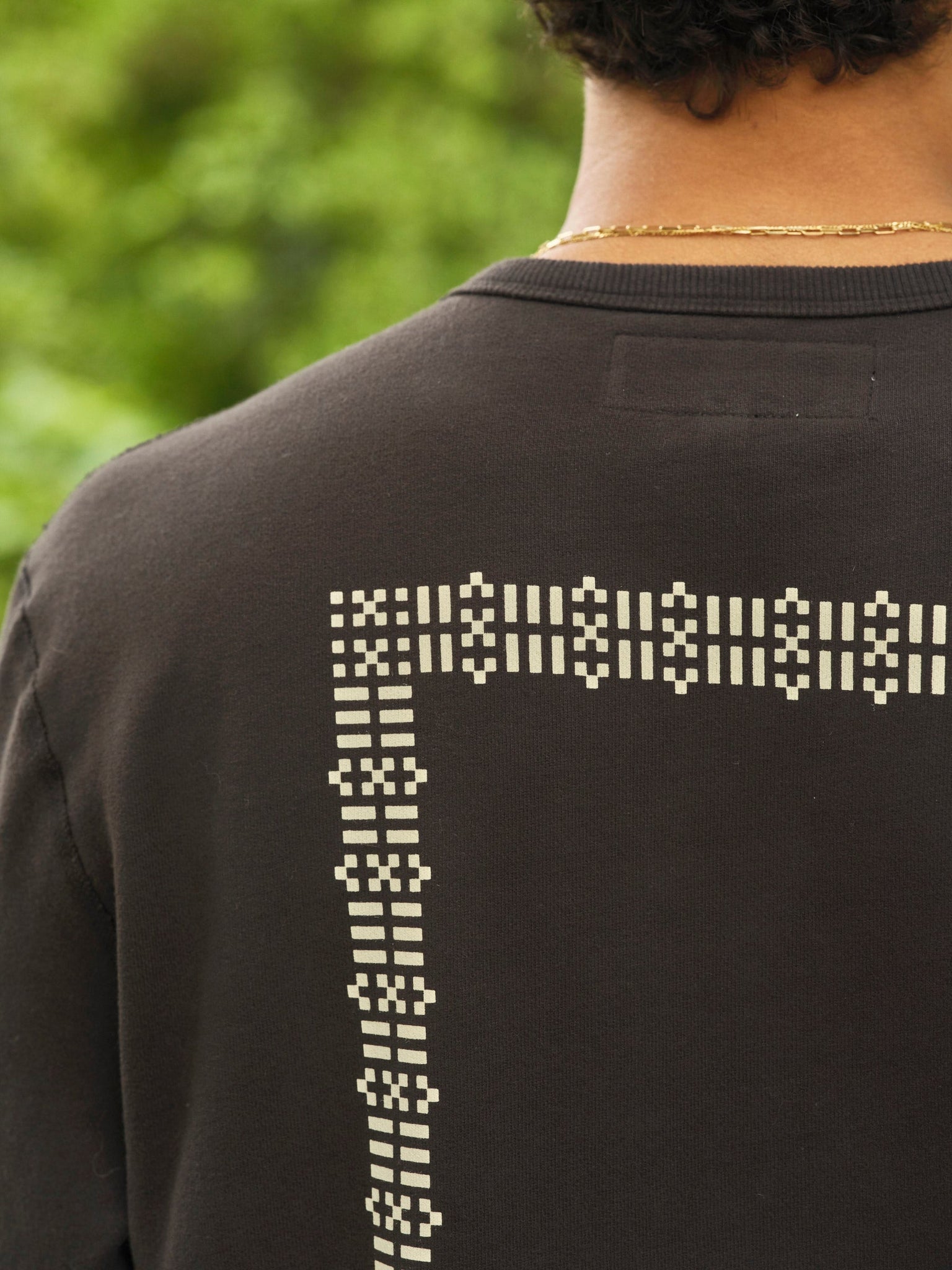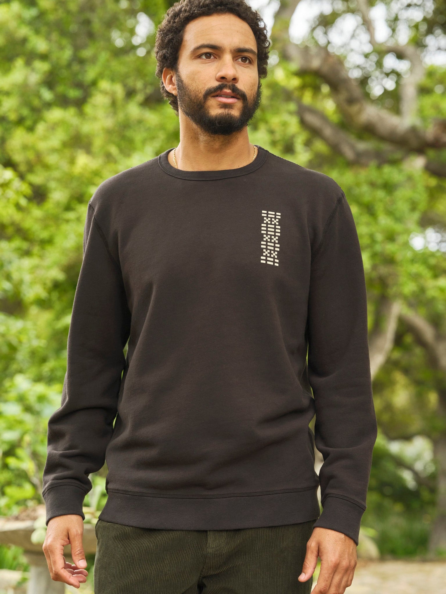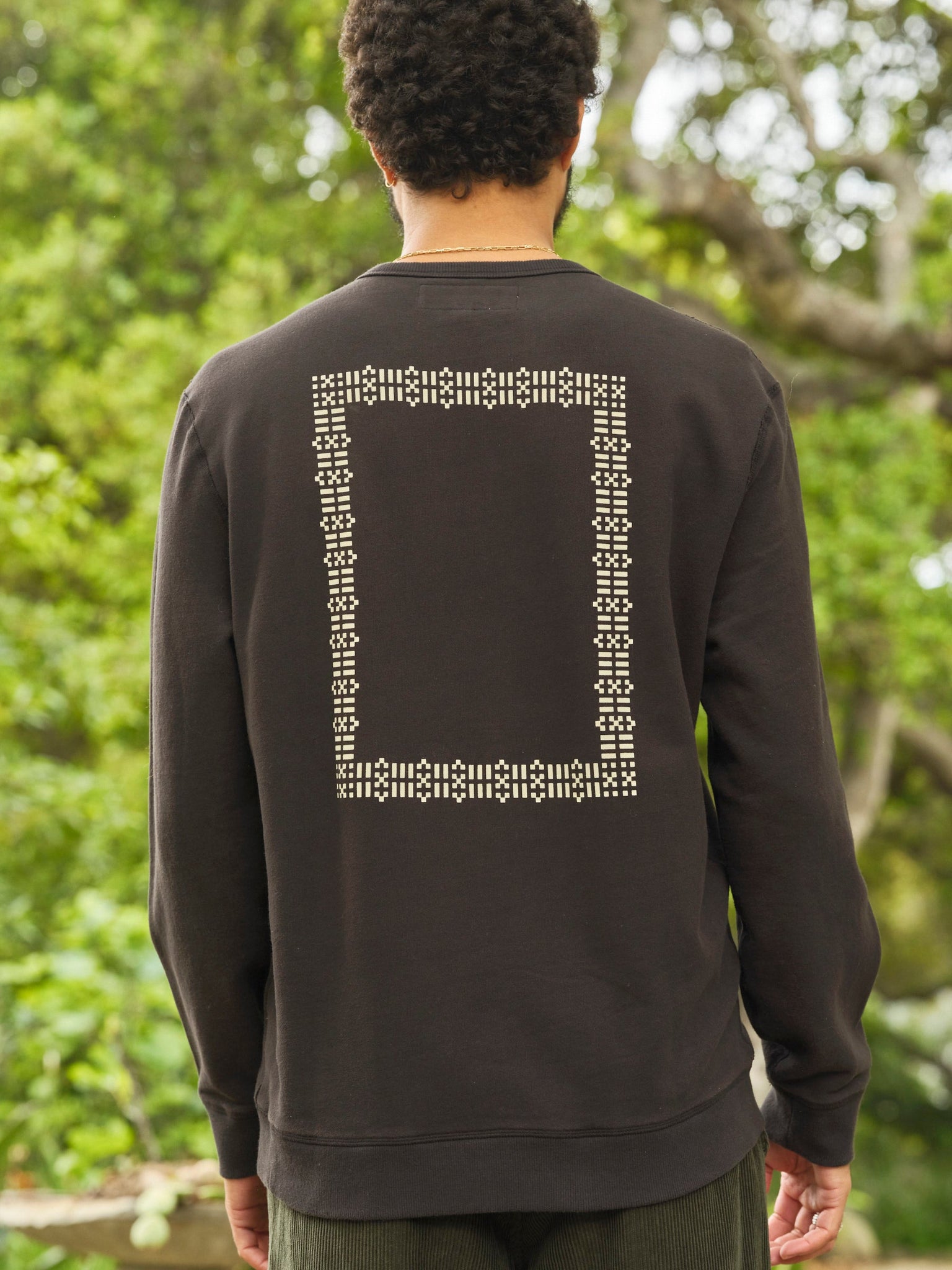 A blueprint for consciousness on a sturdy crew sweatshirt. The French Terry fabric is lightly brushed for softness and a transitional weight for layering. The fit is true to size with room through the shoulders for mobility. Zach is 6'1" and wearing size L.