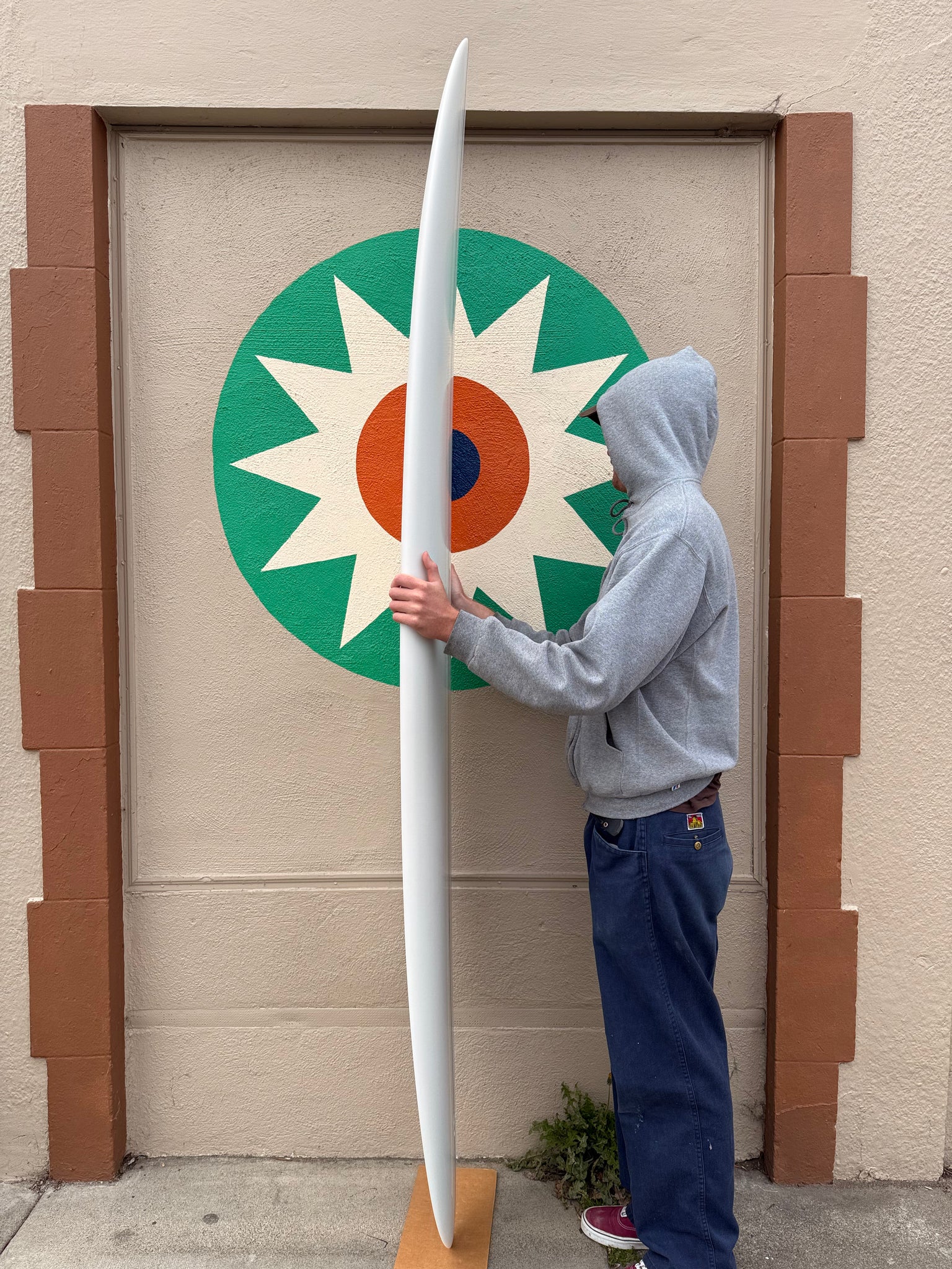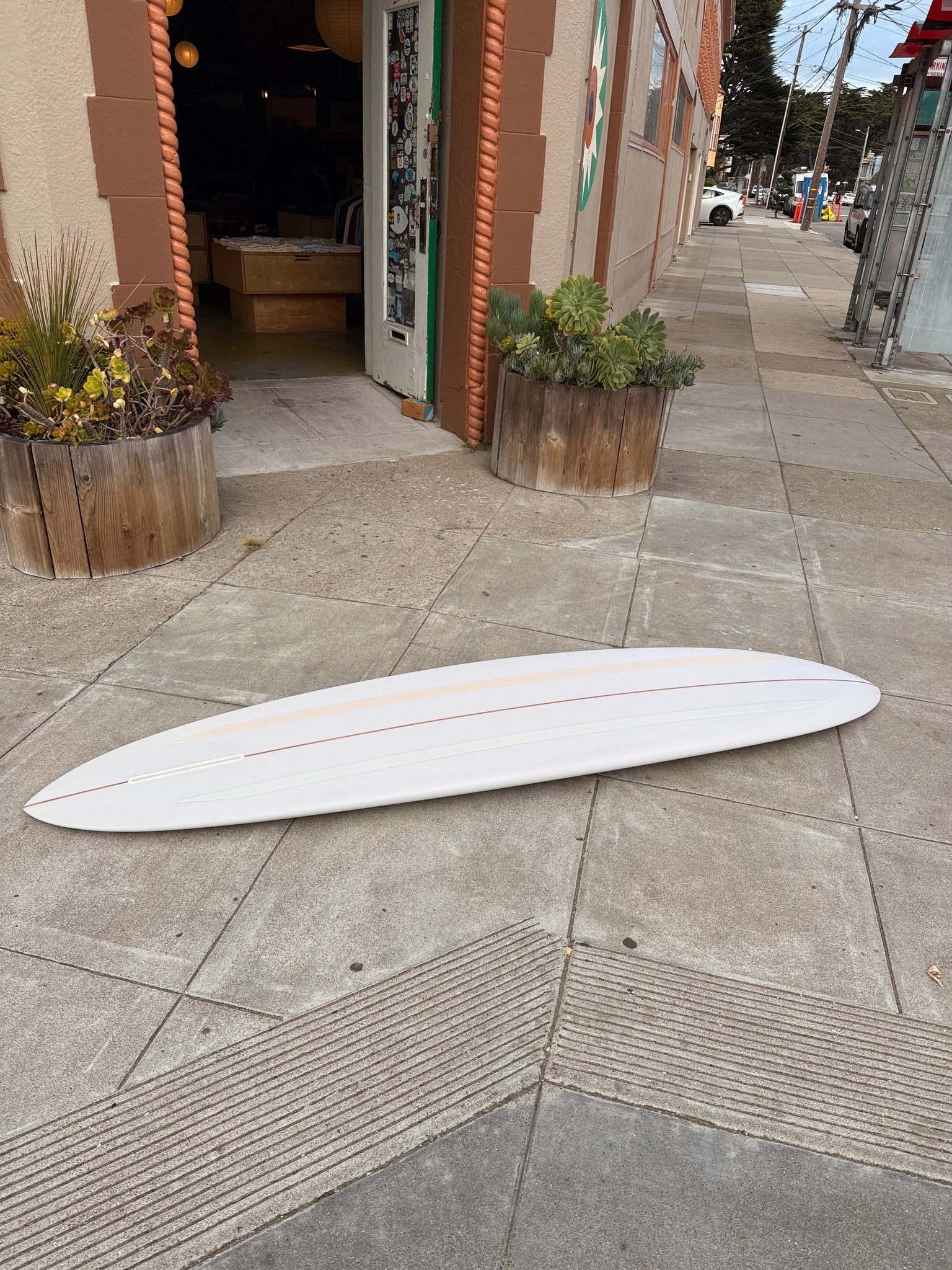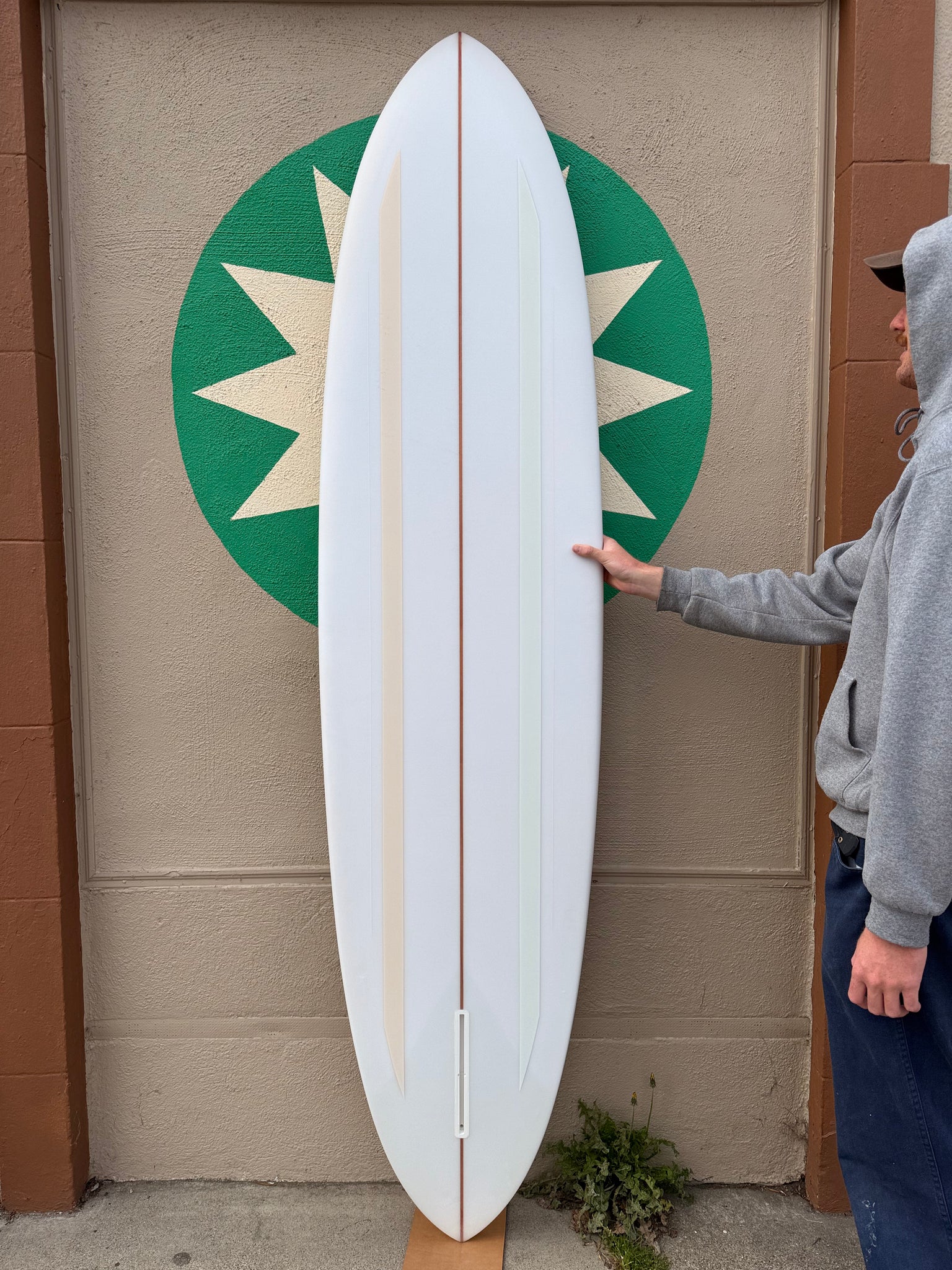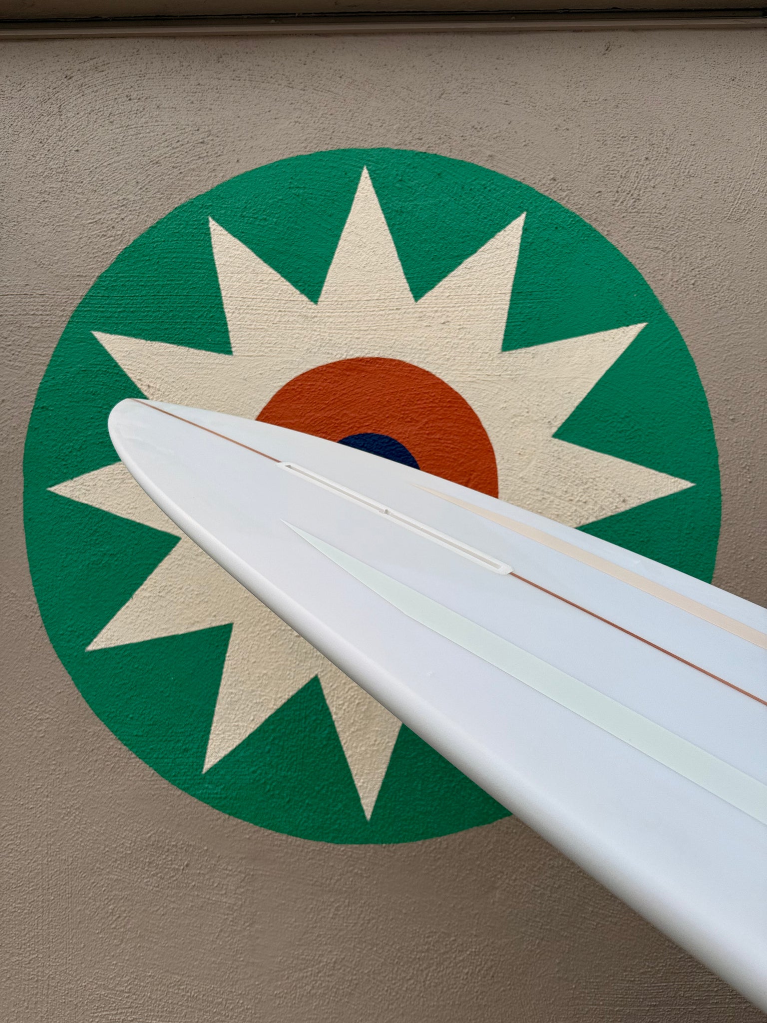 A slightly pulled in glider design, allowing it to fit deeper in the curl. It still carries solid volume for trim from the same sweet spot you lay it over on… Its medium/thin eggy rails, all smooth and controlled. Very nice! Pairs well with an oversized, thin fin. Maybe a ten inch velzy from Chuck or the Greenough 4C or maybe just a dinky little nub minimizing drag… Going fast now, take quiet flight into your eternal sunset of joy.
