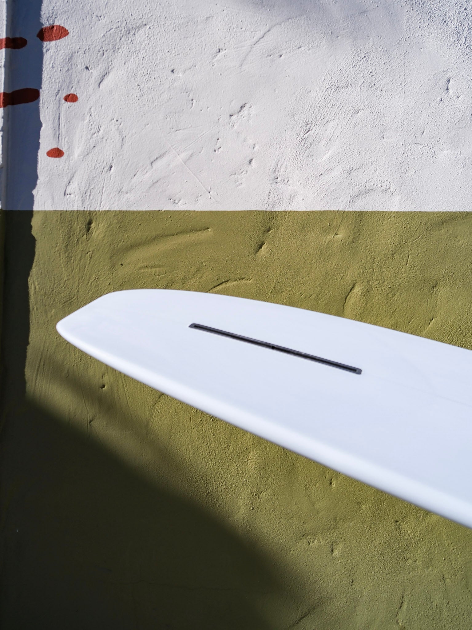 This board features a subtle concave in the nose, mostly flat midsection with vee above the fin, and flat out the tail. 70/30 rails throughout the board with a harder edge towards the back for a crisp release. Pair with a raked fin for liveliness, or a pivot fin for more noseriding capabilities. A simple board with multiple gears.