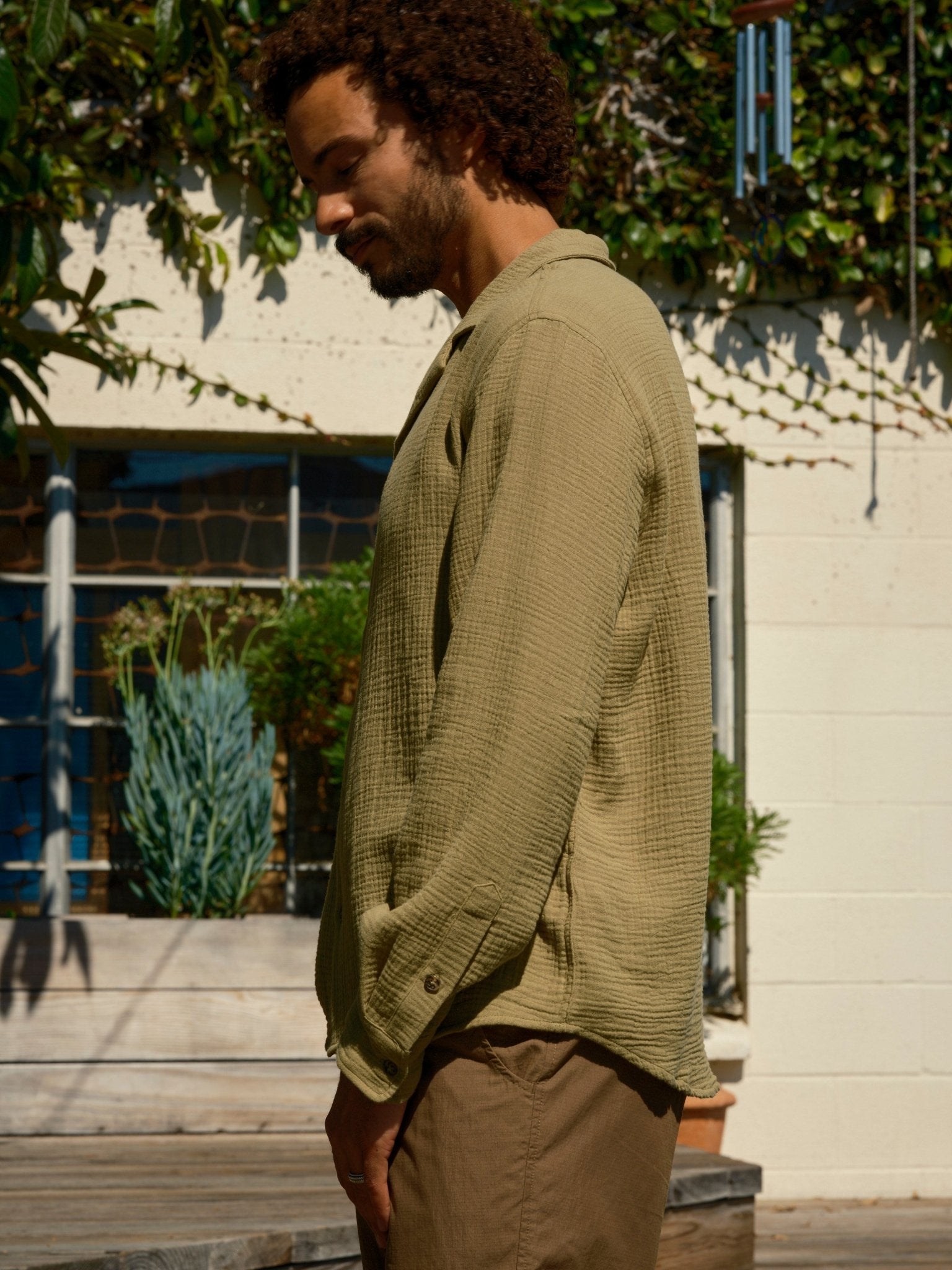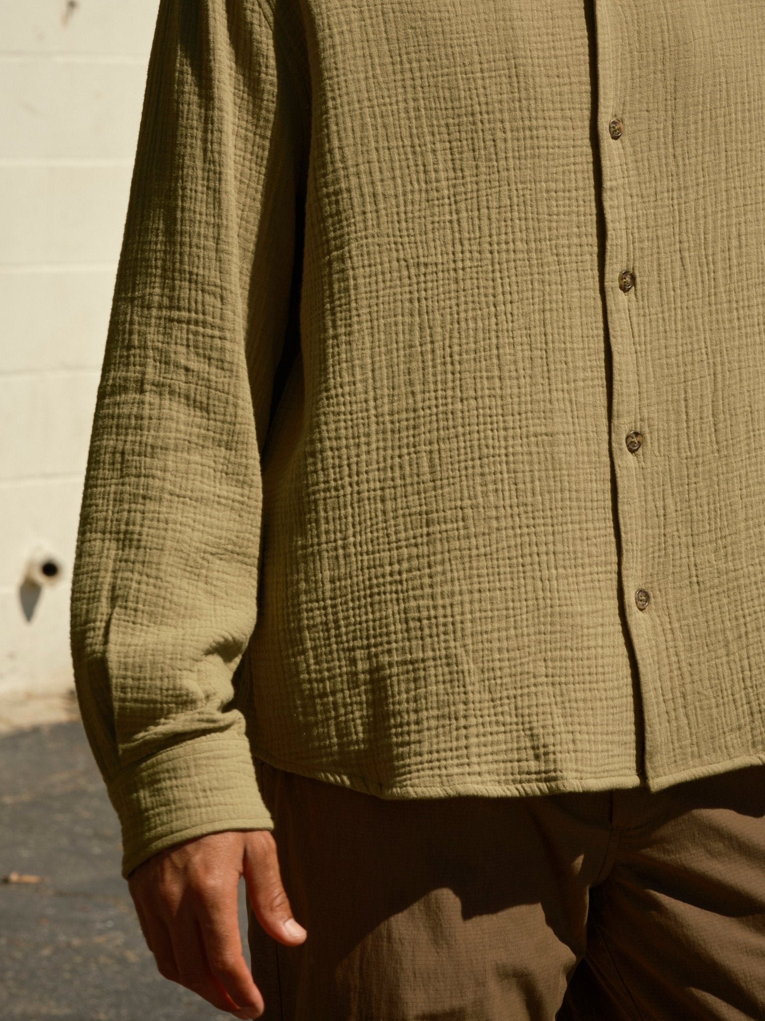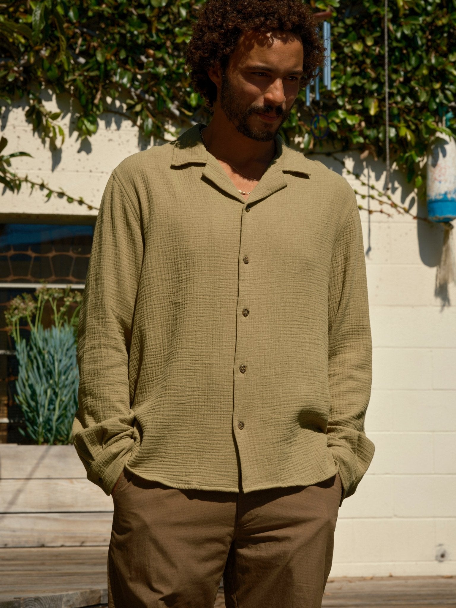 A long-sleeve splay-collar shirt in an airy double gauze for anywhere warm breezes take you. The fit is laid back and relaxed.