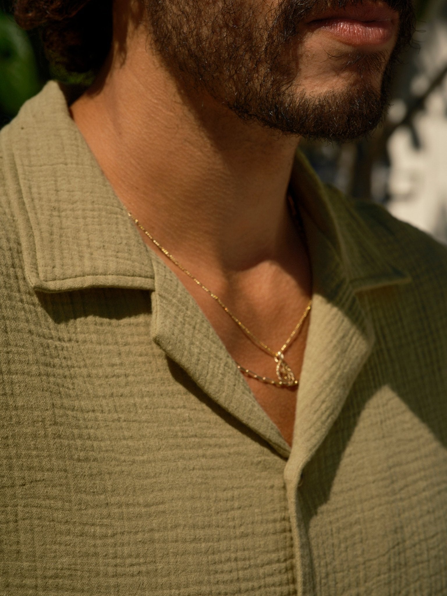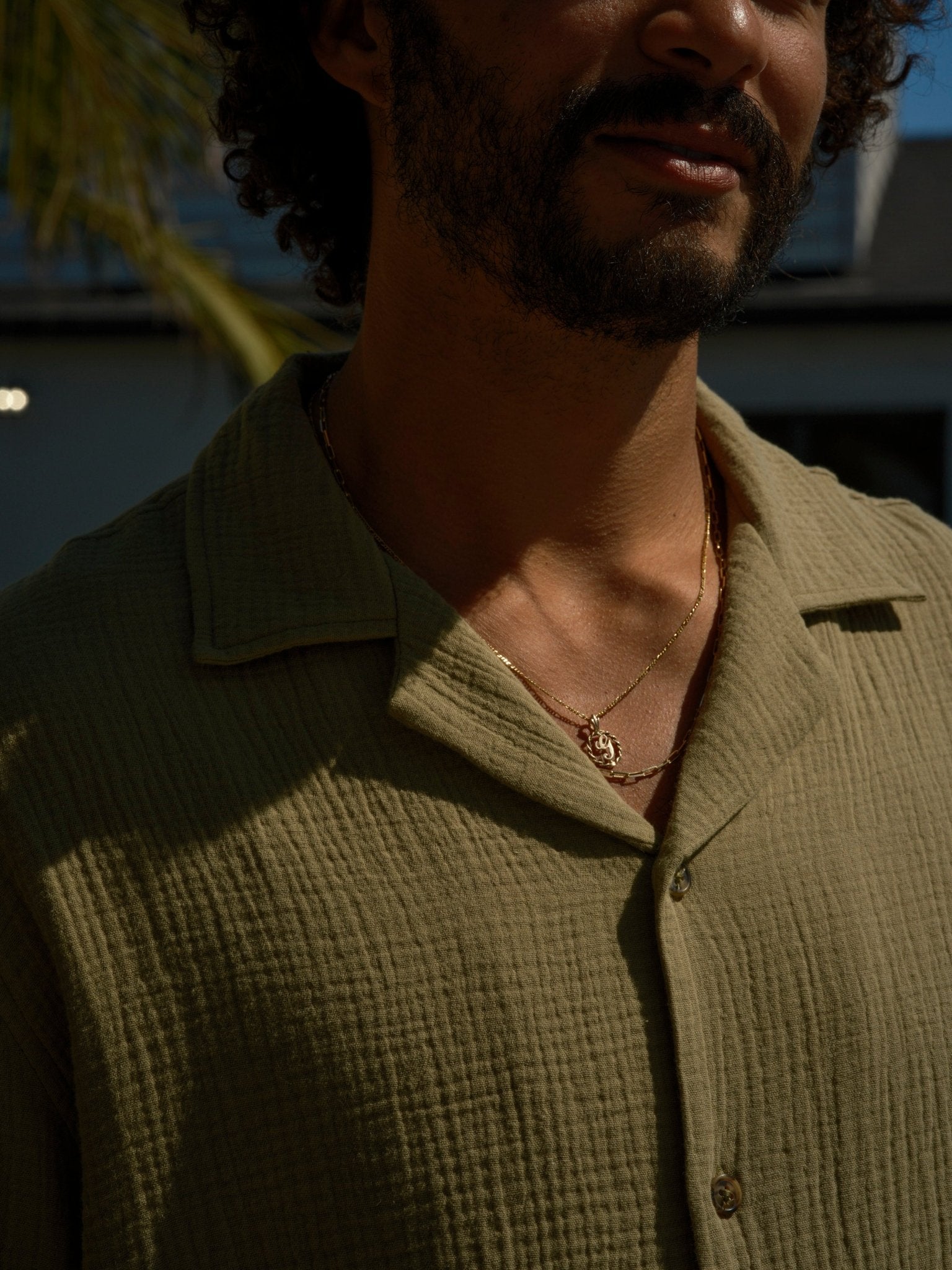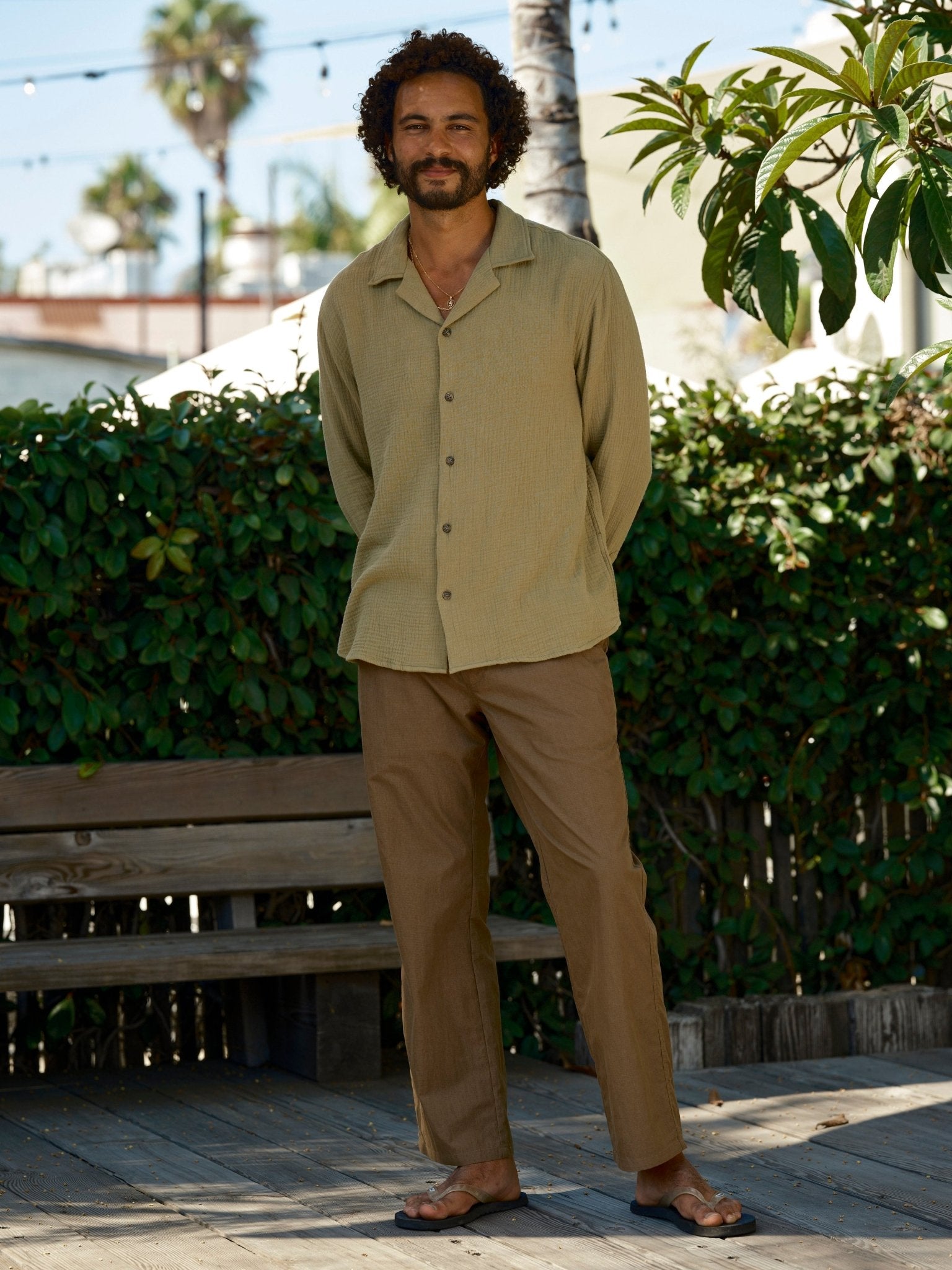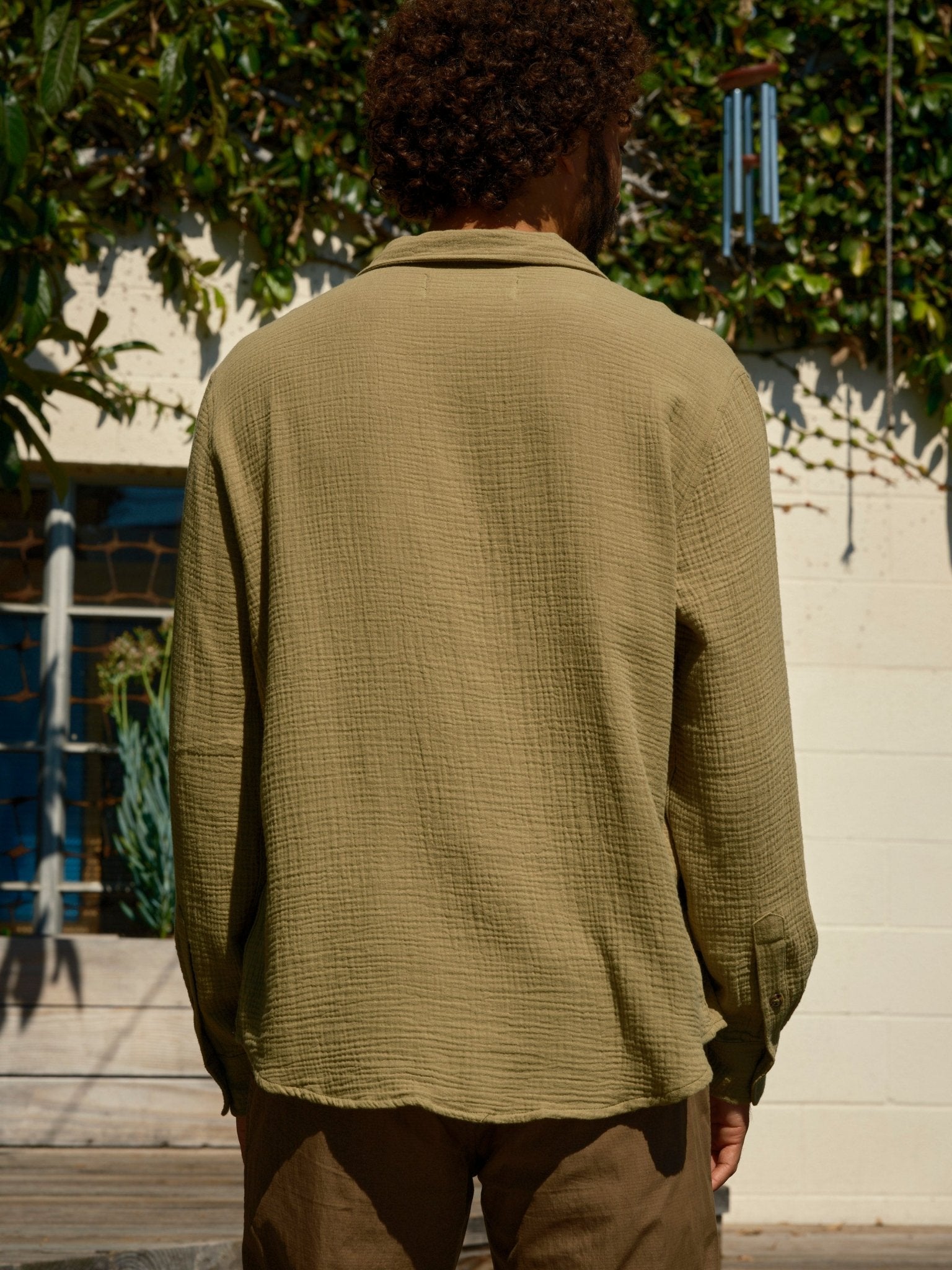 A long-sleeve splay-collar shirt in an airy double gauze for anywhere warm breezes take you. The fit is laid back and relaxed.