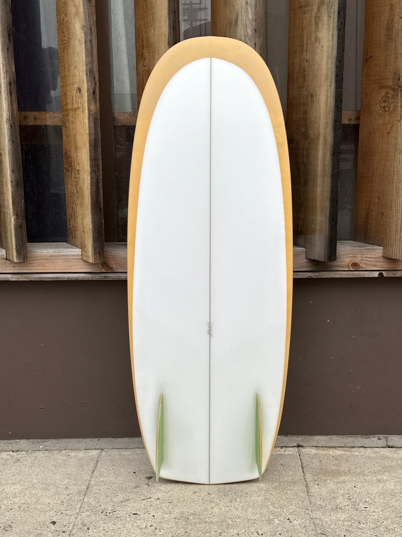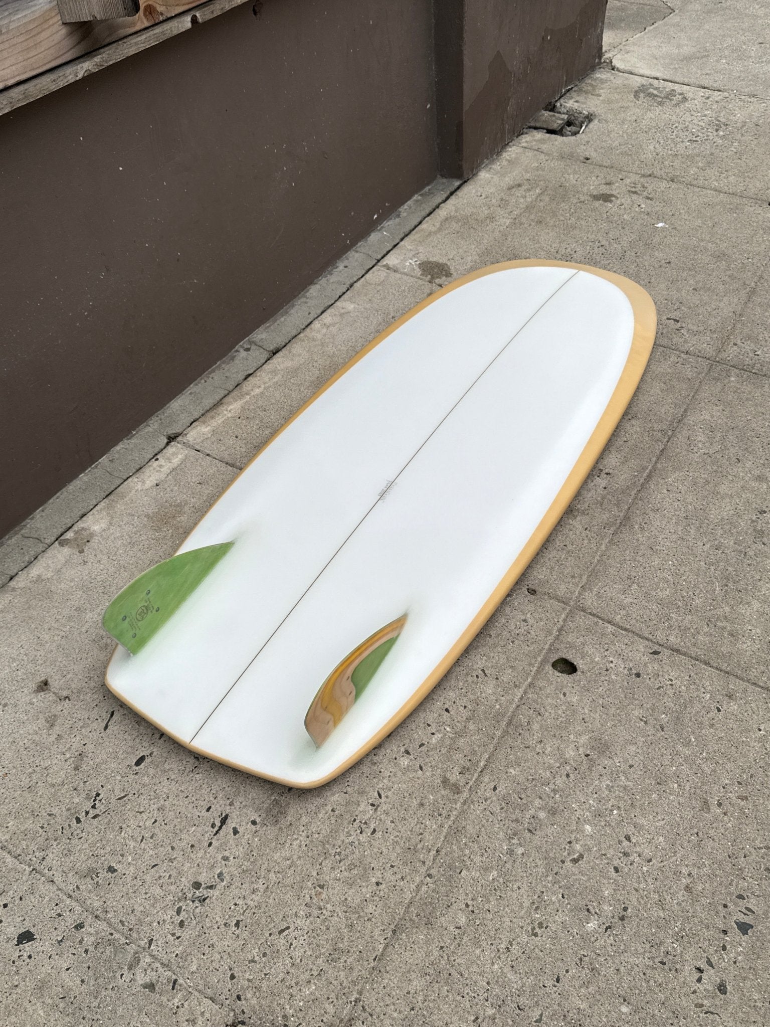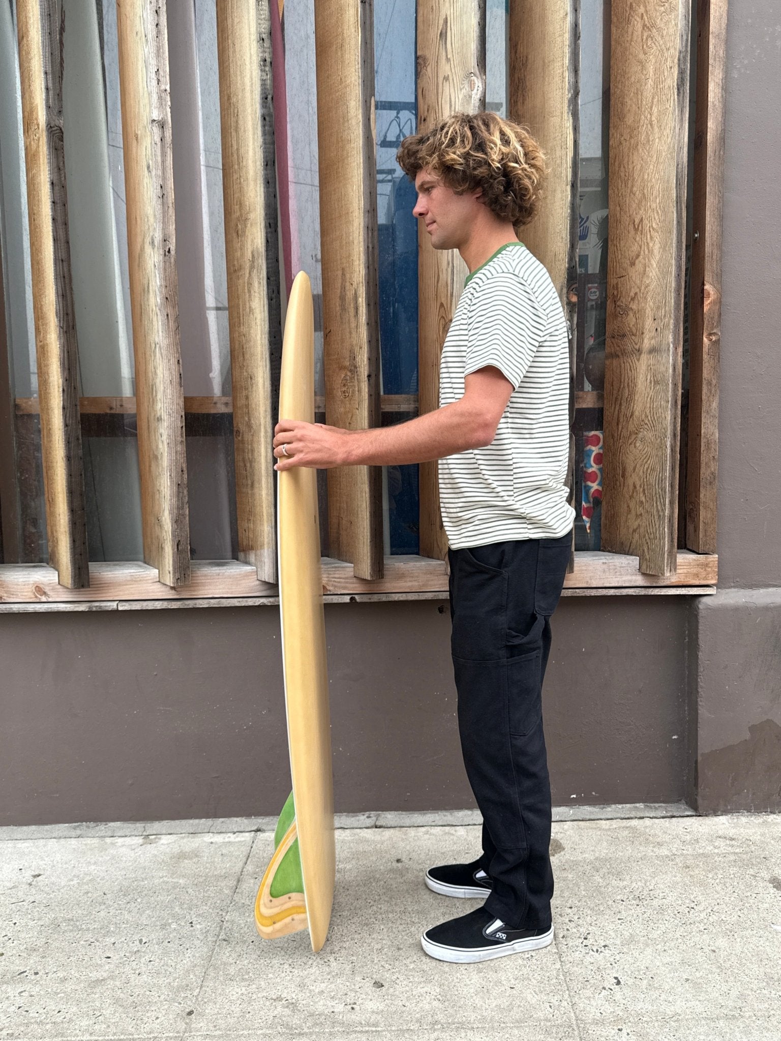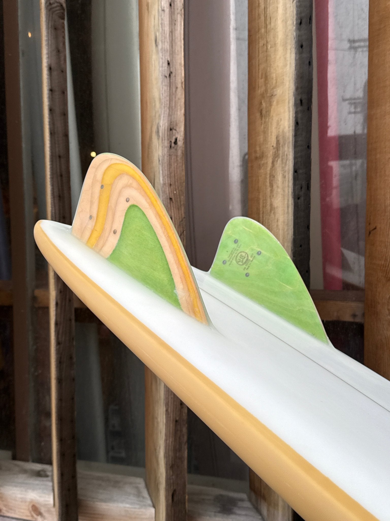 Mini Simmons shape, rolled entry, beveled rail into some long-based keels to drive this skate and go fast.