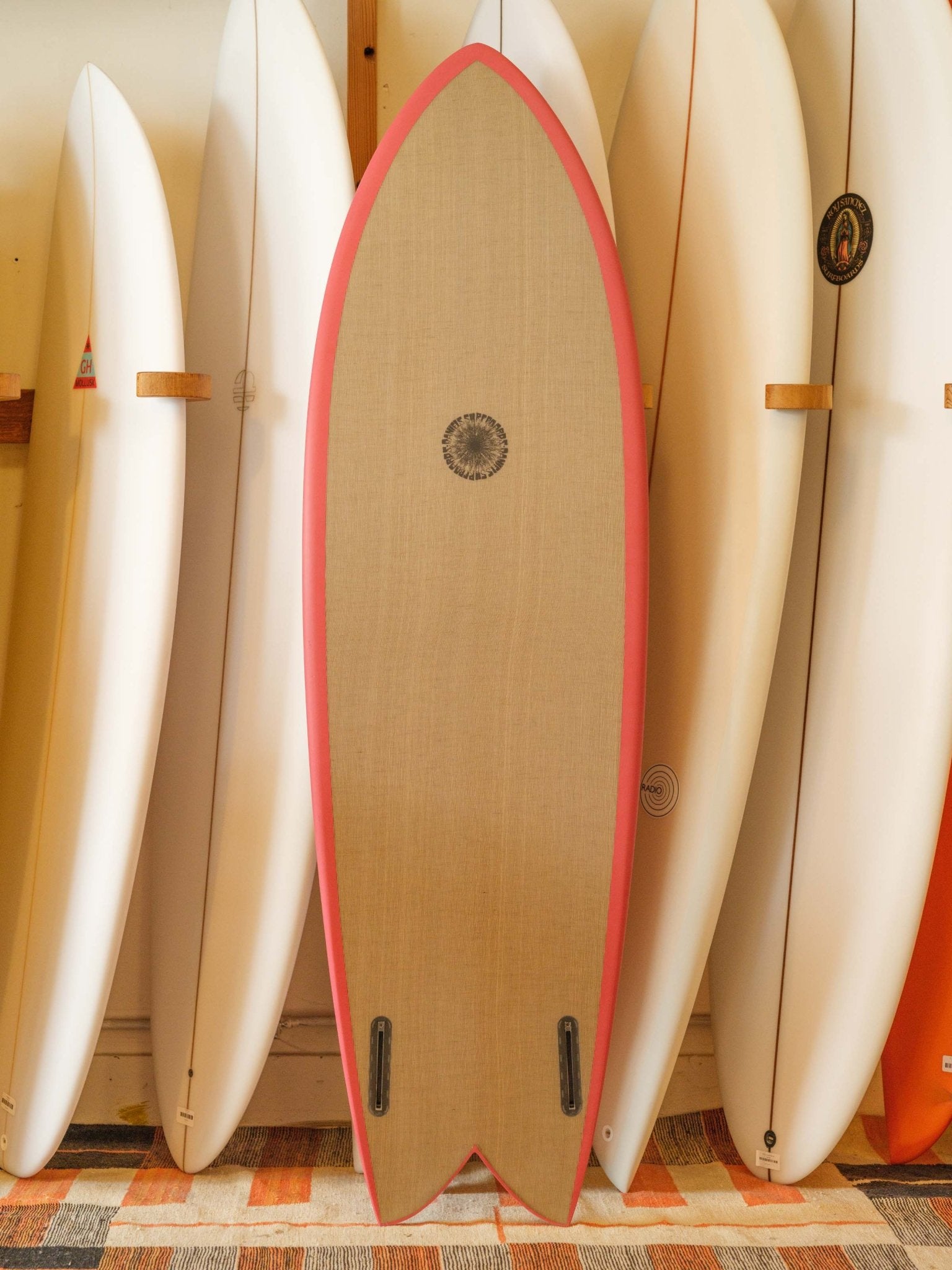 "The Lucid Fish is a stringerless fish and features a scoop deck, helping the board create a parabolic flex pattern as its loaded up during turns. It has single to vee-double concave on the bottom.