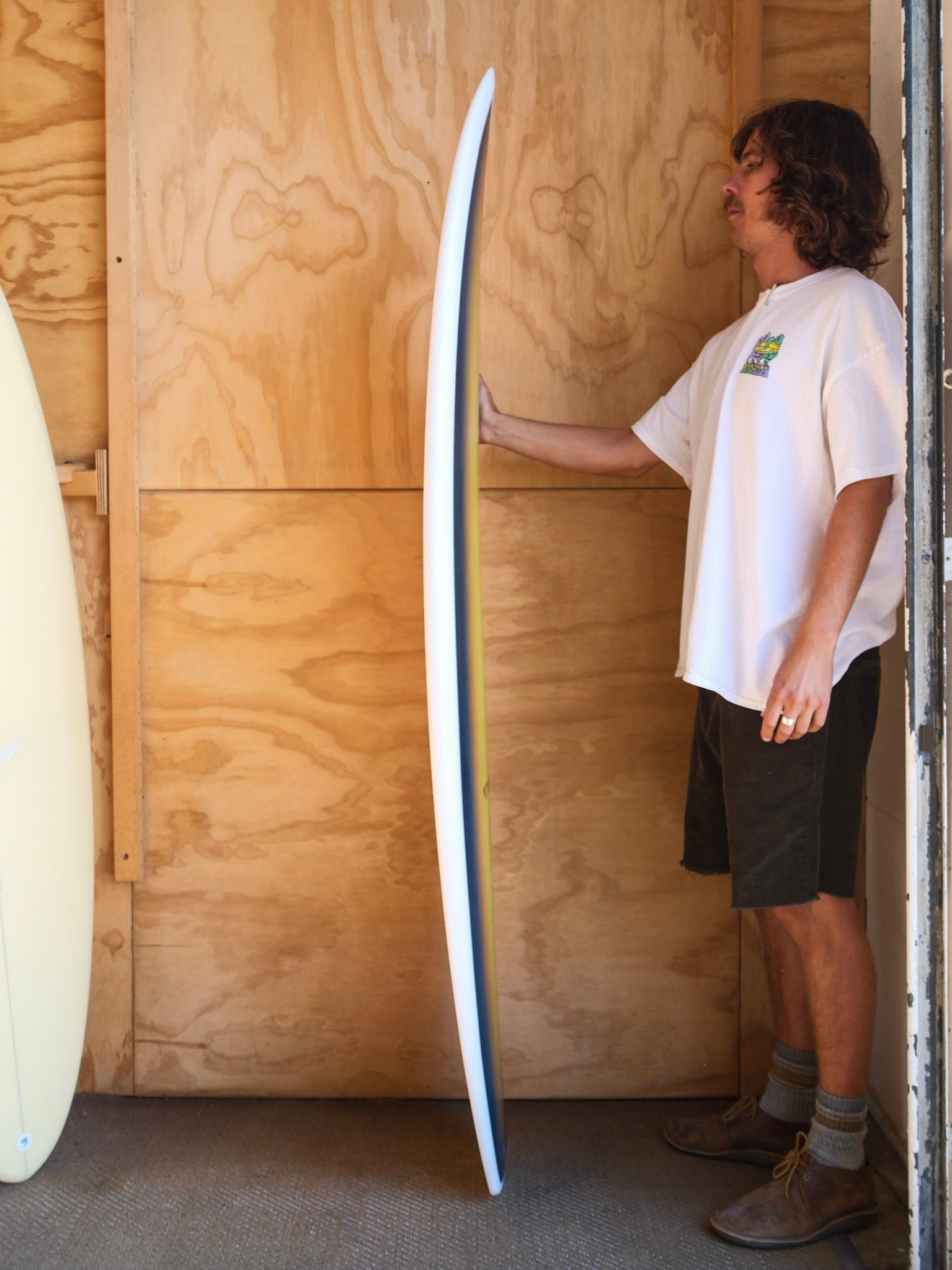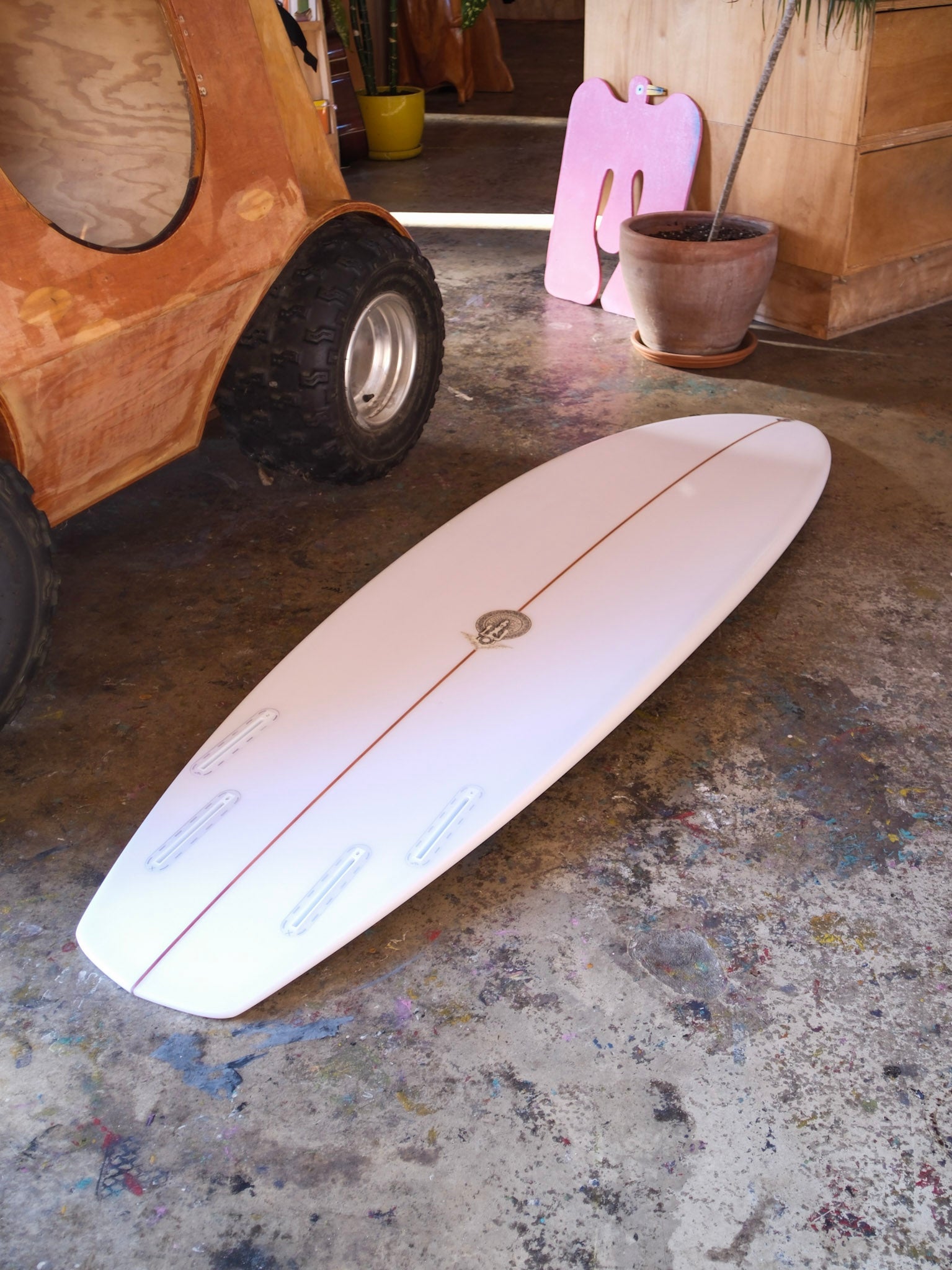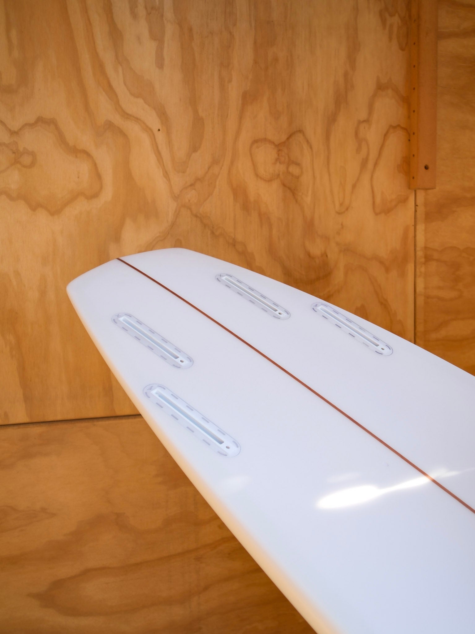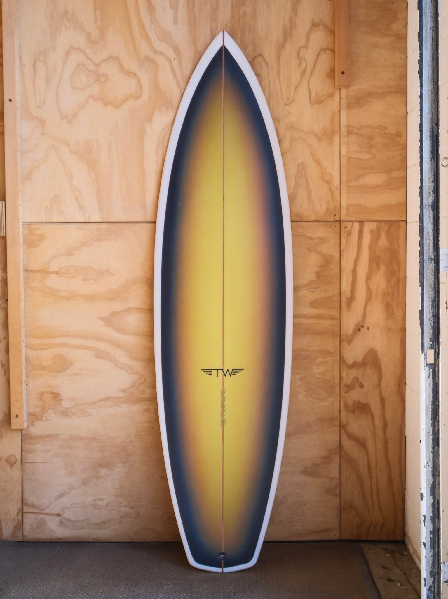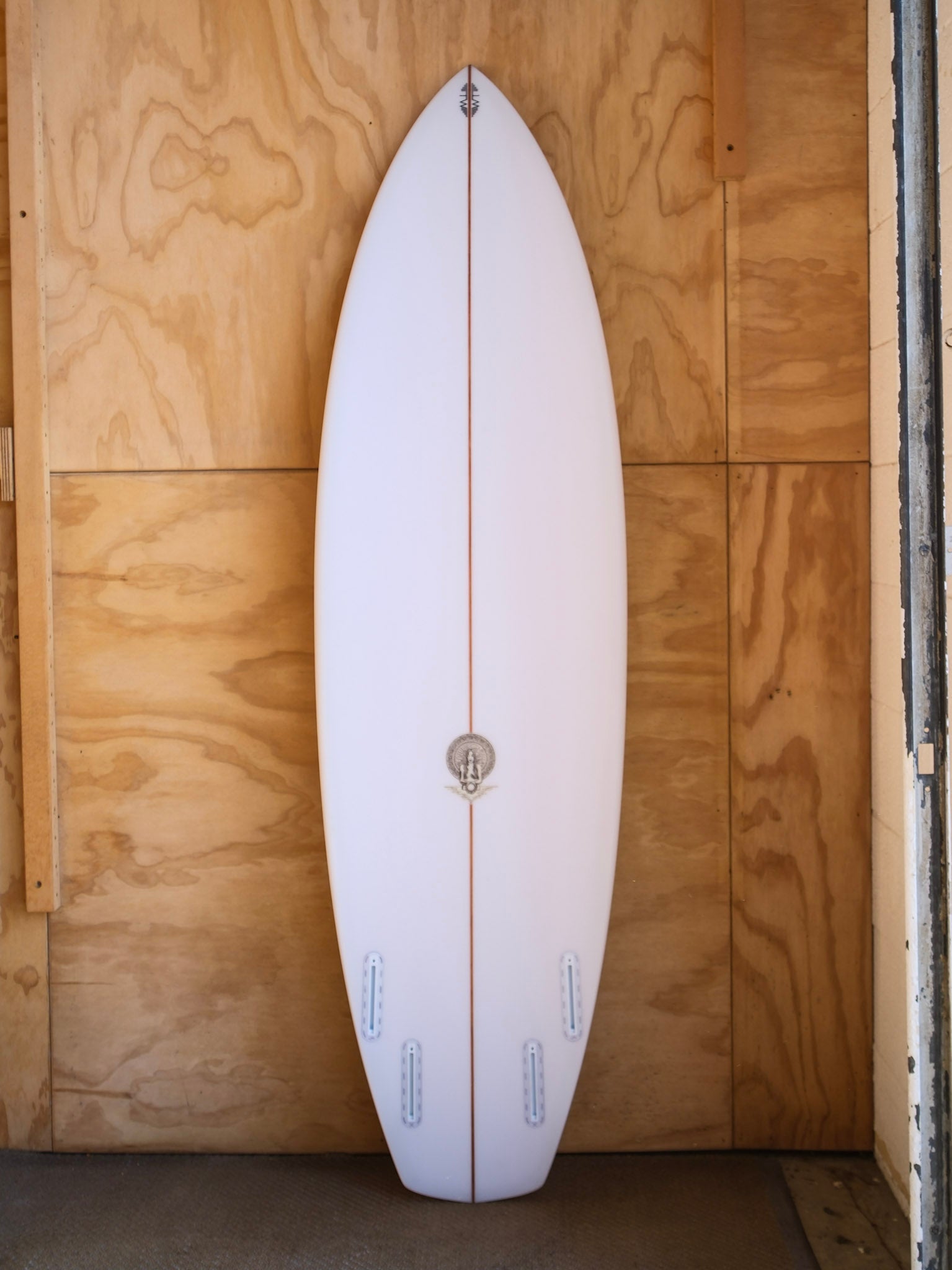 "This board was inspired by Allen Sarlo (one of the original Dog Town and Z-Boys) and watching him rip Malibu over the last 25 years on wide tail blocked equipment. A wider tail shortboard design that provides instant pick up speed and drive provided by a quad set up. The pulled nose helps during critical situations. The bottom has slight roll entry the last 6” then flows into a mellow tri-plane hull that flows to a fairly deep center concave fading into a spiral vee. This model I have tested from shoulder high SoCal surf to double over head grinding surf, it felt great in both situations providing plenty of hold and speed (due to straight exit point in tail template) with the freedom of a diamond tail to break your line." - Tyler Warren