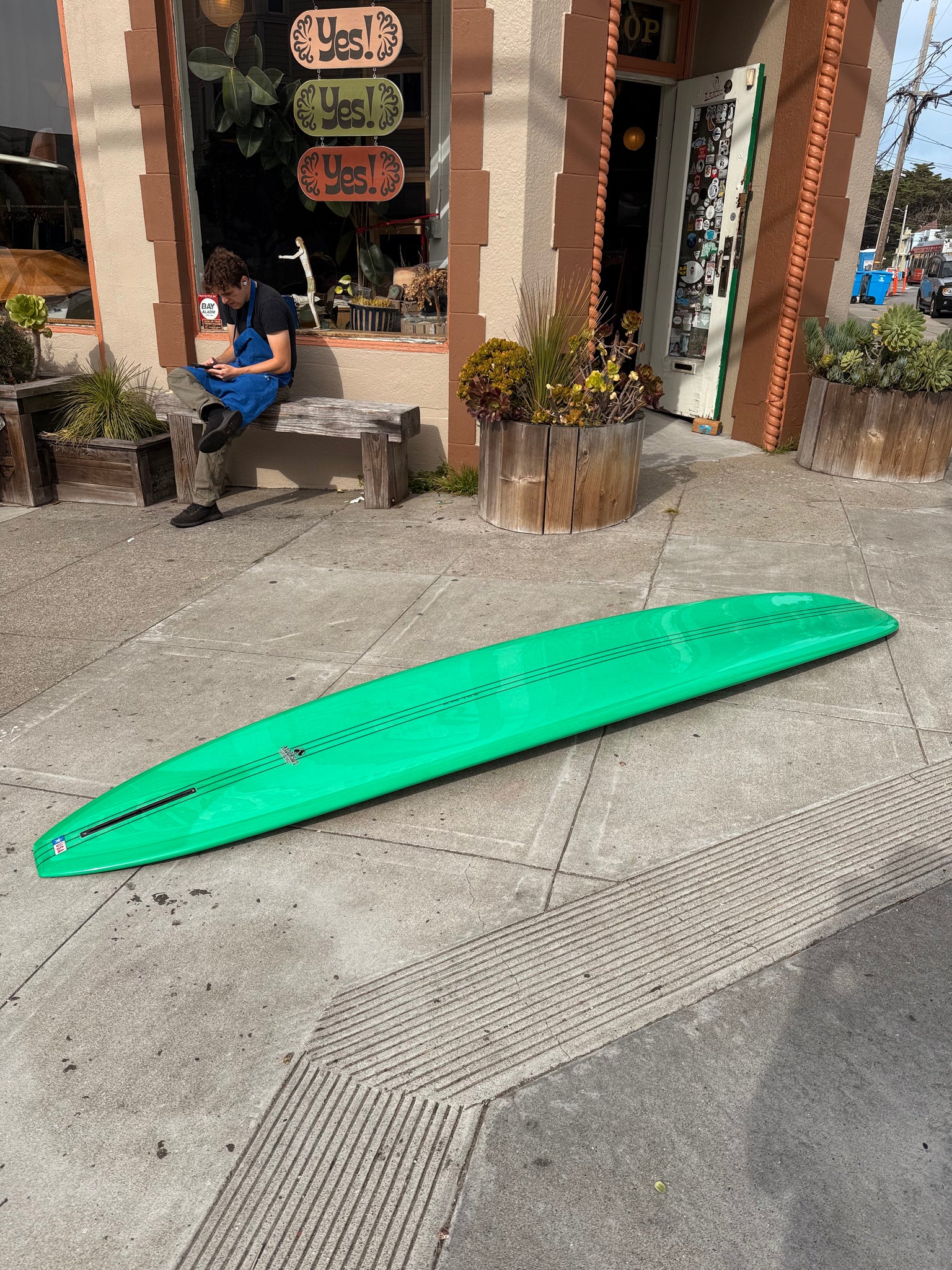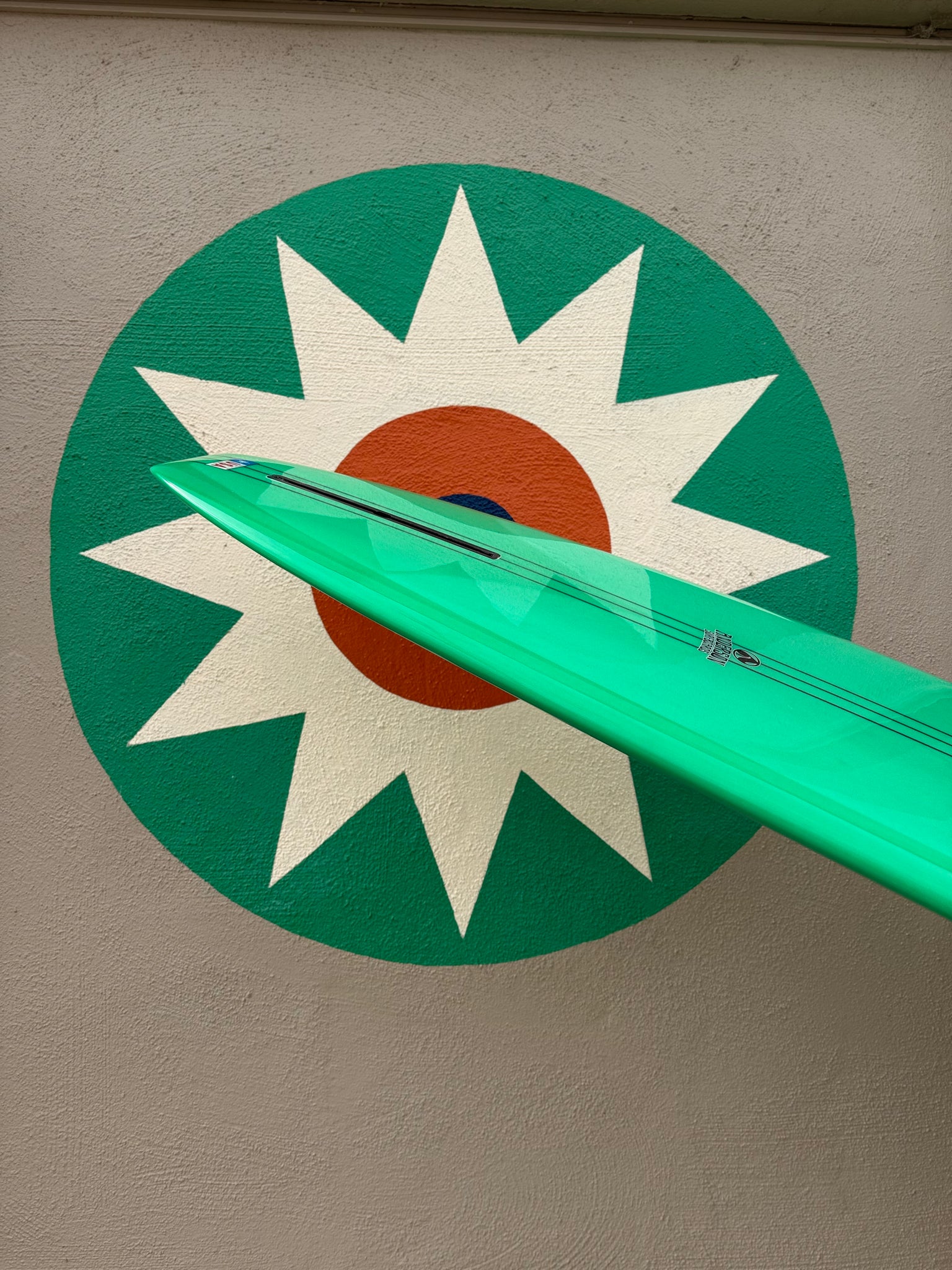 The board features a large 19" nose platform with a blended concave on the underside. The rails down the middle are fairly parallel and foiled for water sensitivity with a kick out the tail for those ultra long tip rides.