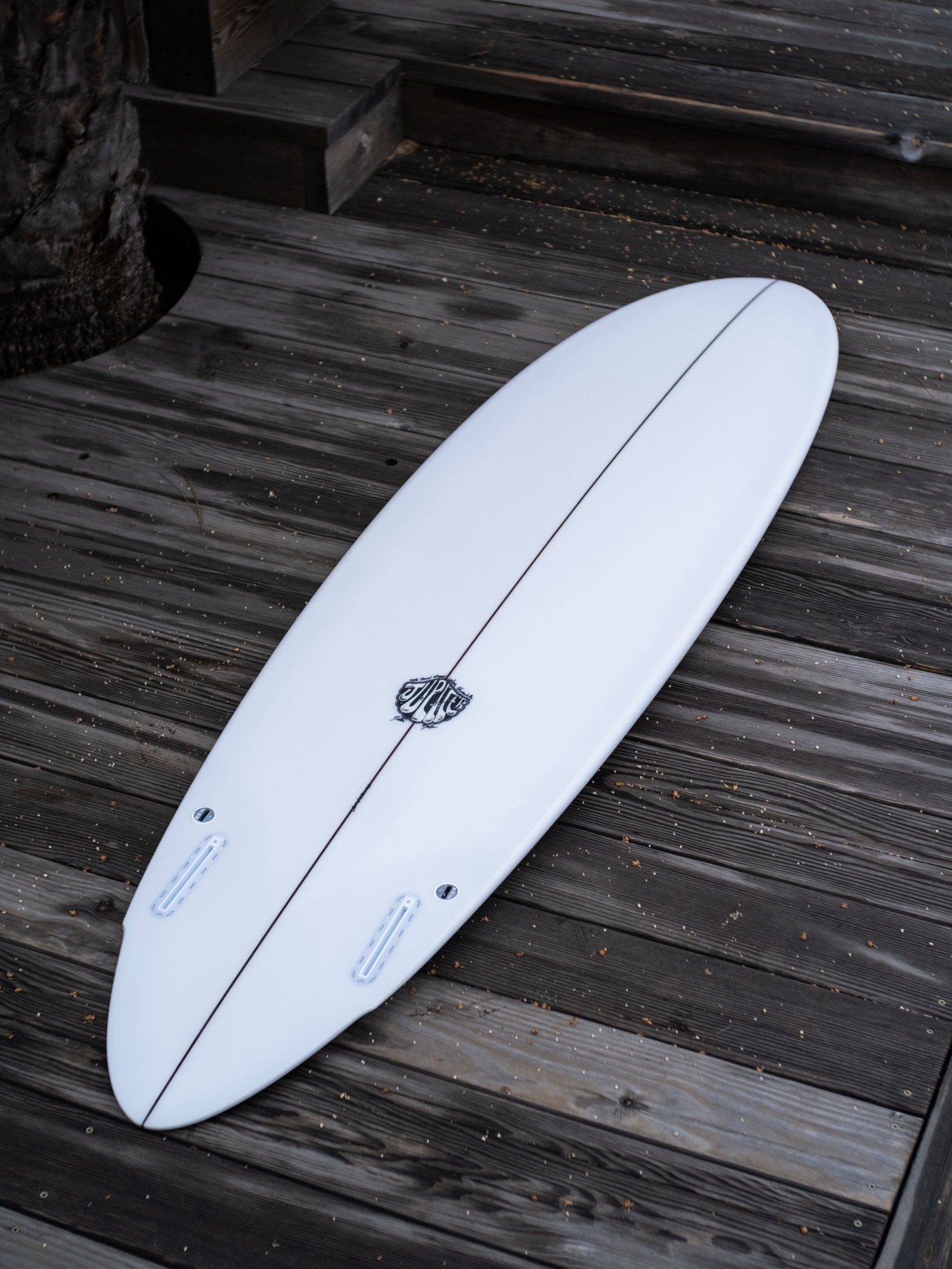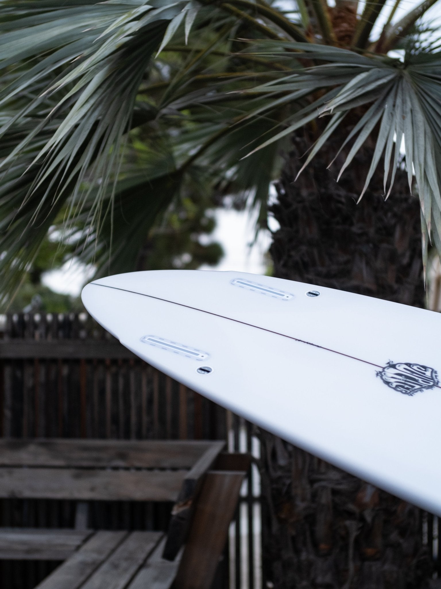 Winged round pin egg design with a twinzer fin setup. This is another one of my more versatile shapes. Easy to ride for beginners and still remains functional when the waves turn on. Balanced rocker with a bit of flip in the nose. Down rails with a tucked hard edge in the tail. Bottom shape is flat under the nose transitioning to a double concave through the middle that blends into spiral V out of the tail. A perfect option for clean waist to chest high + trimming.