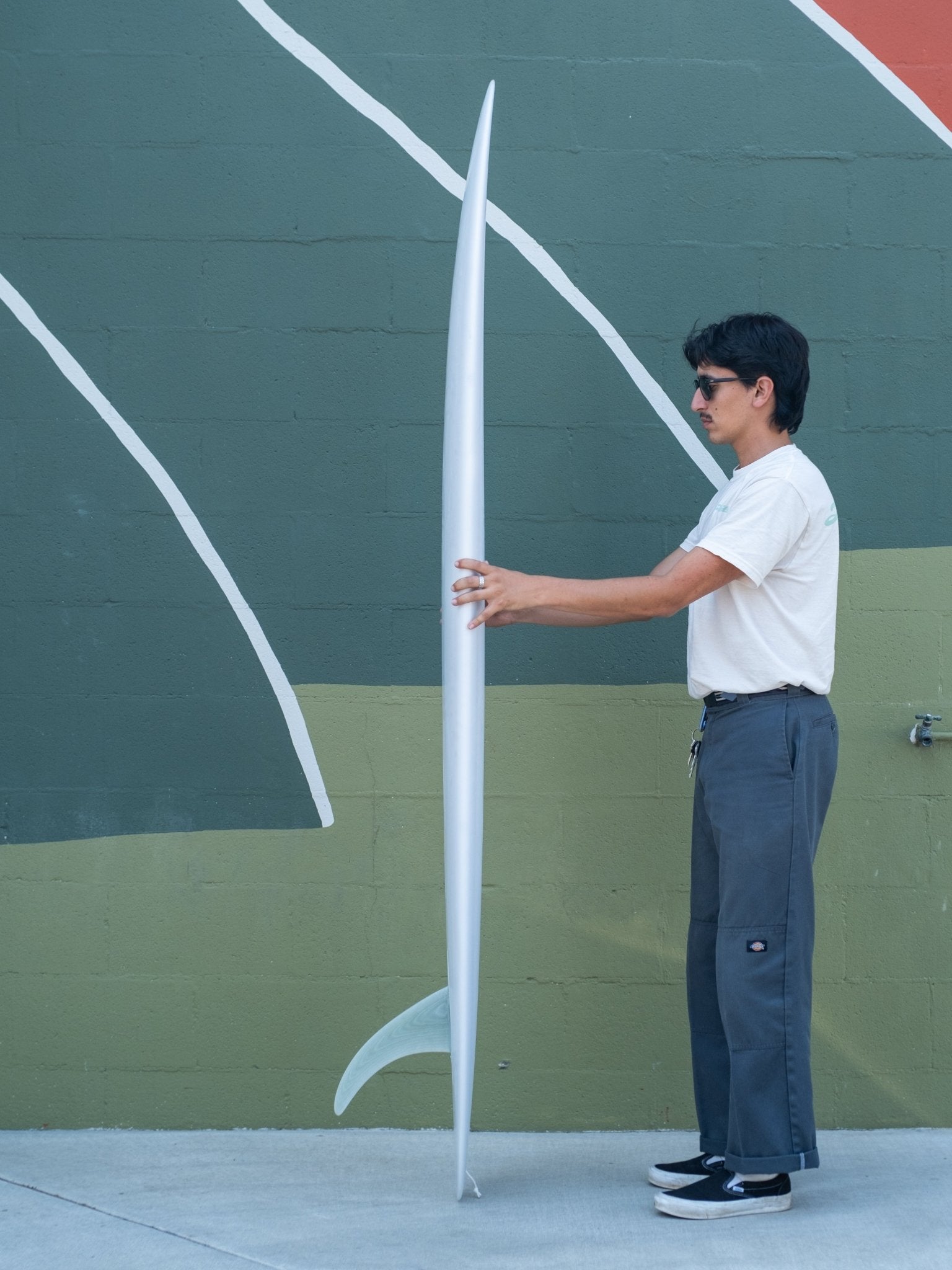 This is Greg Liddle's personal shape! The displacement hull runs the entire length of the board and holds the shape of its convexity from nose all the way until about the last third of the board where the roll starts to flatten out slightly.