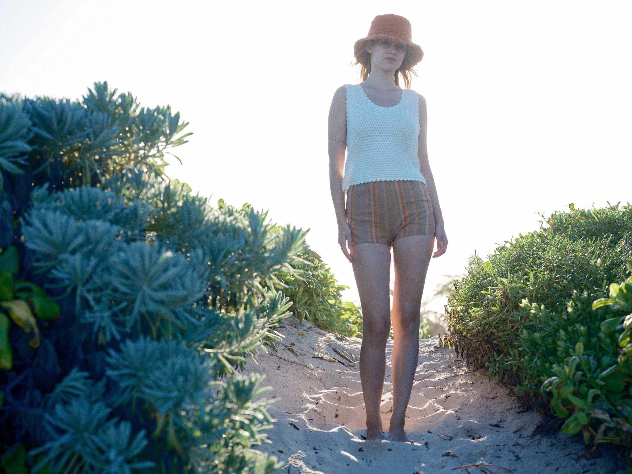 Wear these on beach days when the sun is out and your skin is salty. Perfect for ice-cream cones and boardwalk bike rides. There is a little hidden elastic under the tush that gives them their cute rounded shape. Jasmine is 6' tall and wearing size Small. Amber is 5' 9" tall and wearing size Extra Small.