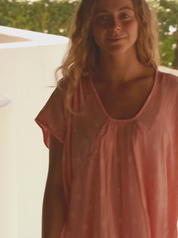 A free and easy dress to throw on over a bikini or for a summer gathering. In a cotton crepe gauze with fun jacquard polka dots. Size 1 fits Extra Small and Small, size 2 fits Medium and Large. Alanna is 5'6" tall and wearing size 1.