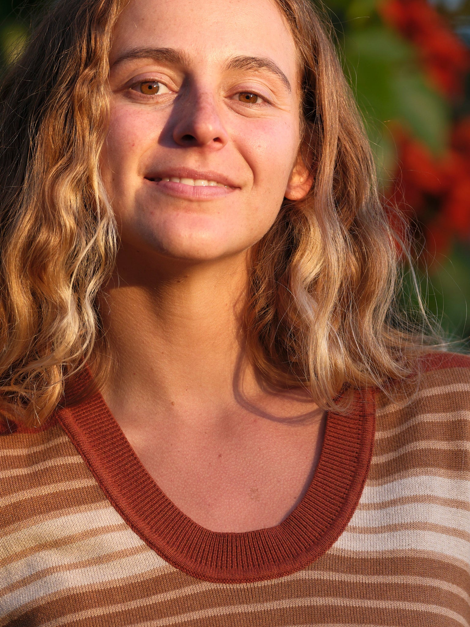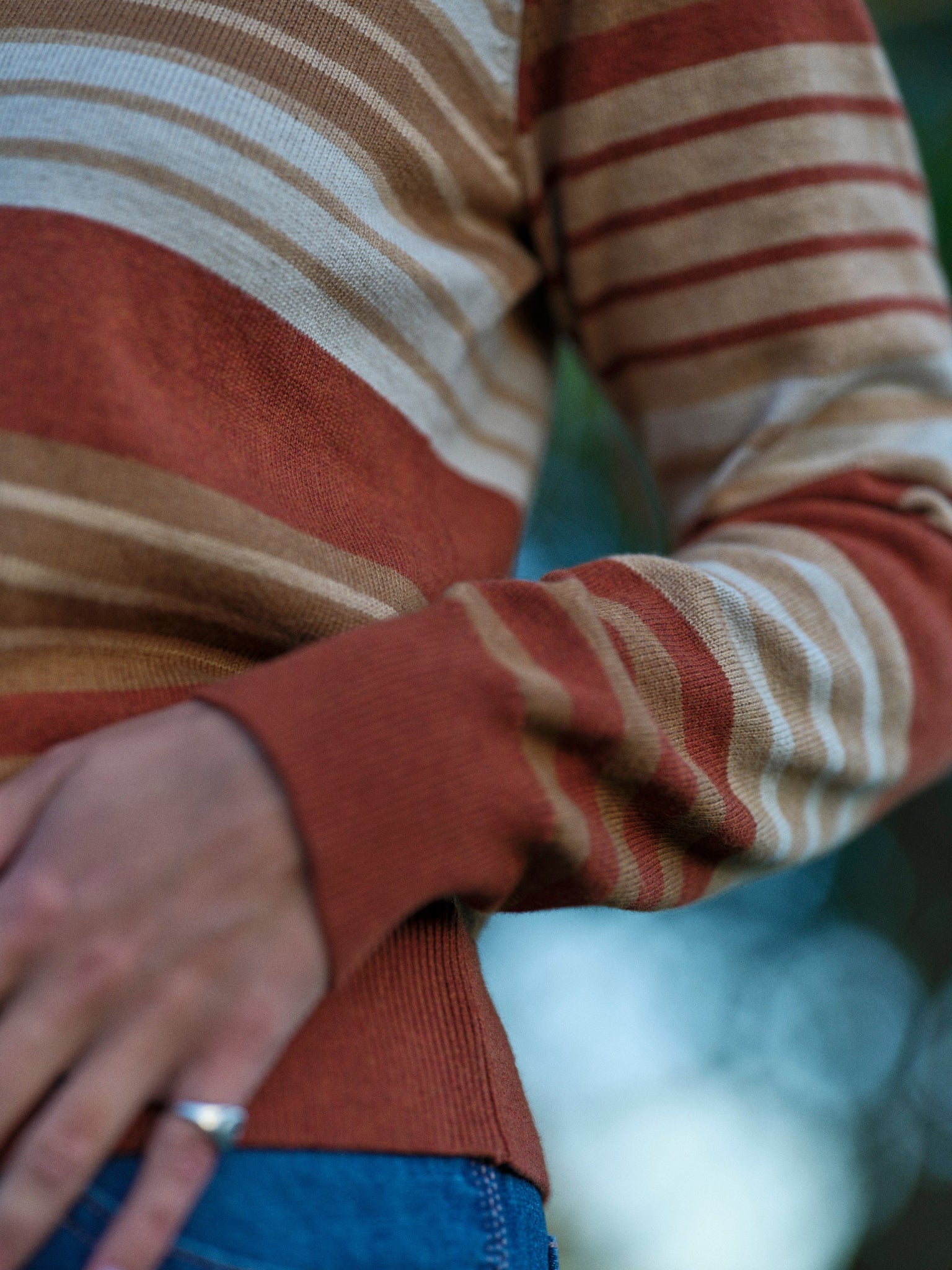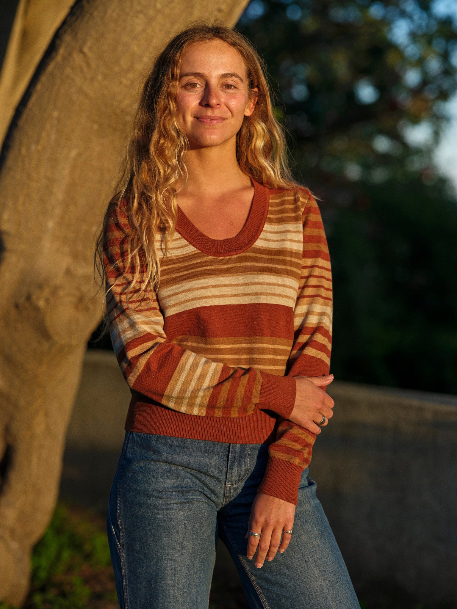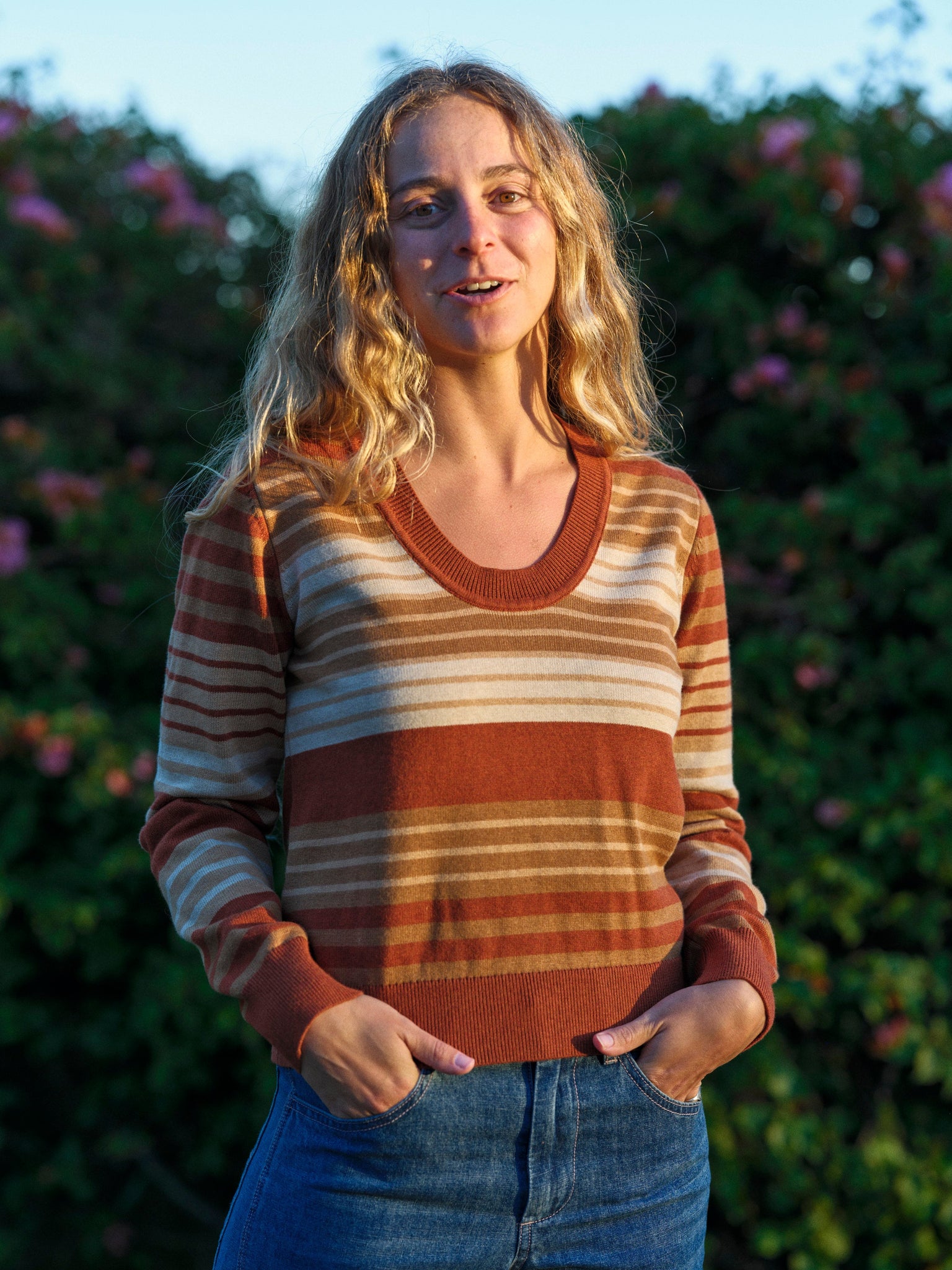 The perfect vintage-inspired sweater to wear with jeans. Cotton yarn with a touch of cashmere is soft against your skin, or layer it over a collared shirt. It has brown stripes and a rounded V-neck reminiscent of University Club style.