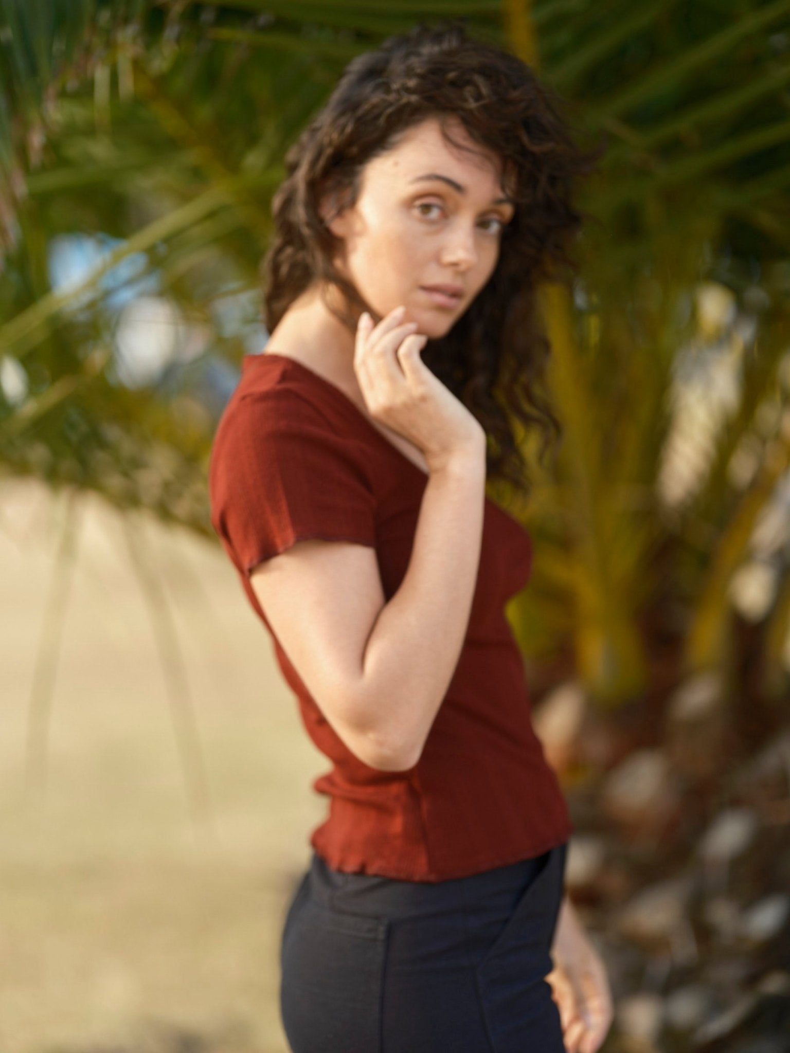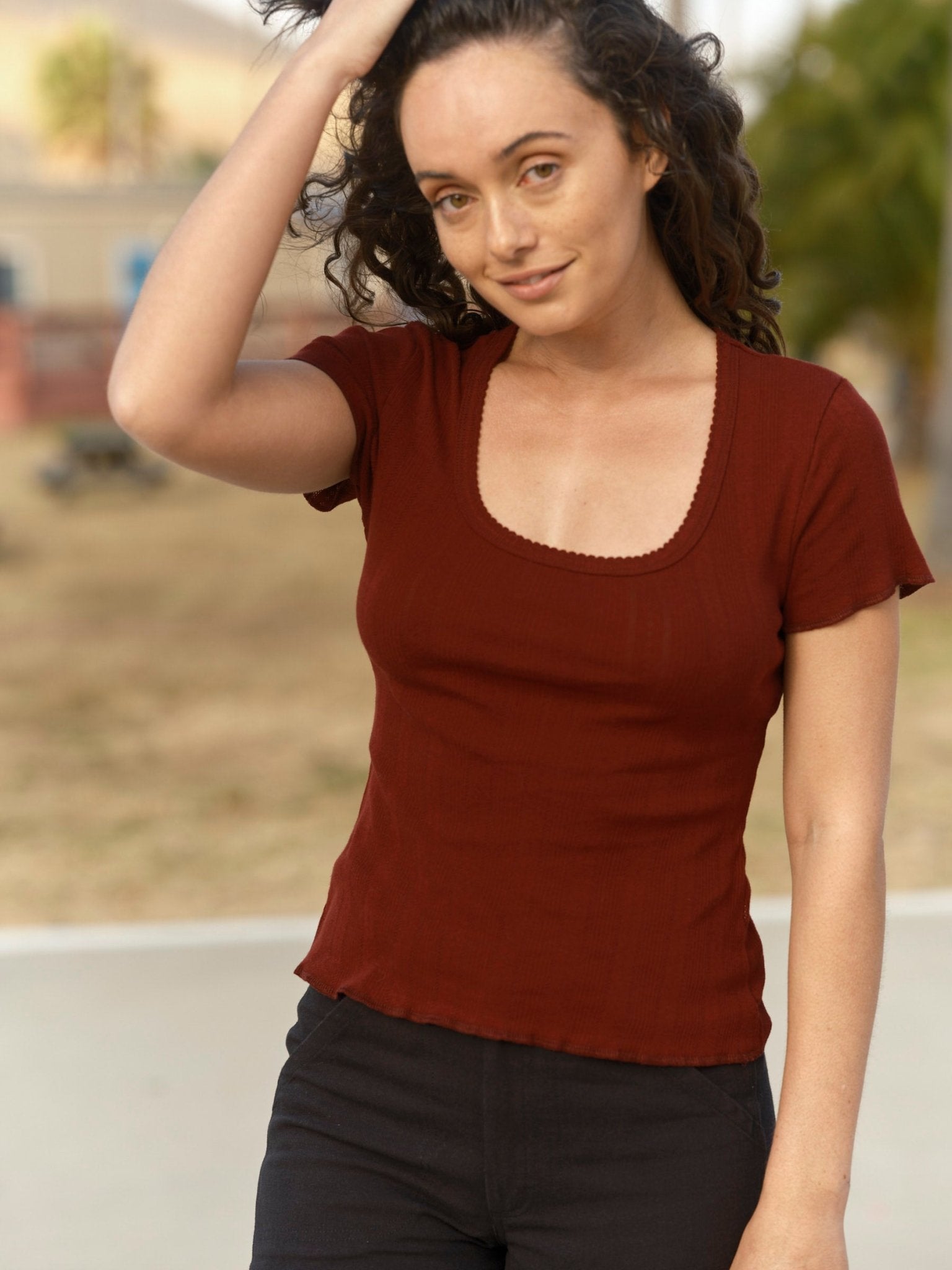 An elevated basic for all occasions. This tee is made from a delicate pointelle rib fabric that stretches for a perfect fit, features a flattering scoop neck, and ruffled finishes. Rayana is 5'9" tall and wearing size S.