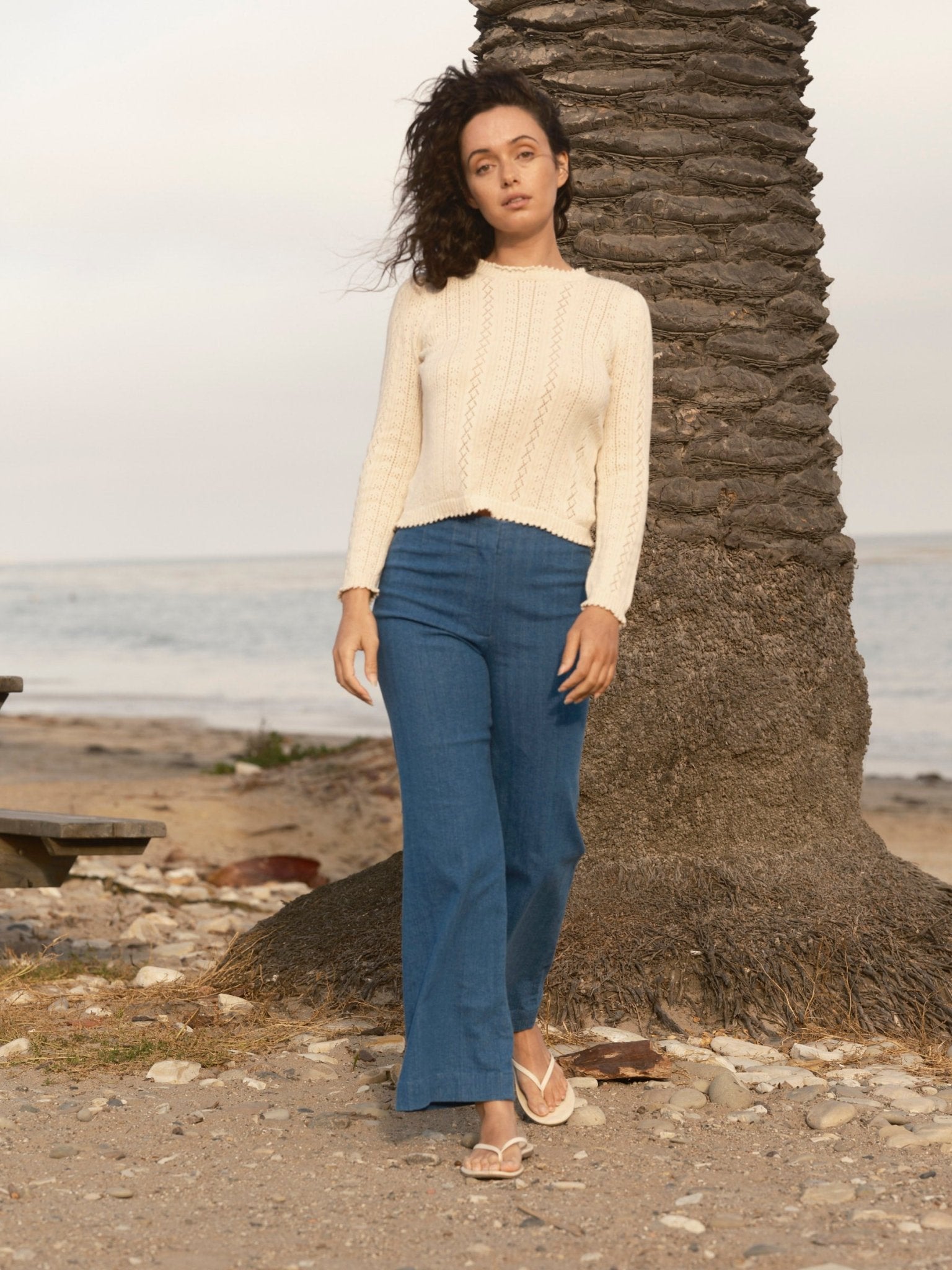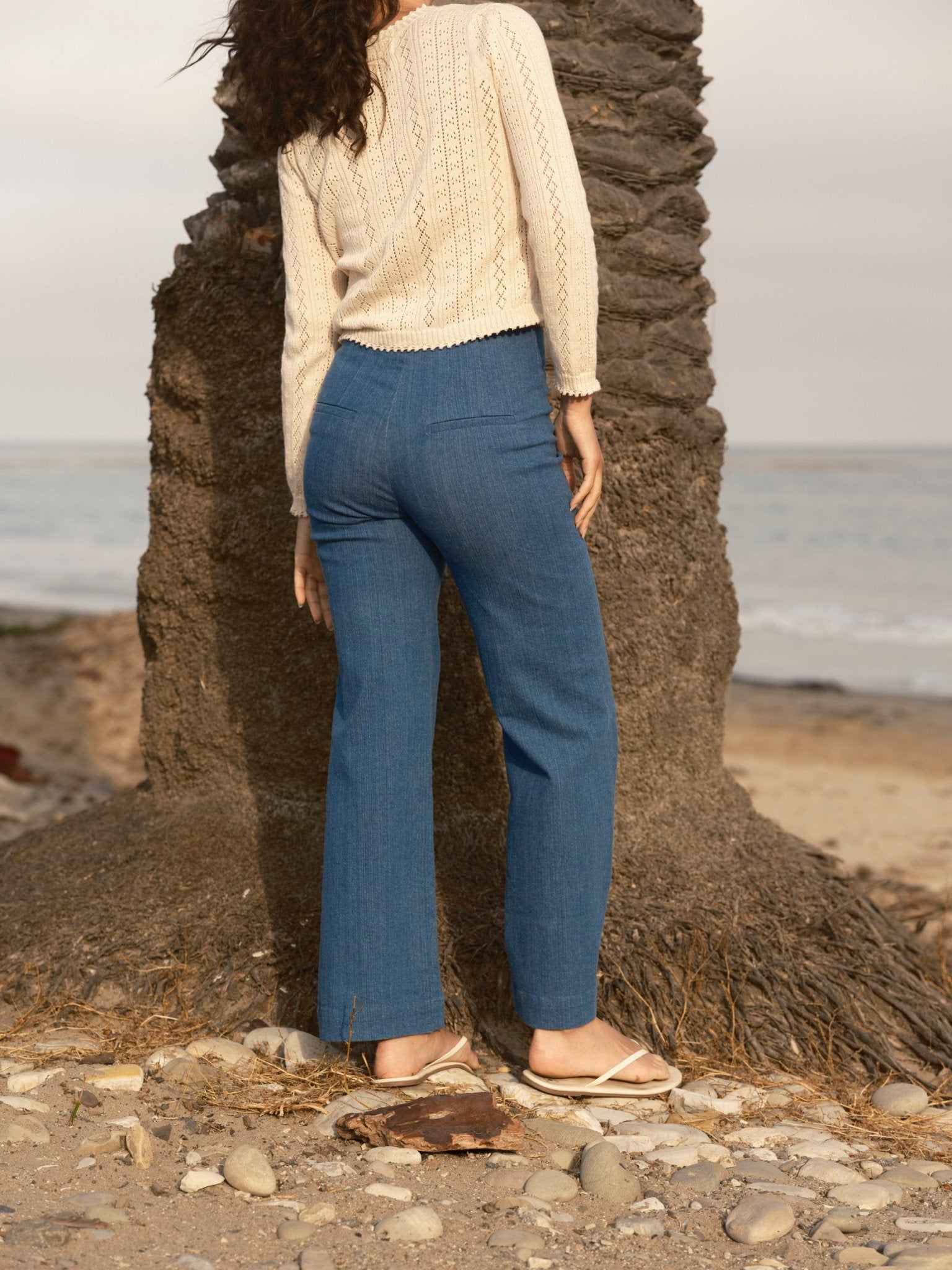 Willow Pants have clean lines and long, wide legs for a flattering, elongating silhouette. In a textured stretch denim with a high waist and flowing legs that flare slightly from the hip down.
