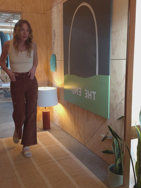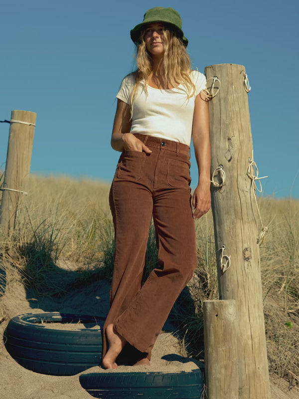The cut is inspired by vintage sailor jeans and the fabric is a stretchy brown corduroy. With four patch pockets, a high waist, and a little flare, these are for fun.