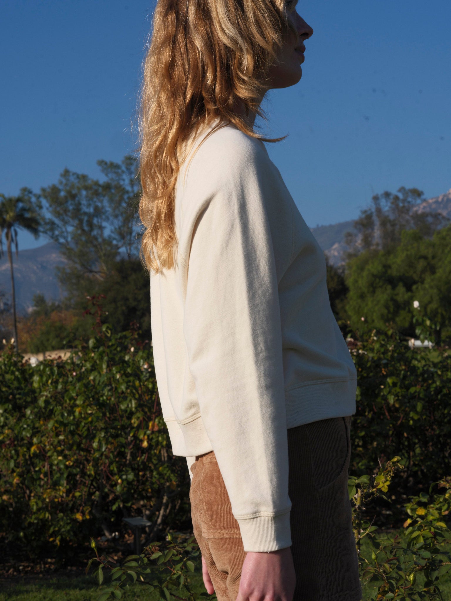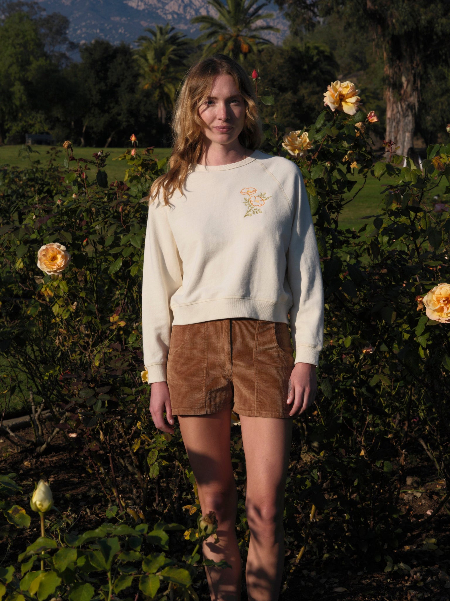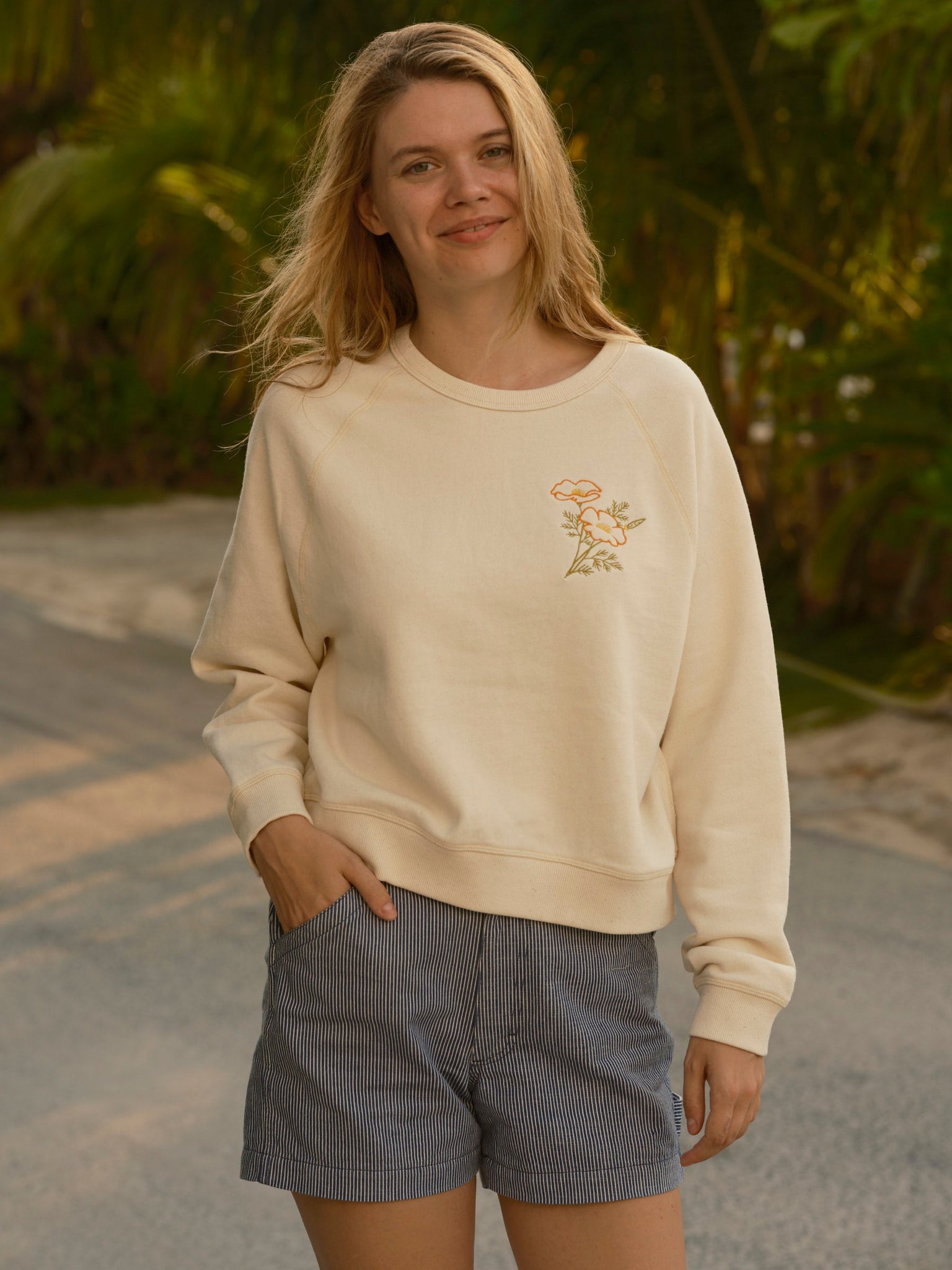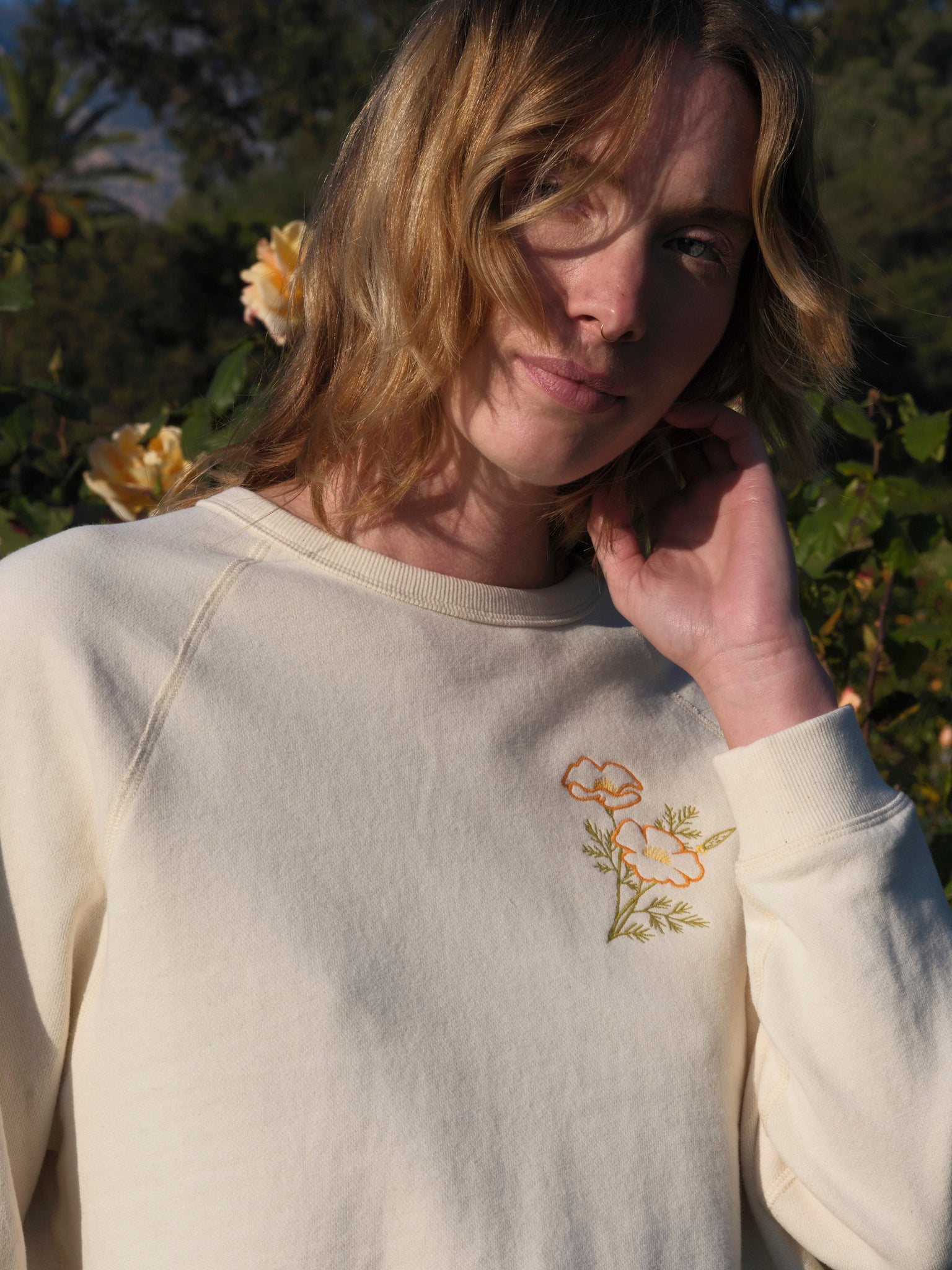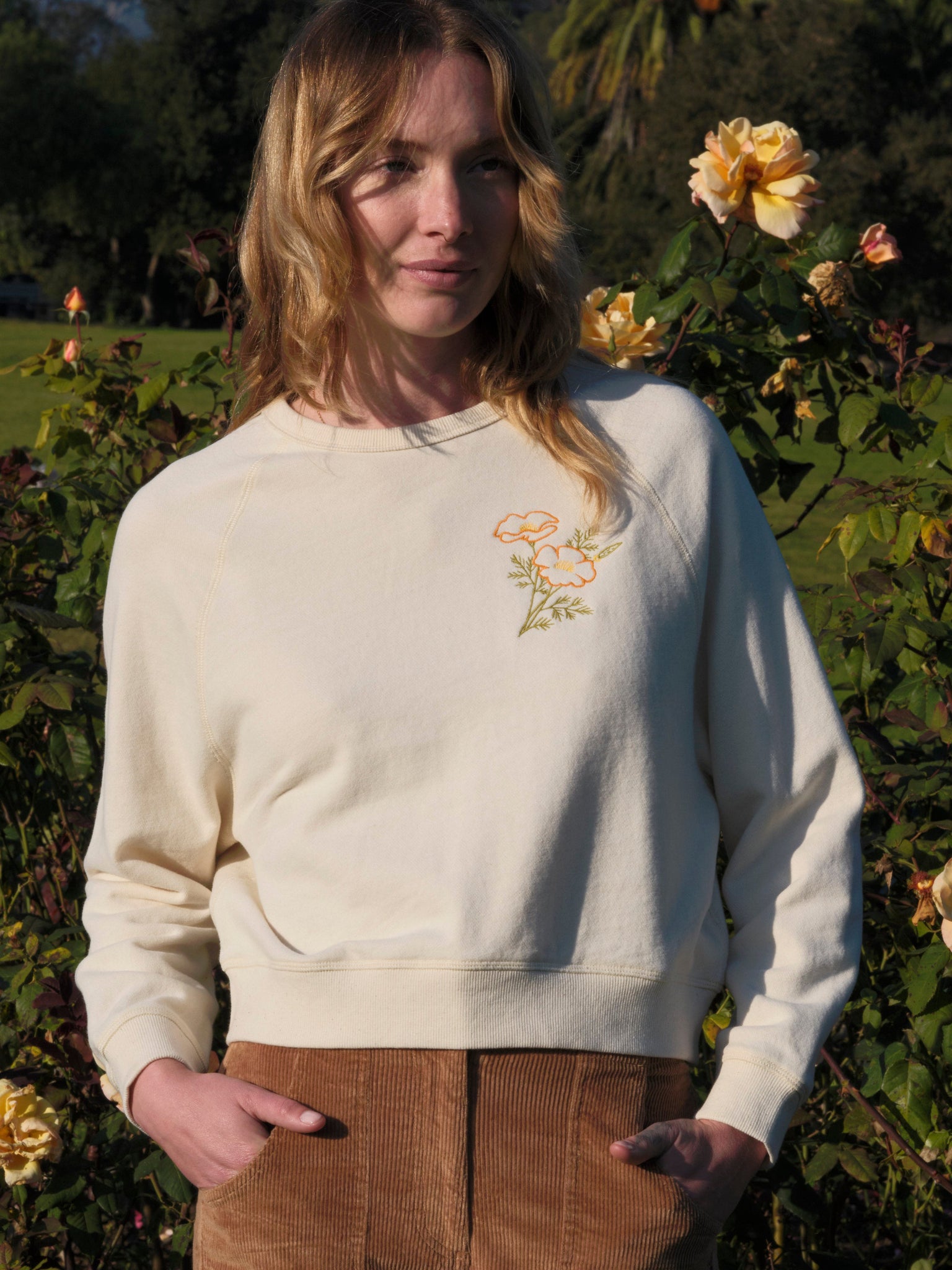 This perfect sweatshirt has a relaxed fit, soft peached French terry, and embroidered sunny California Poppies. Karli is 5' 9" tall and wearing size XS. Amber is 5' 9" and wearing S.