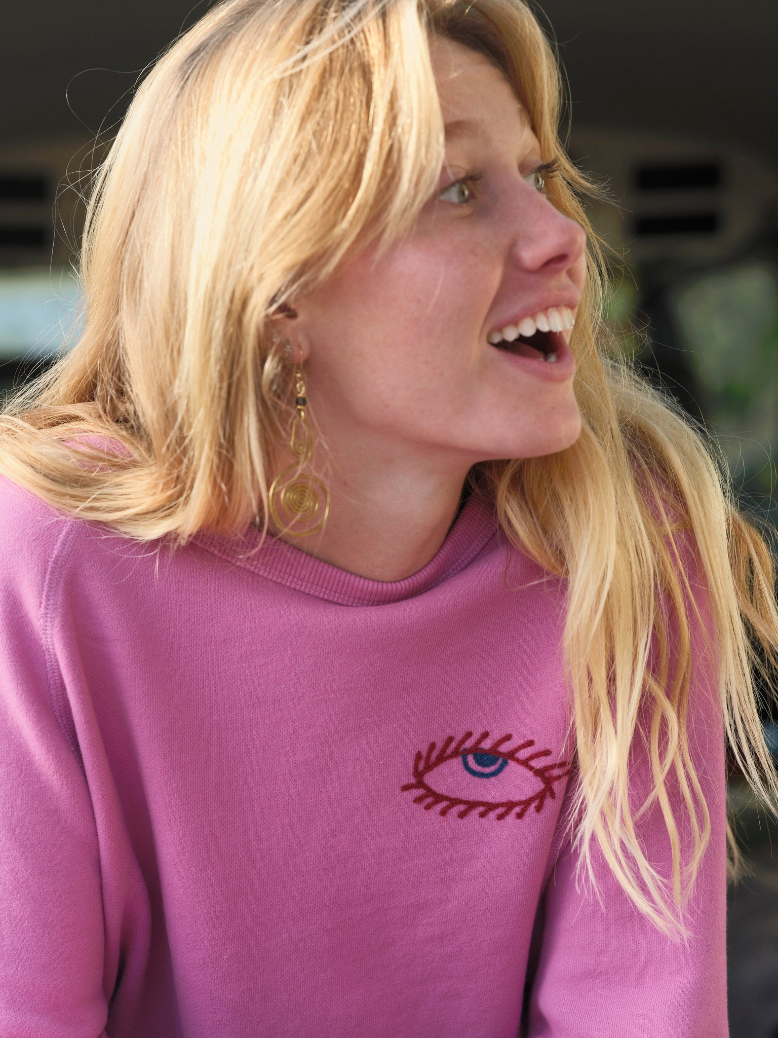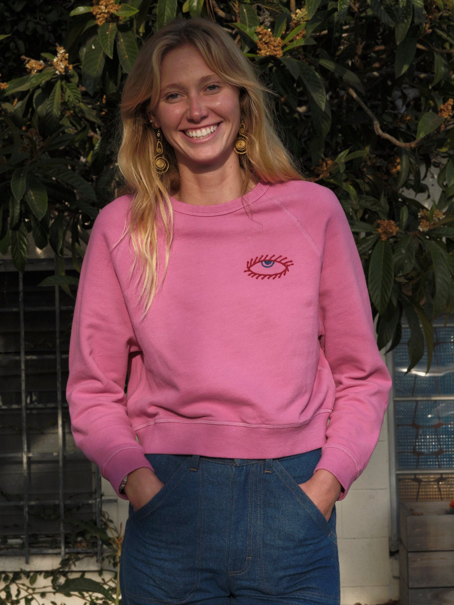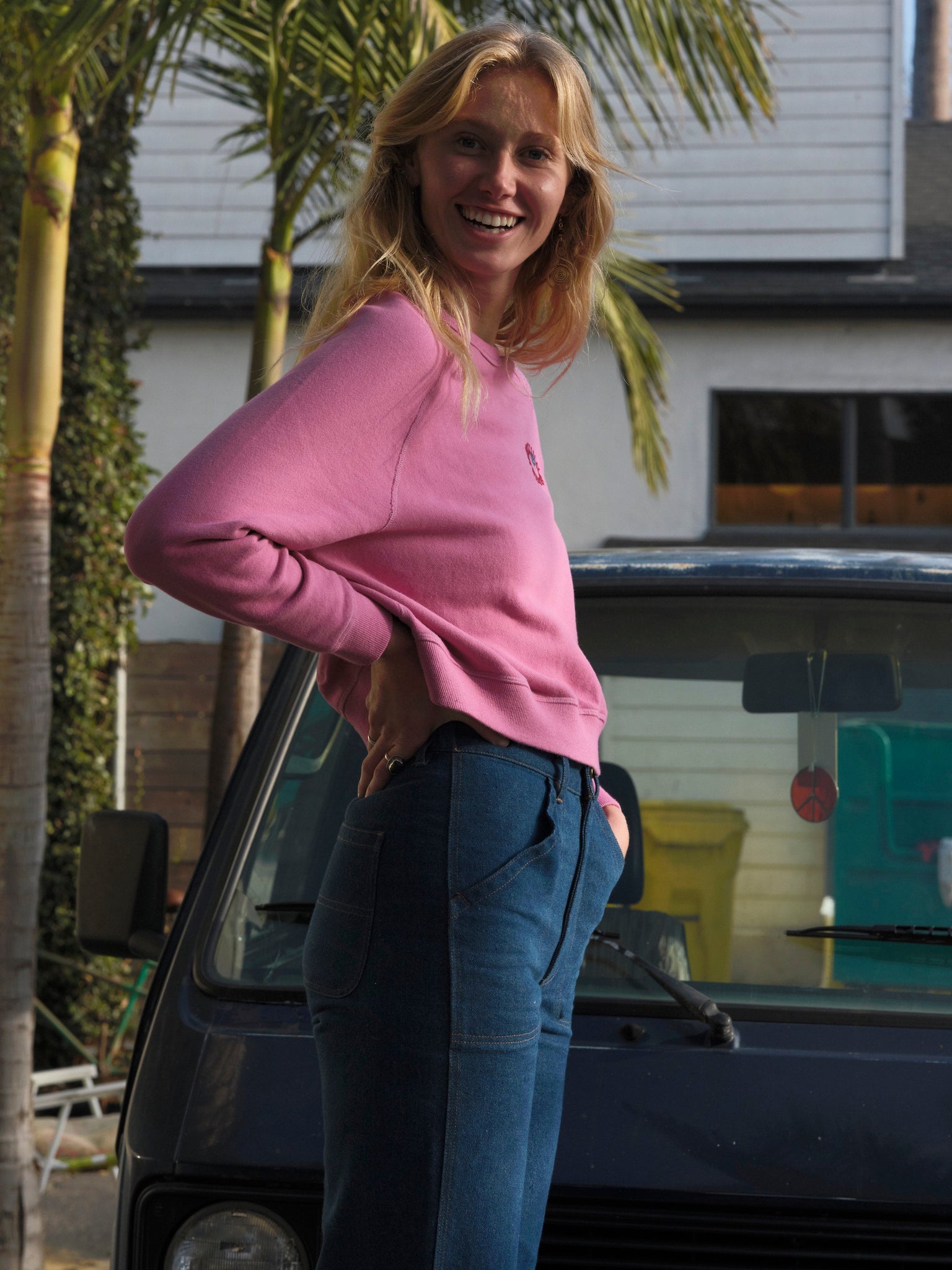 Relaxed fit, a vibrant color, and embroidery for entering enlightenment. India is 6' tall and wearing size S.