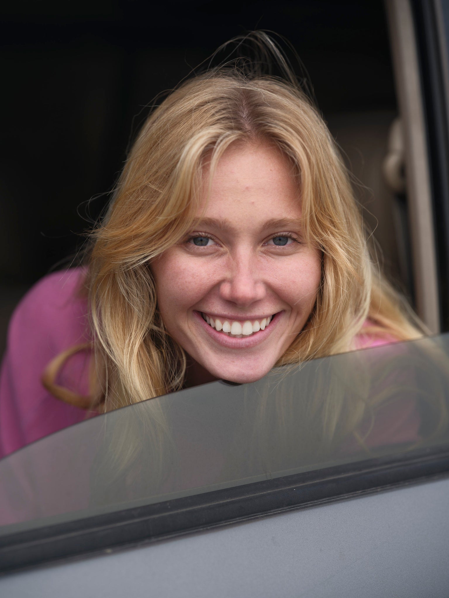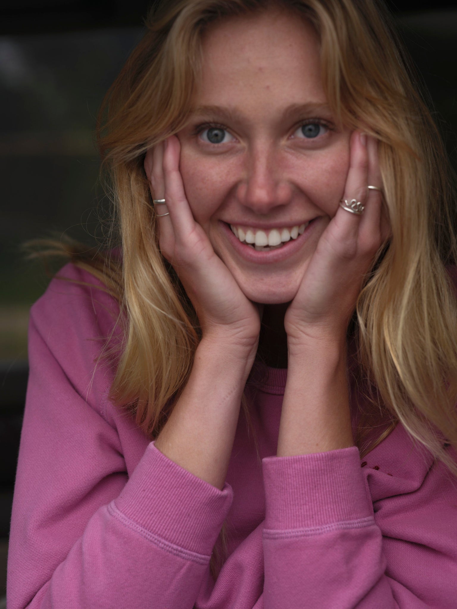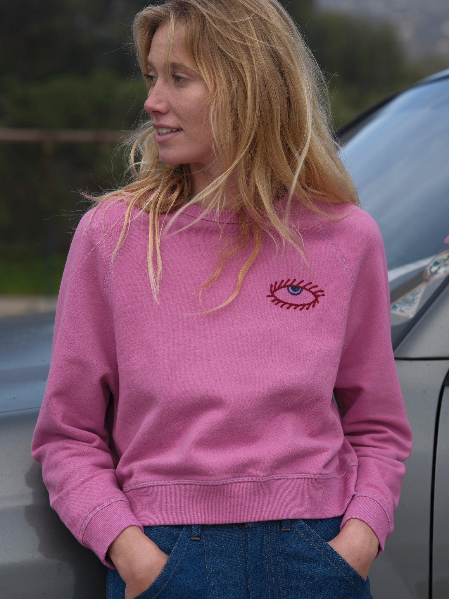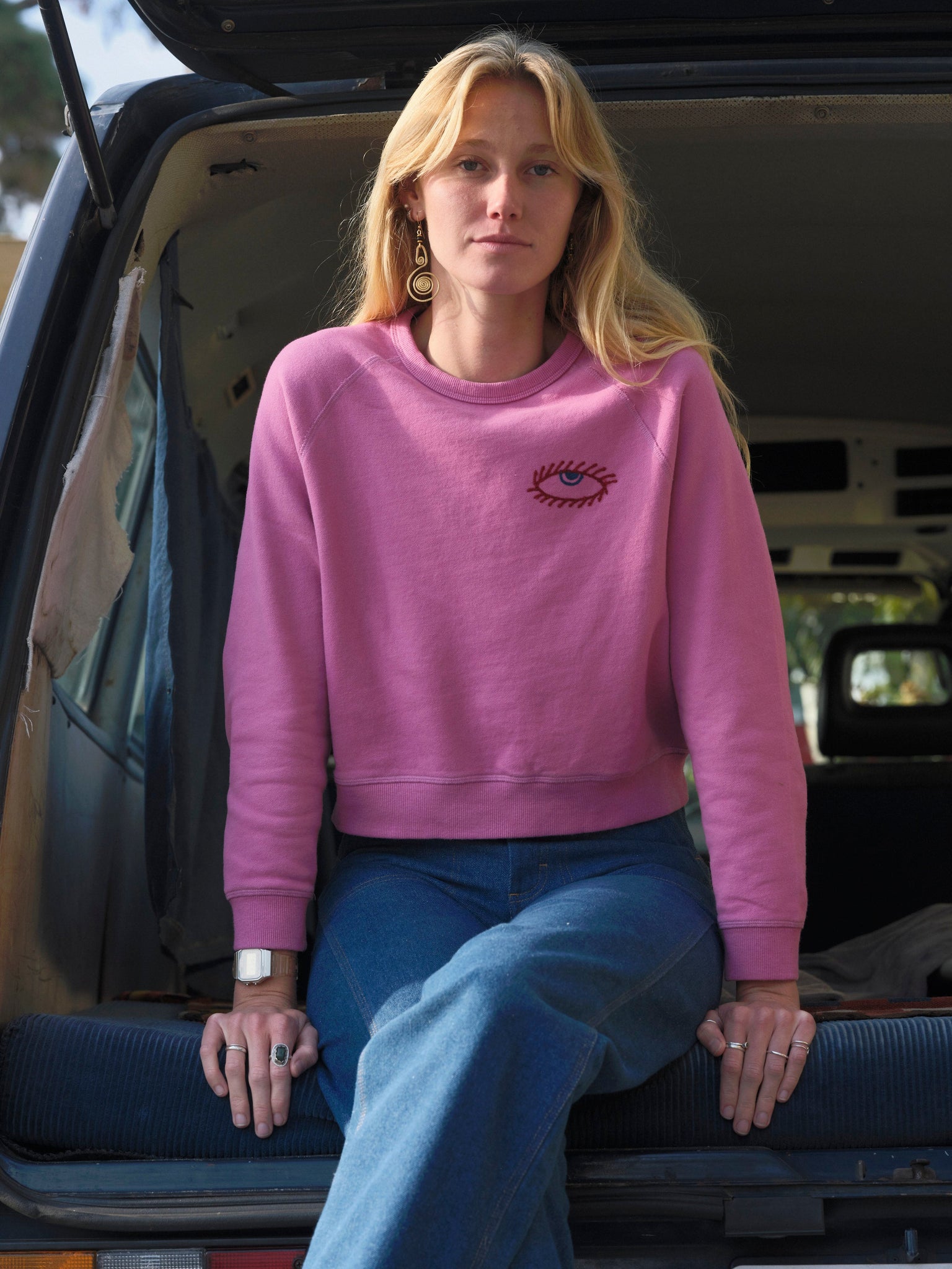 Relaxed fit, a vibrant color, and embroidery for entering enlightenment. India is 6' tall and wearing size S.