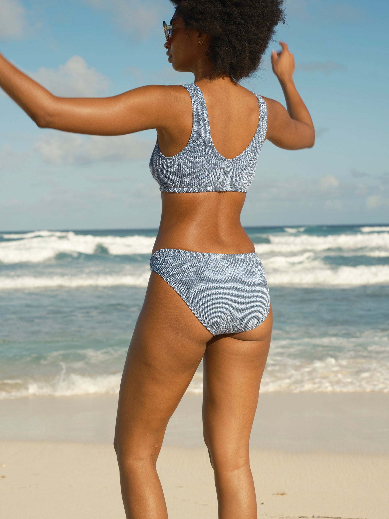 A classic 80's style that stretches to your body for a perfect fit. Now with micro stripes knitted into the crinkle-stretch fabric for a beautiful two-tone effect that is reminiscent of denim. All our Ripple styles are super comfortable with no side-seams because they're made with tubular knitting.