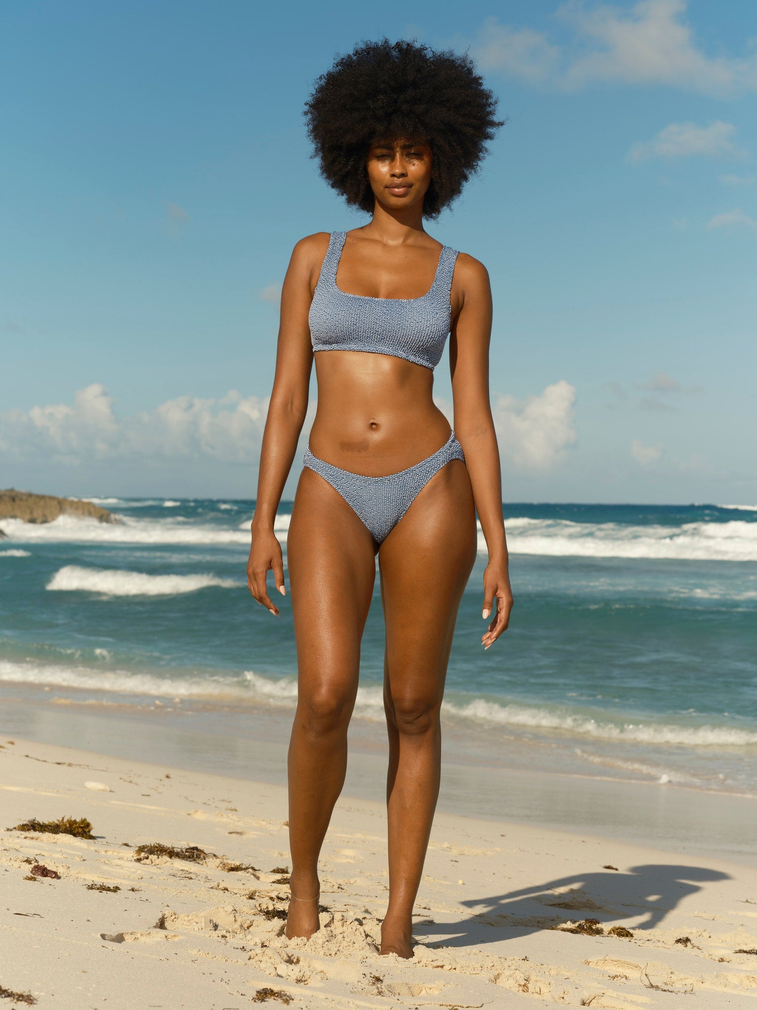 A classic 80's style that stretches to your body for a perfect fit. Now with micro stripes knitted into the crinkle-stretch fabric for a beautiful two-tone effect that is reminiscent of denim. All our Ripple styles are super comfortable with no side-seams because they're made with tubular knitting. The scoop can be worn in front or in back.