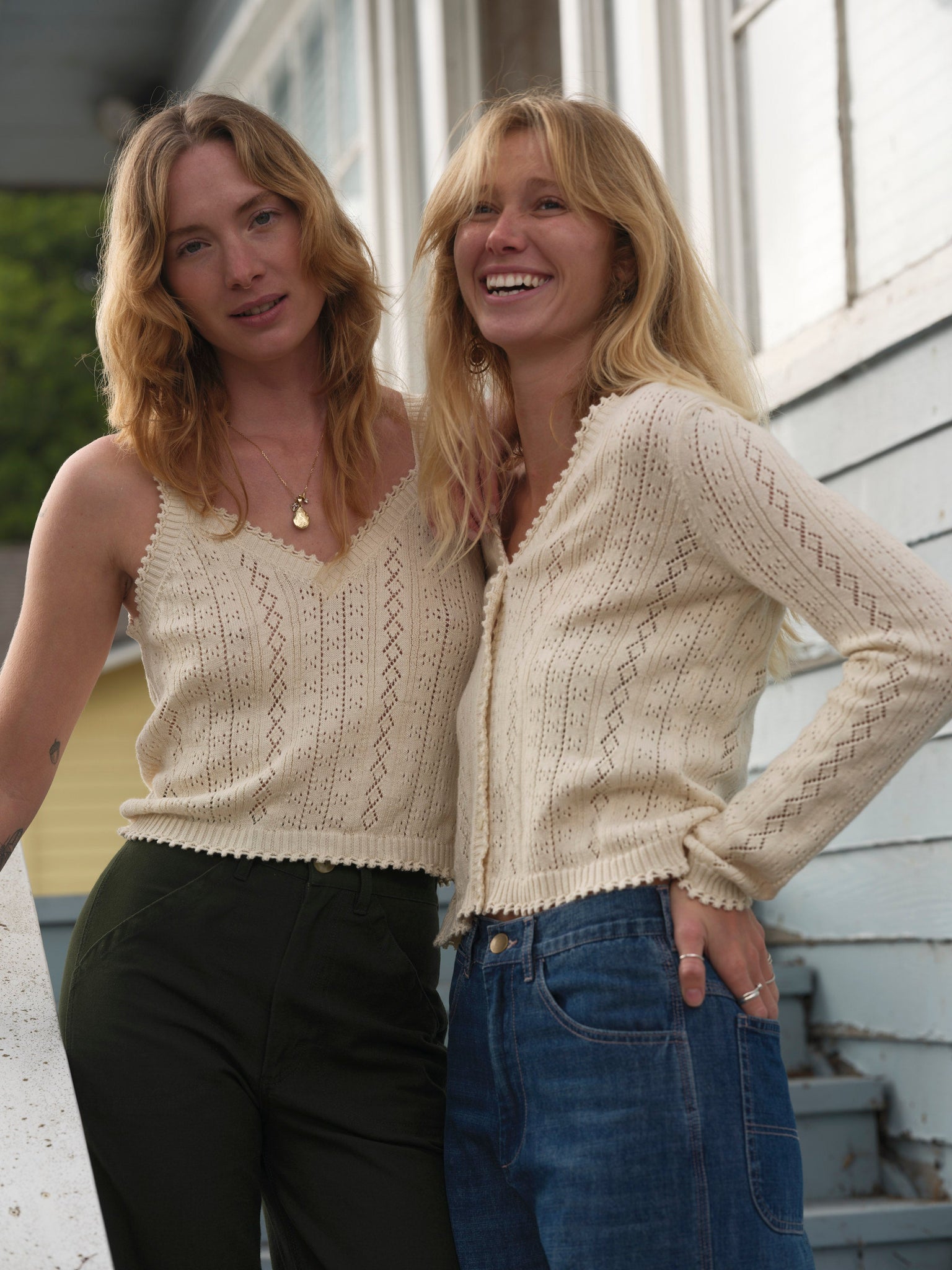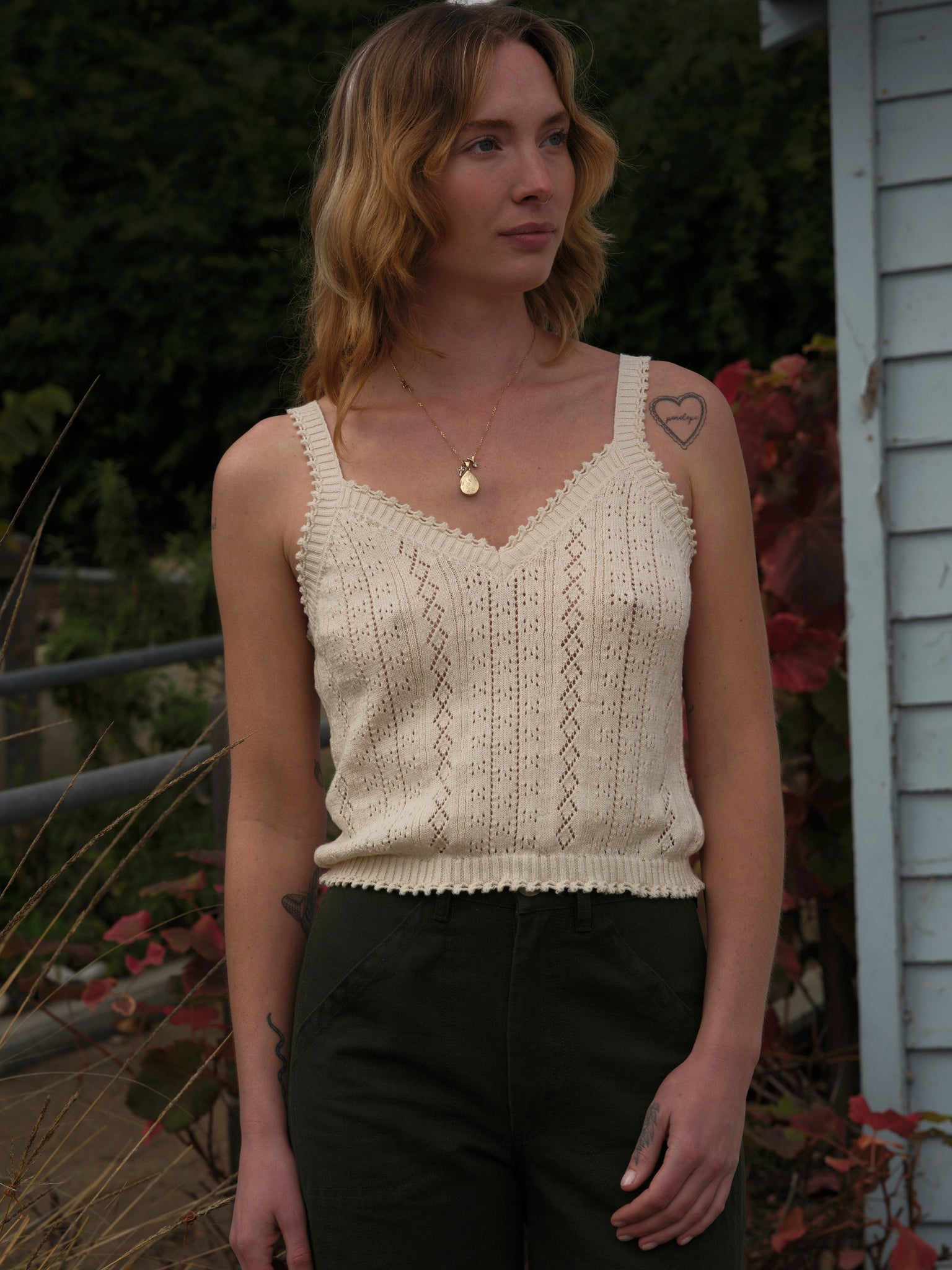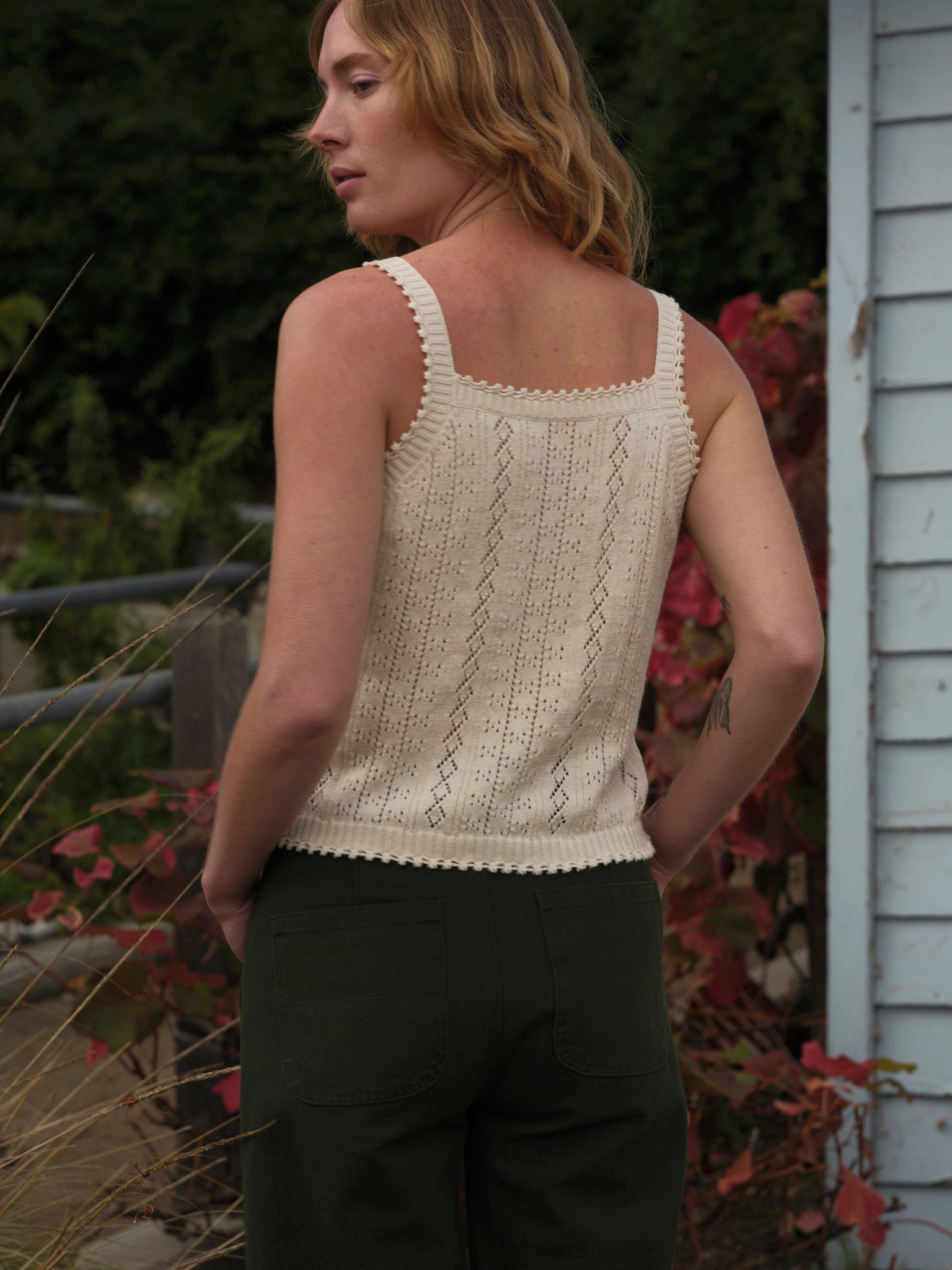 Pointelle knitting paired with scalloped crochet edges creates an heirloom quality piece that feels both nostalgic and contemporary. Wear it on its own or pair it with the Juliette Cardigan for an elevated, timeless look. Karli is 5' 9" tall and wearing size S.