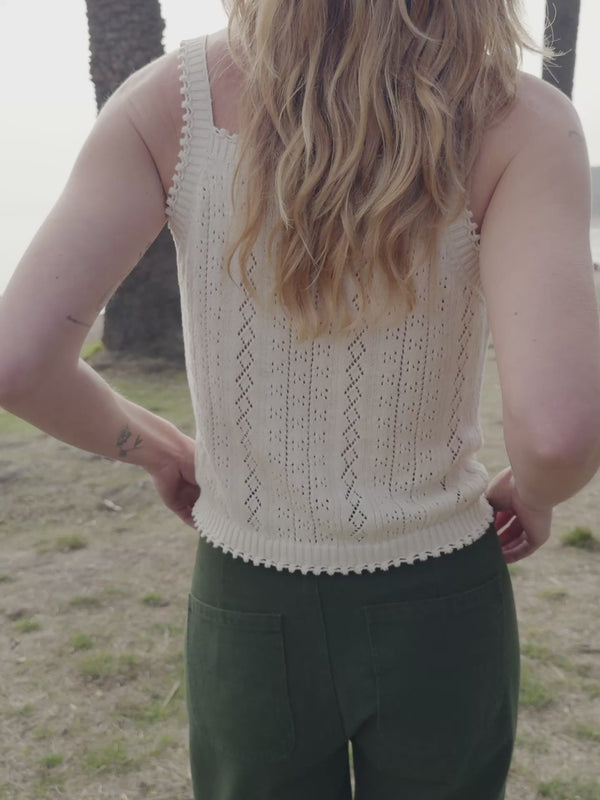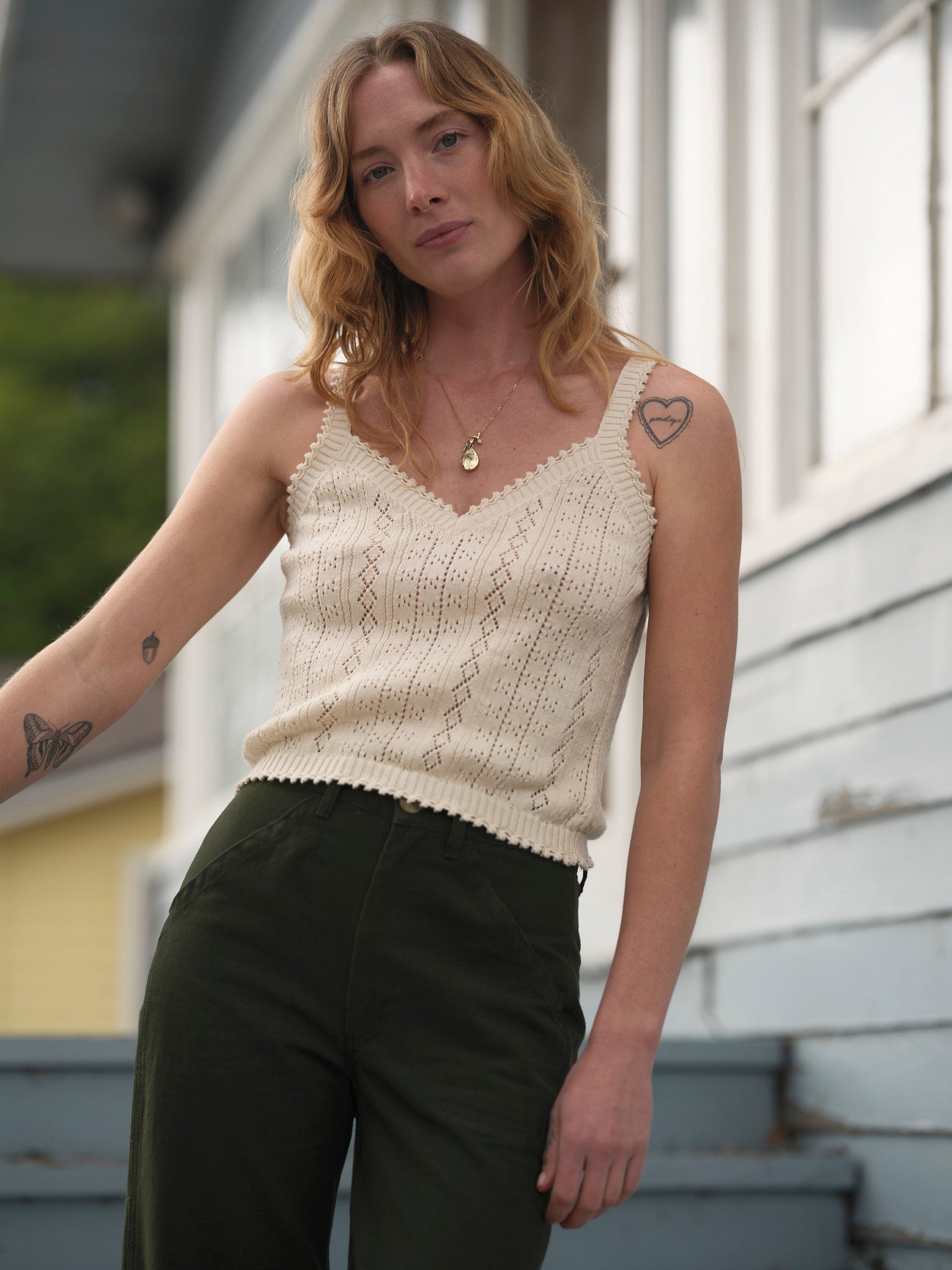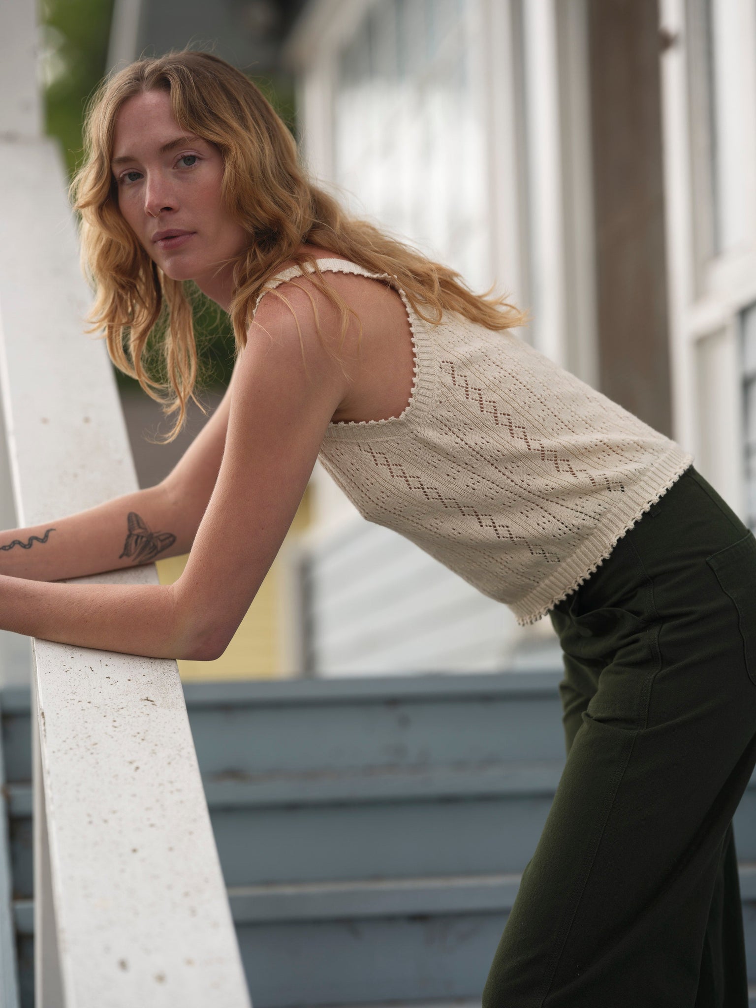 Pointelle knitting paired with scalloped crochet edges creates an heirloom quality piece that feels both nostalgic and contemporary. Wear it on its own or pair it with the Juliette Cardigan for an elevated, timeless look. Karli is 5' 9" tall and wearing size S.