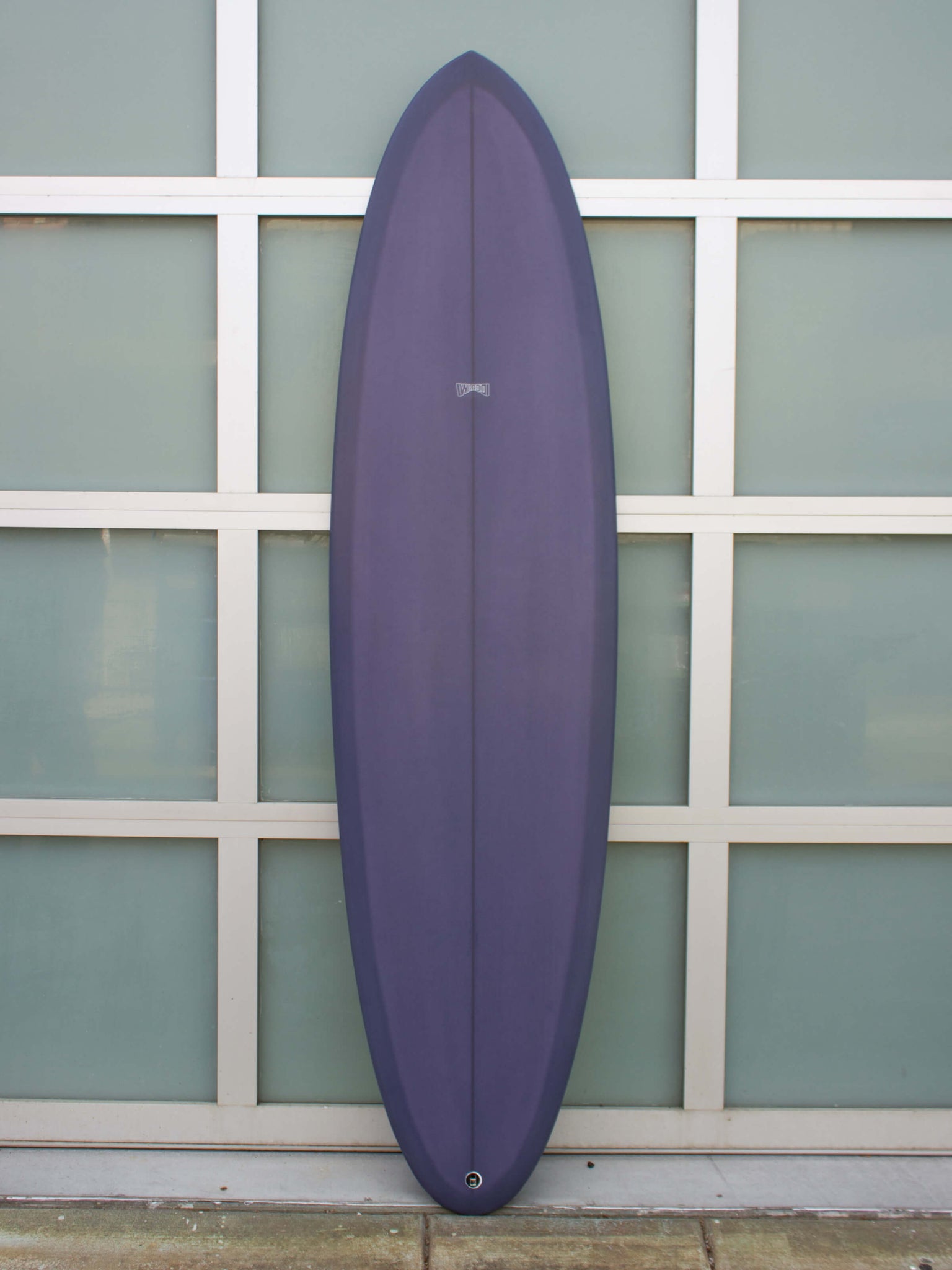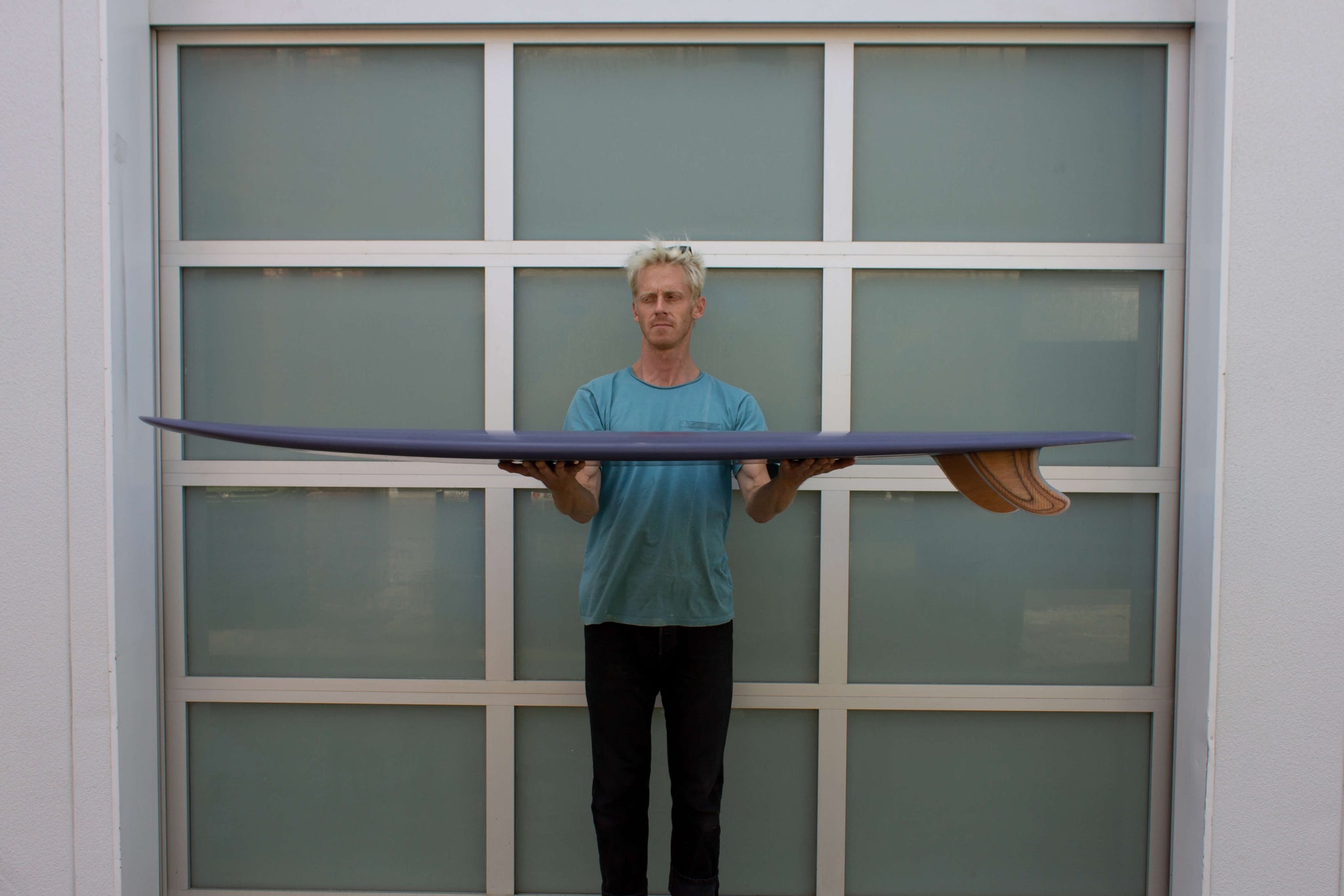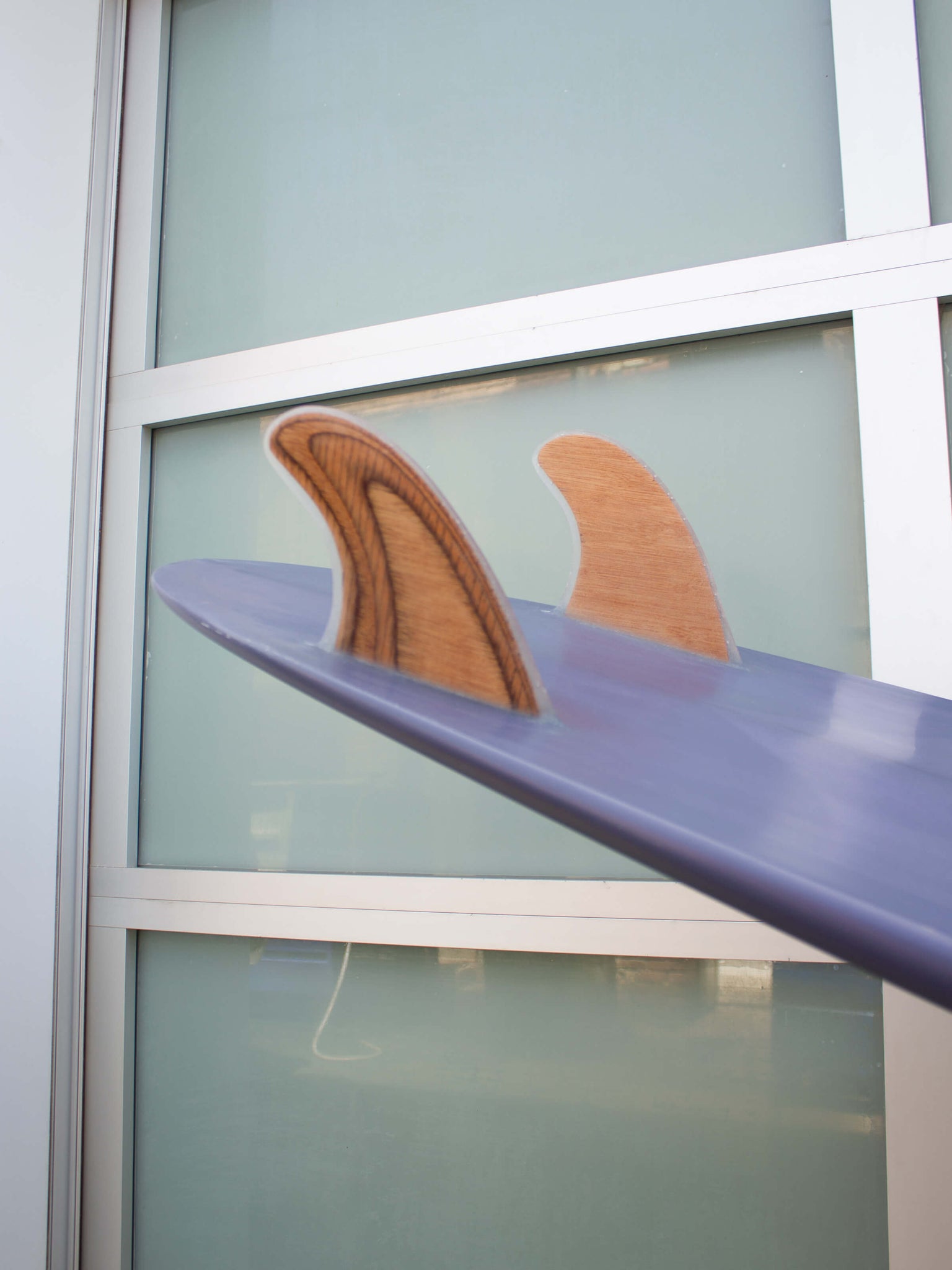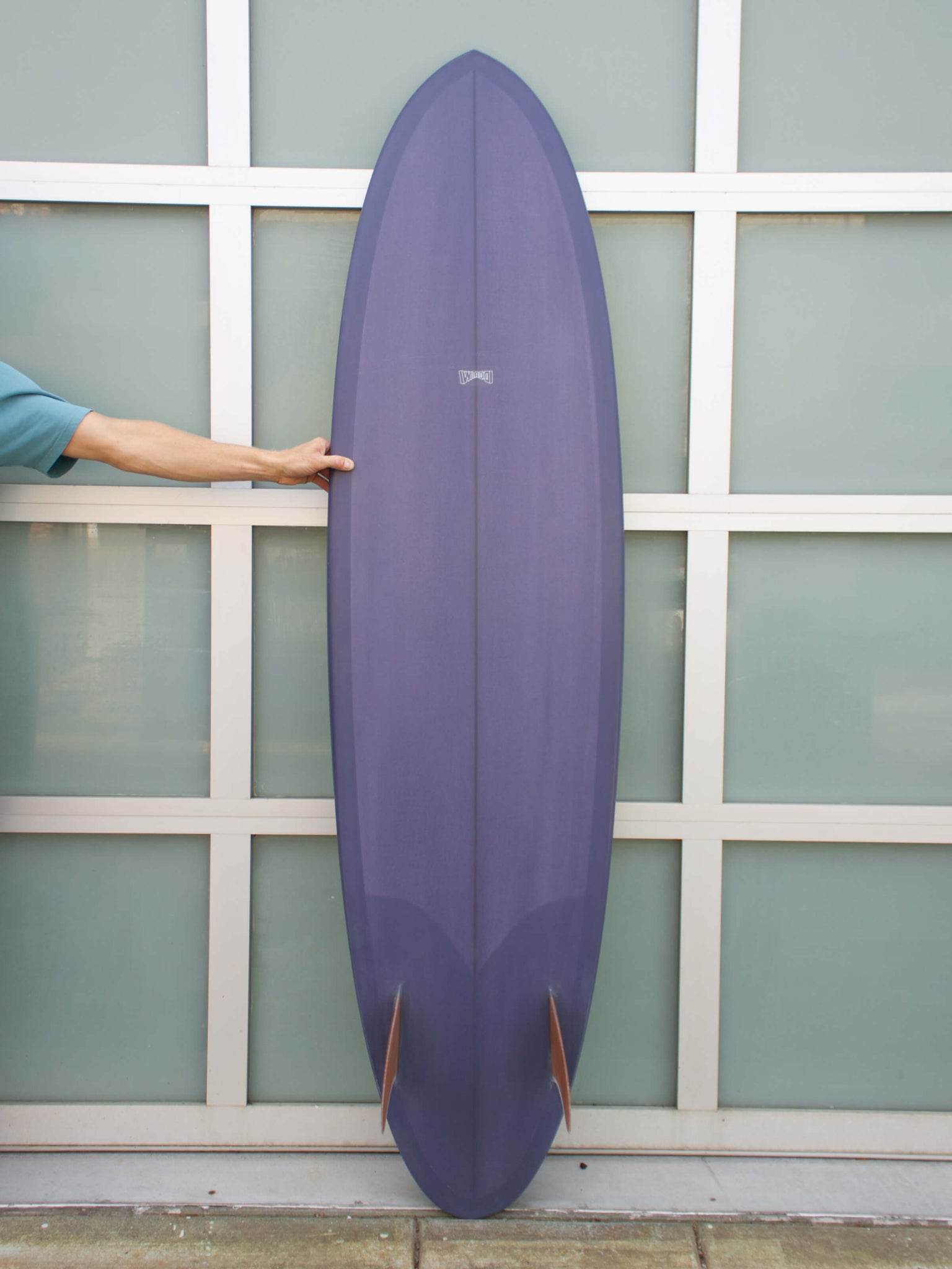 This beautiful twin pin has a vee bottom and marine-ply glass-on fins. Handmade in Ventura, California.