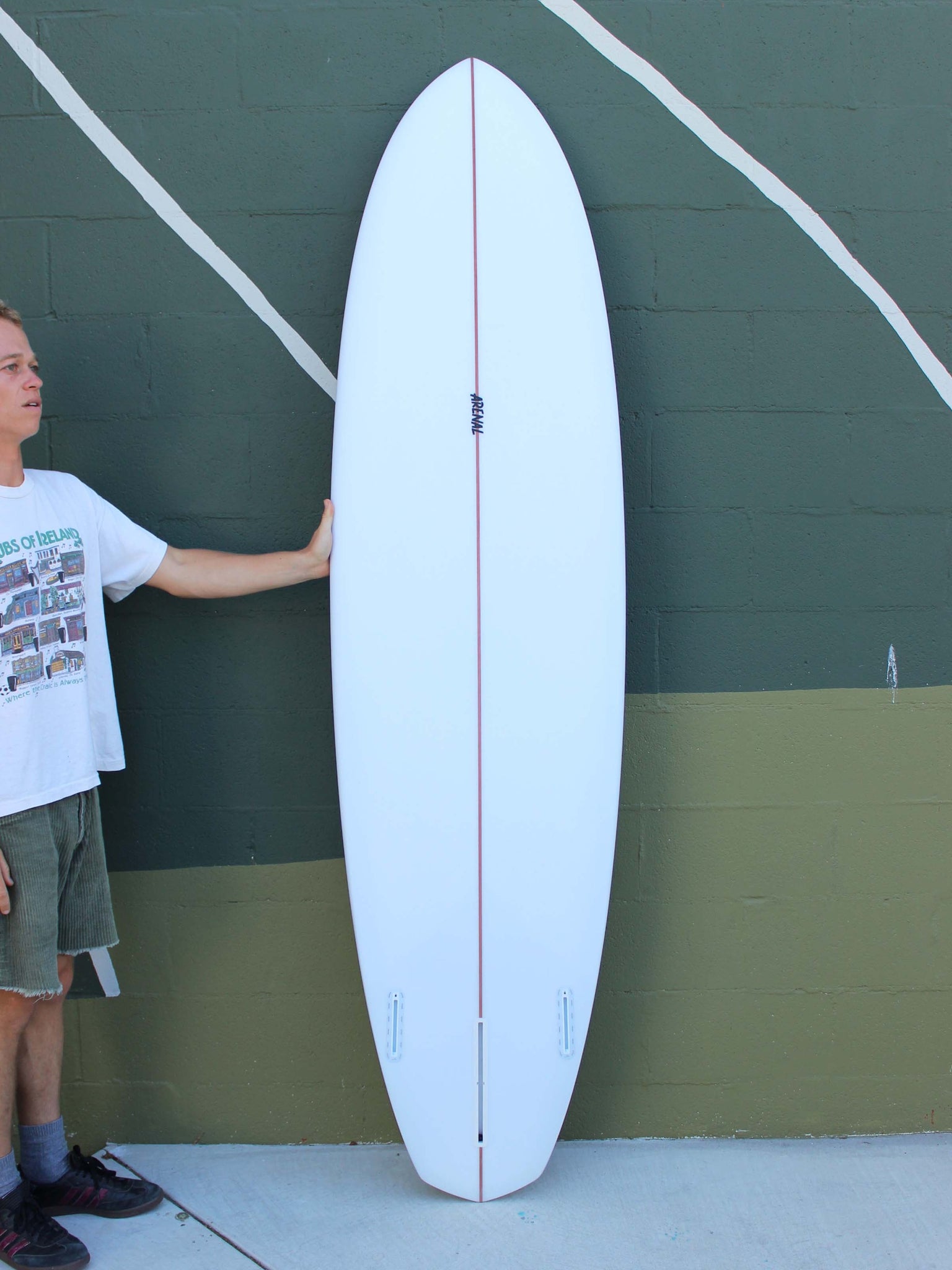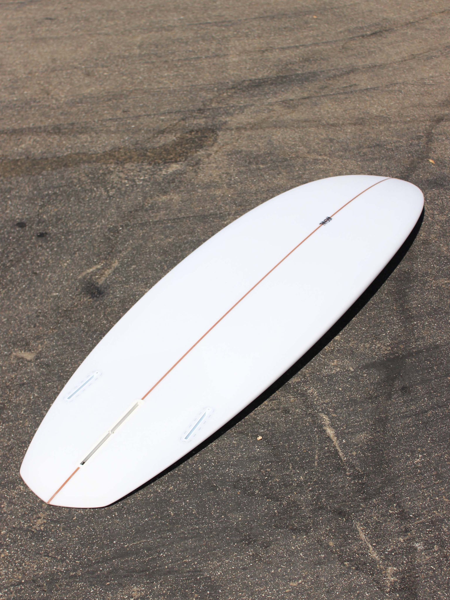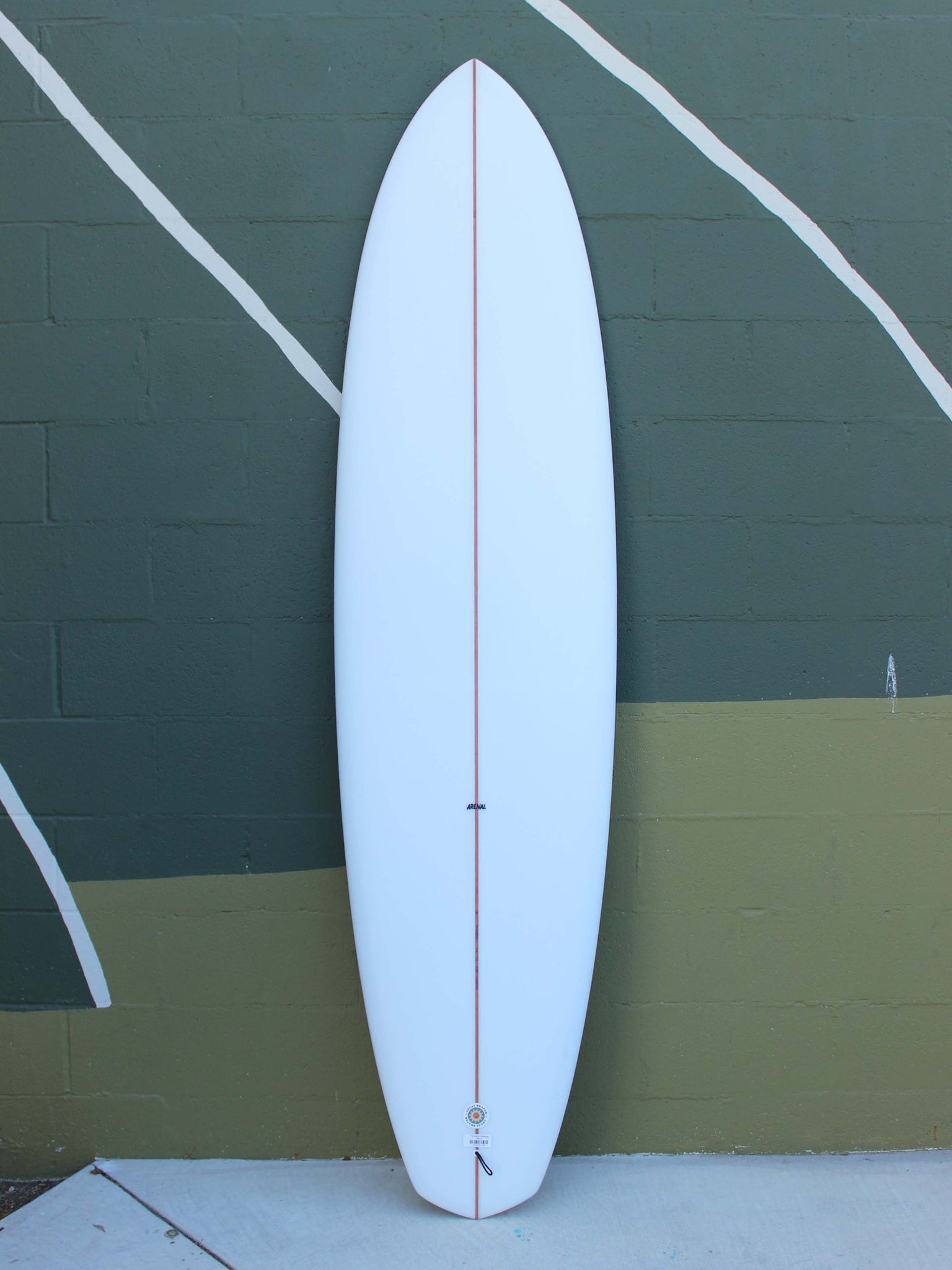 A midlength with a yearning for speed and to be driven hard off the bottom with flowing S-carves to round it out. Features a forward wide point, low flowing rocker and foil, and a moderately foiled rail going from soft in the nose to progressive in the tail. The shape works well for those wanting some easy clean surfing with some extra spice sprinkled in. Designed with single fin, 2+1, and twin fin set ups in mind. This board is the gateway drug to your midlength addiction.