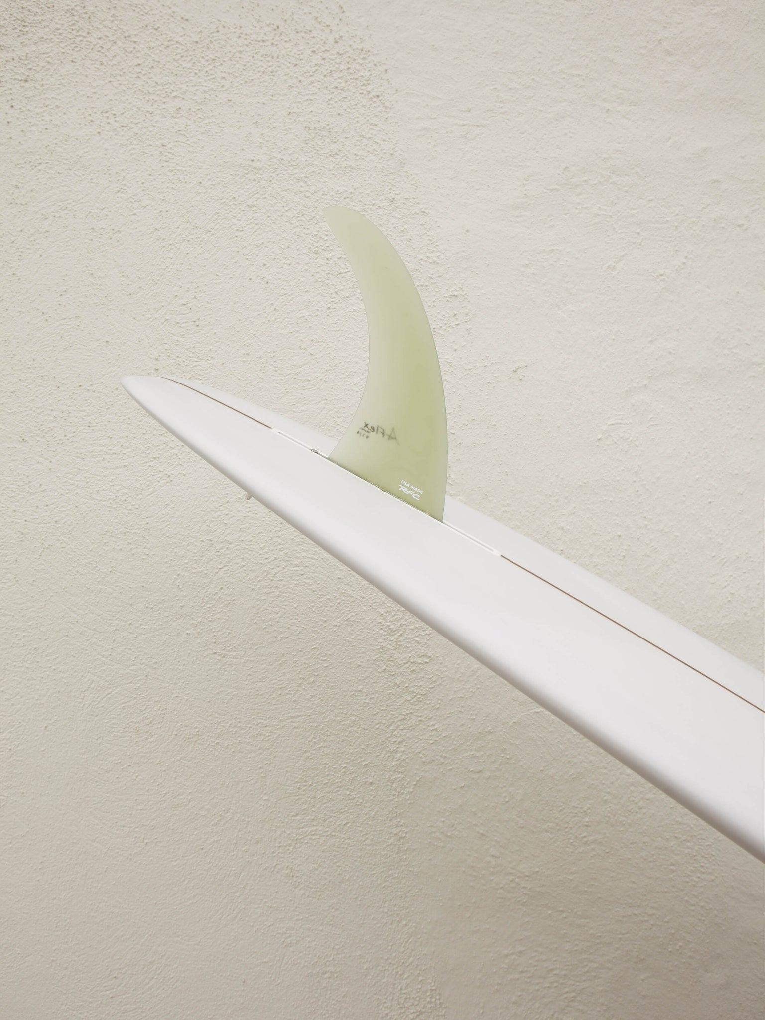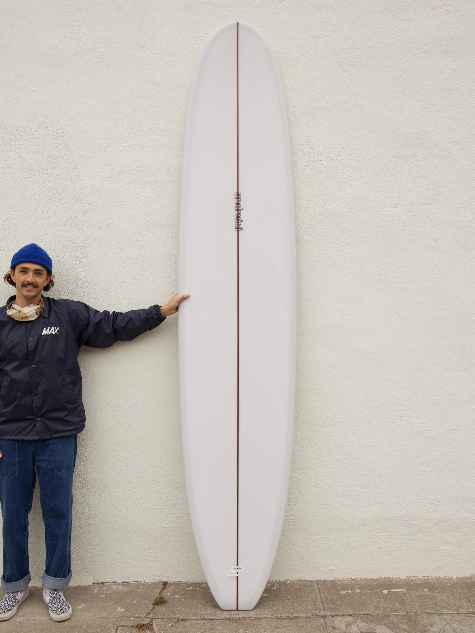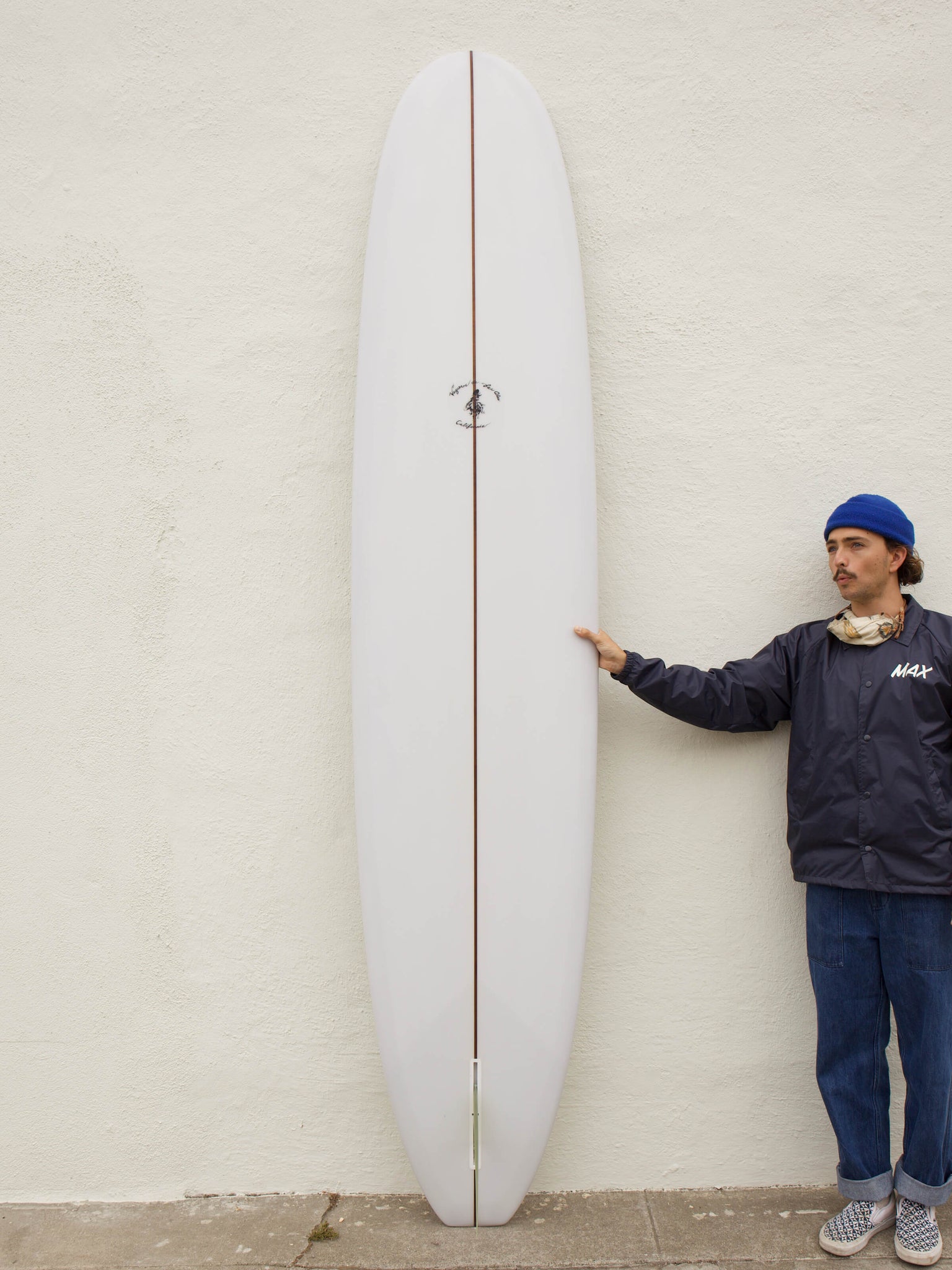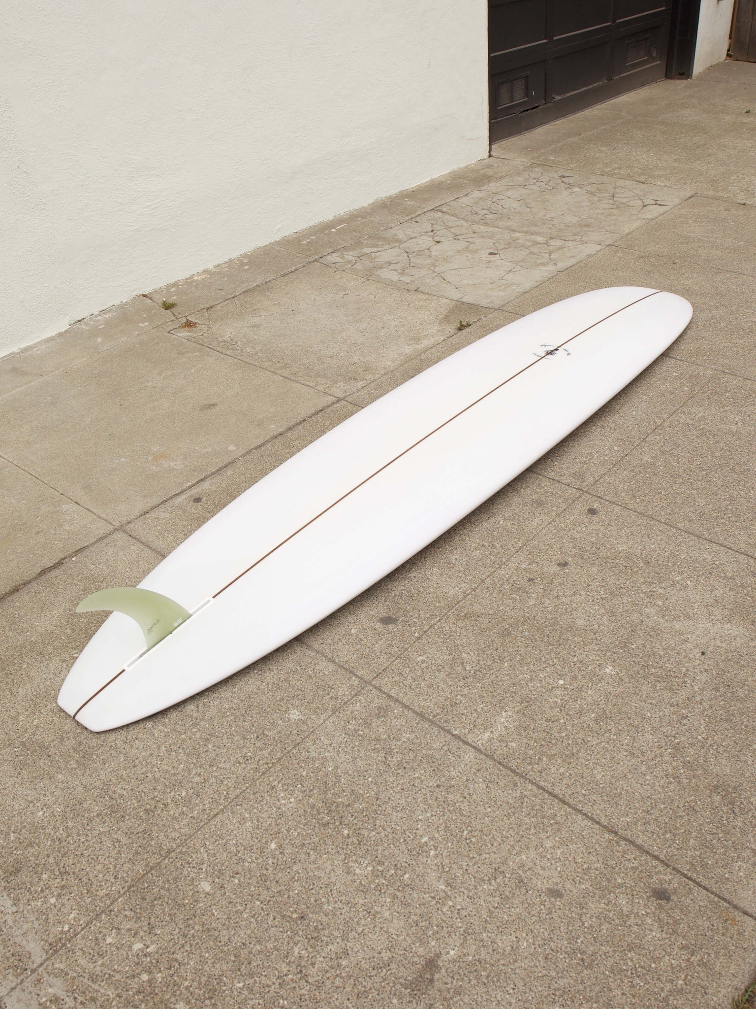 Standard longboard from 1966 inspired by Nat Young’s Sam. Wide point center. Low rocker. Lifted rails. Rolled bottom into vee in tail. Soft tucked under edge in tail. Best in all around longboard surf year round.