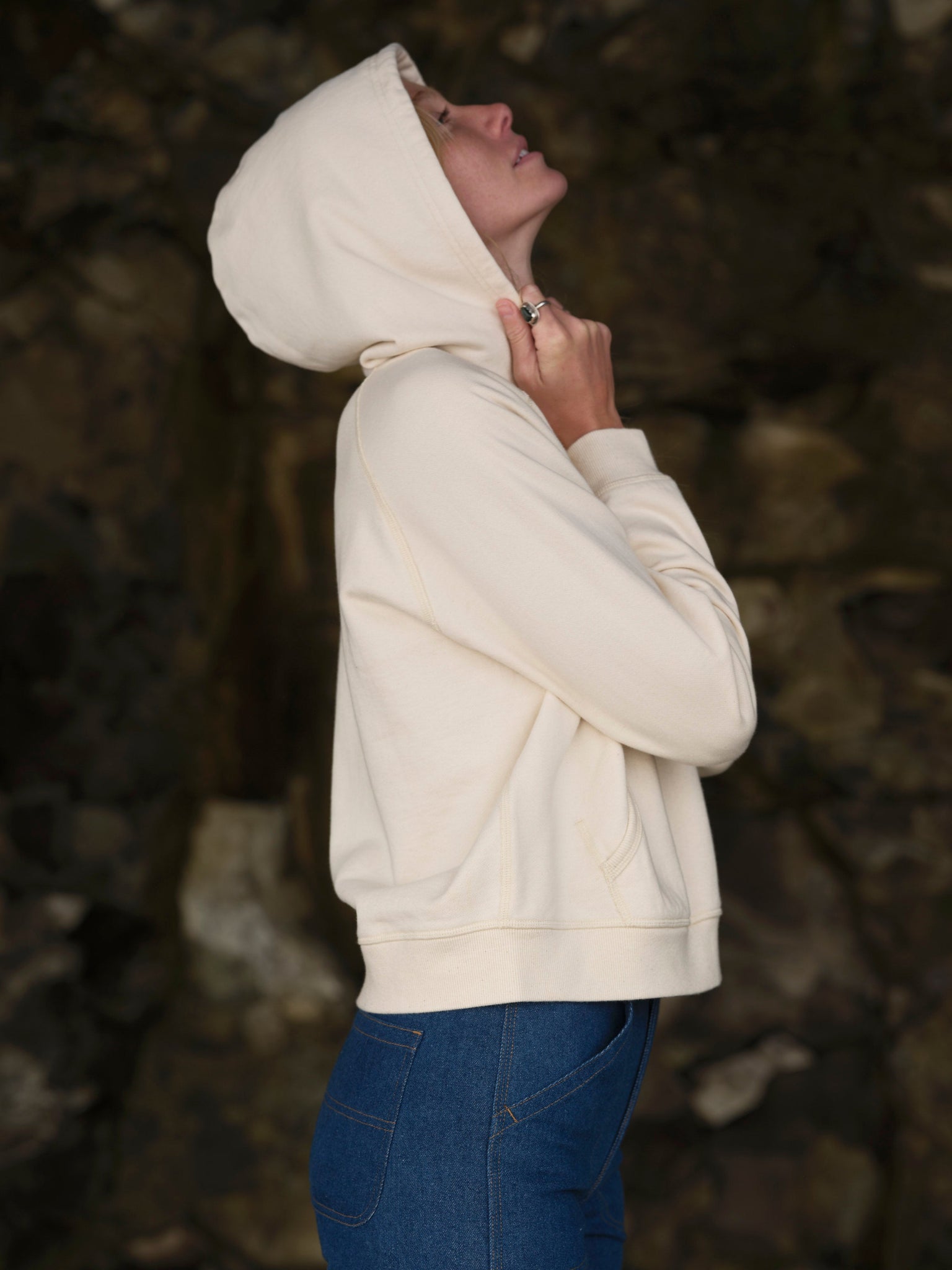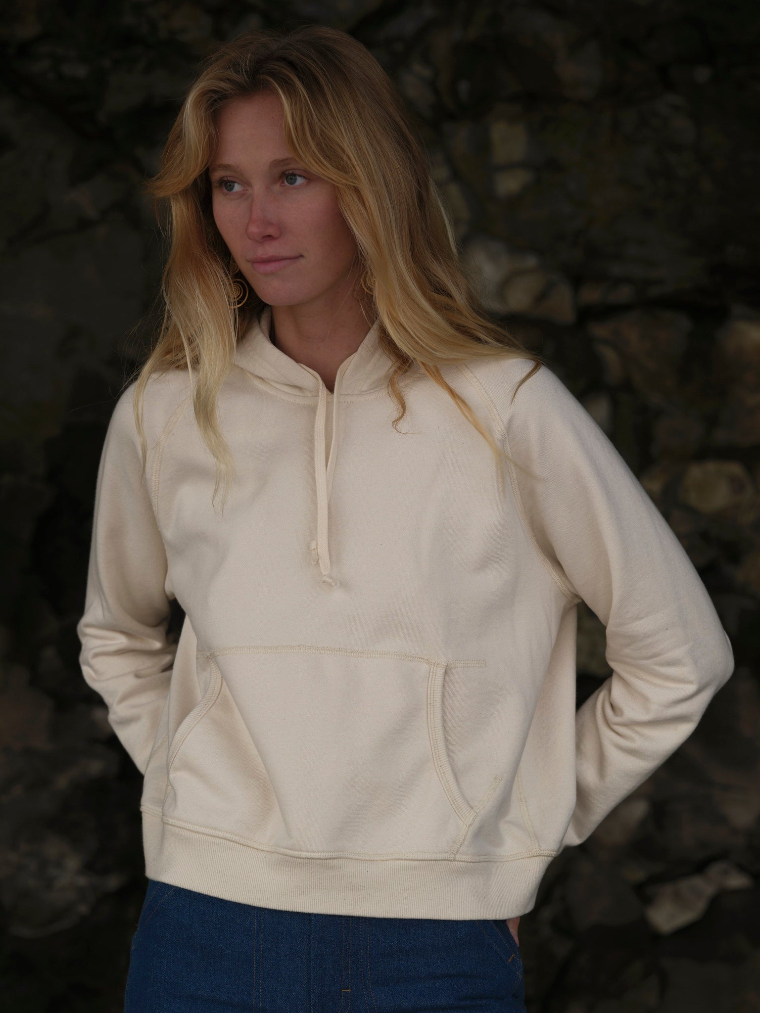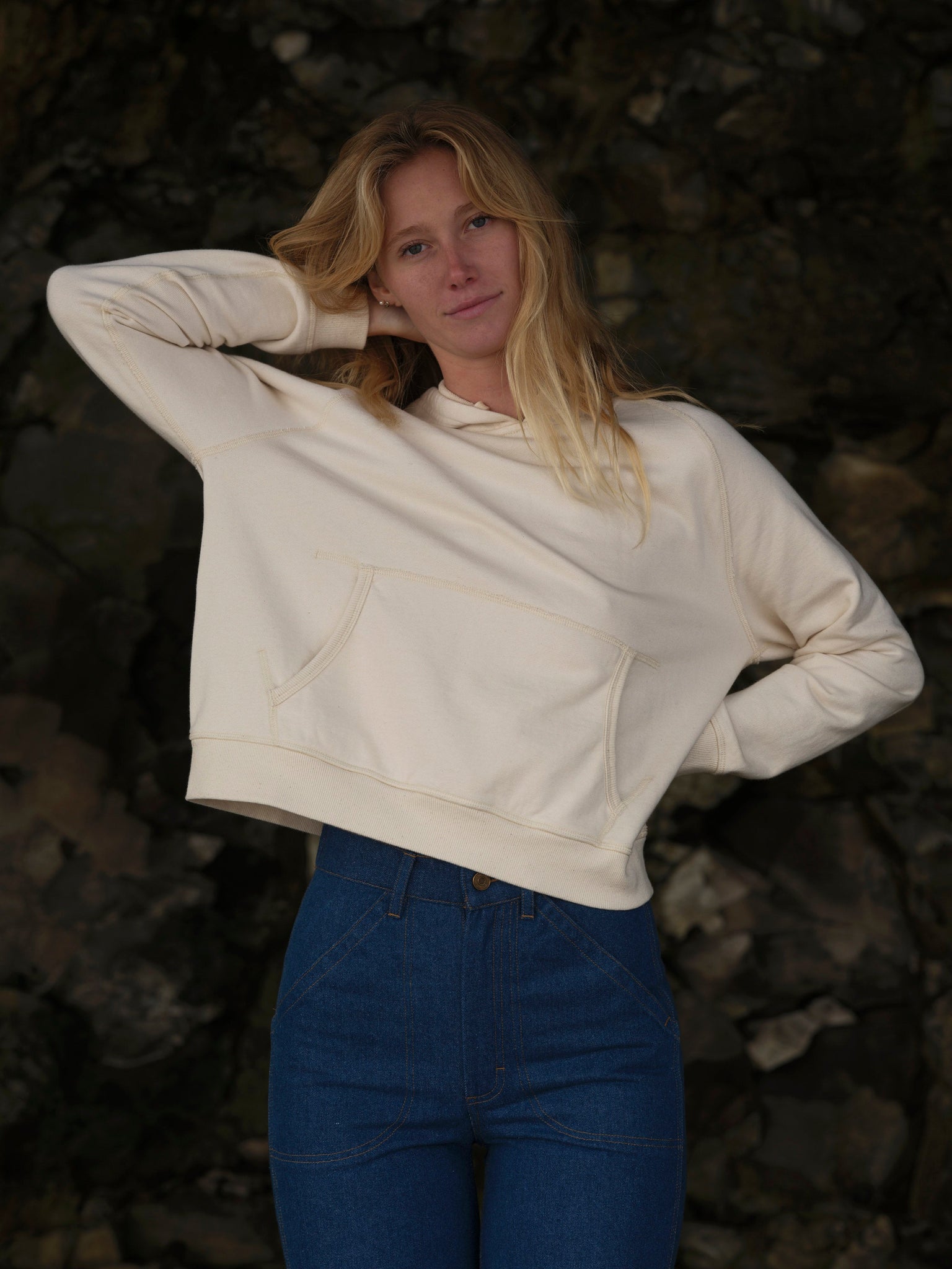 A roomy hoodie in our heaviest french terry. Cozy! India is 6' tall and wearing size XS.