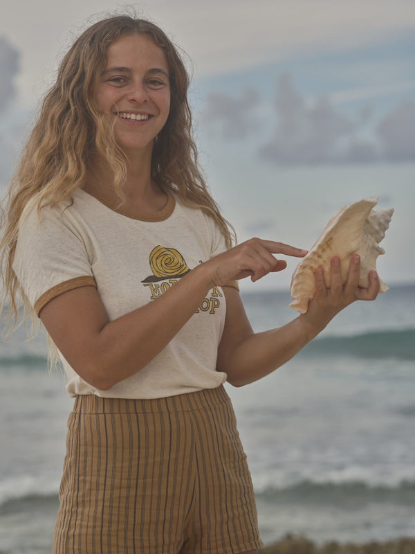 Express yourself in this 70's inspired tee with contrast binding. It has a hint of scoop in the neckline and it's long enough to tuck in. With a classic Mollusk graphic by Nat Russell.
